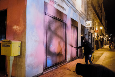Activists from the Extinction Rebellion Nantes movement covered the facades of a Crédit Agricole branch with paint and Stop Eacop tags, to protest against the bank's financing of Total's activities through its subsidiary Amundi.