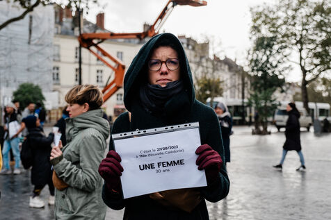 Die-in by Nous Toutes in tribute to the victims of feminicide in Nantes, 4 November 2023. The activists listed the first names of the victims, their ages, the date and location of the feminicide, and then observed a minute's silence.