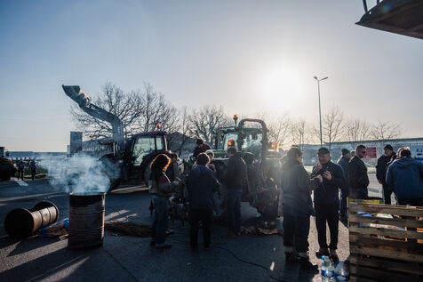 Plusieurs dizaines d'agriculteurs de la Confédération paysanne 44, du CIVAM 44 et du GAB 44, avec environ 35 tracteurs, bloquent près de Nantes la centrale d'achat SCA Ouest de l'enseigne de grande distribution Leclerc depuis lundi 29 janvier au soir.