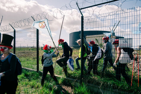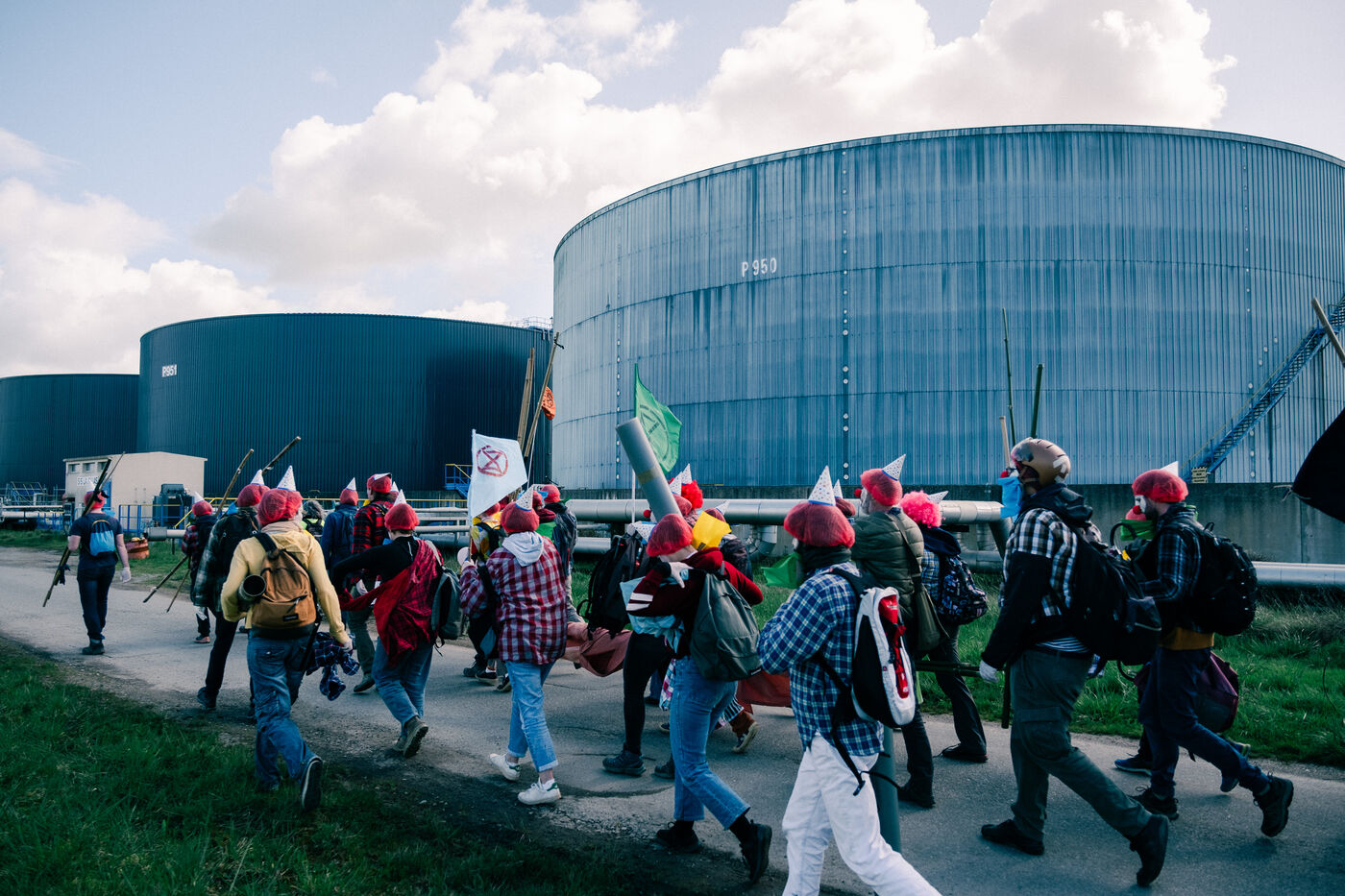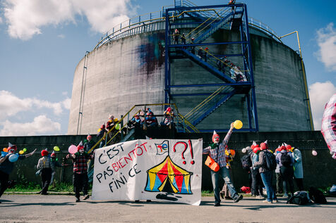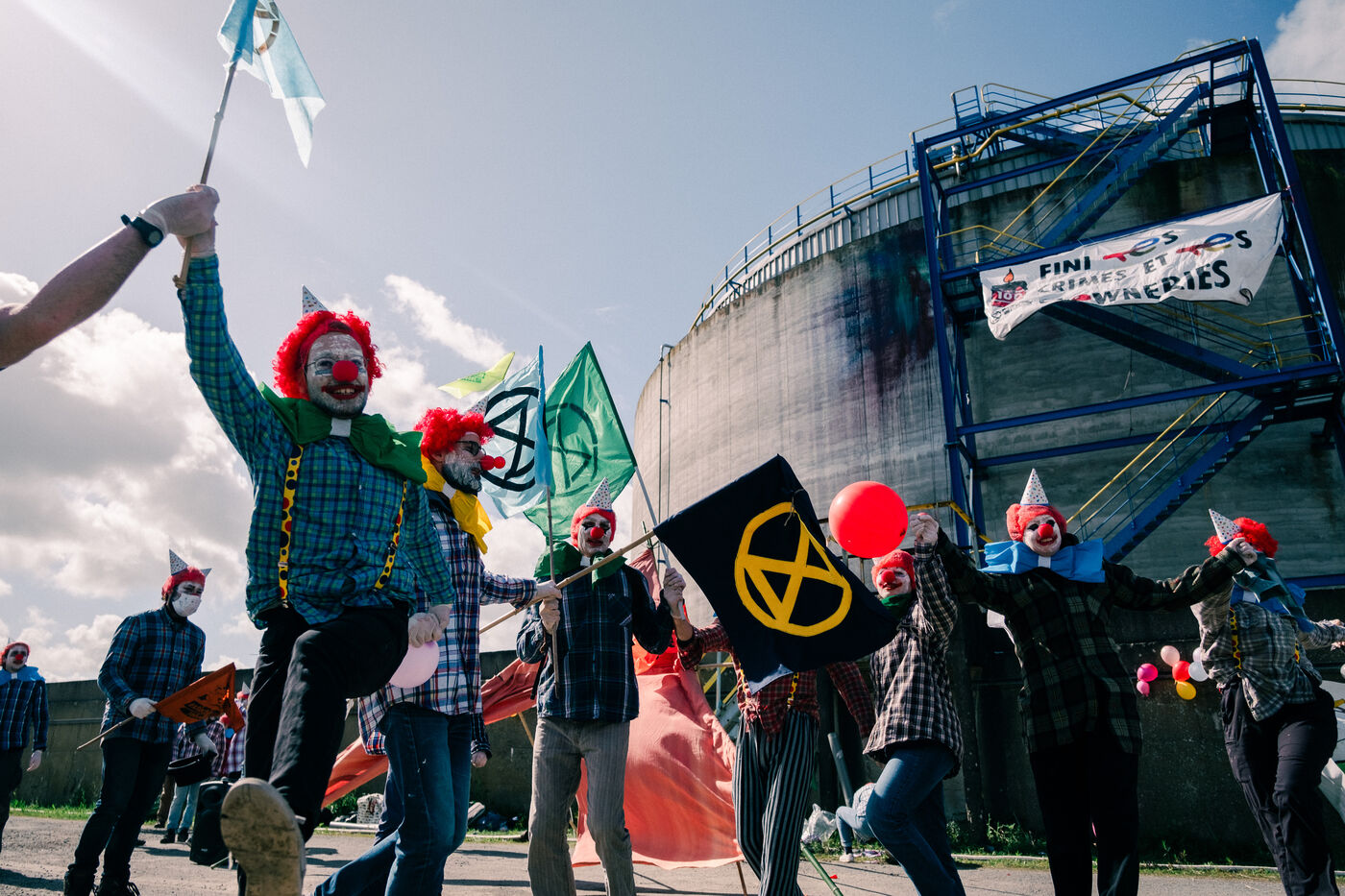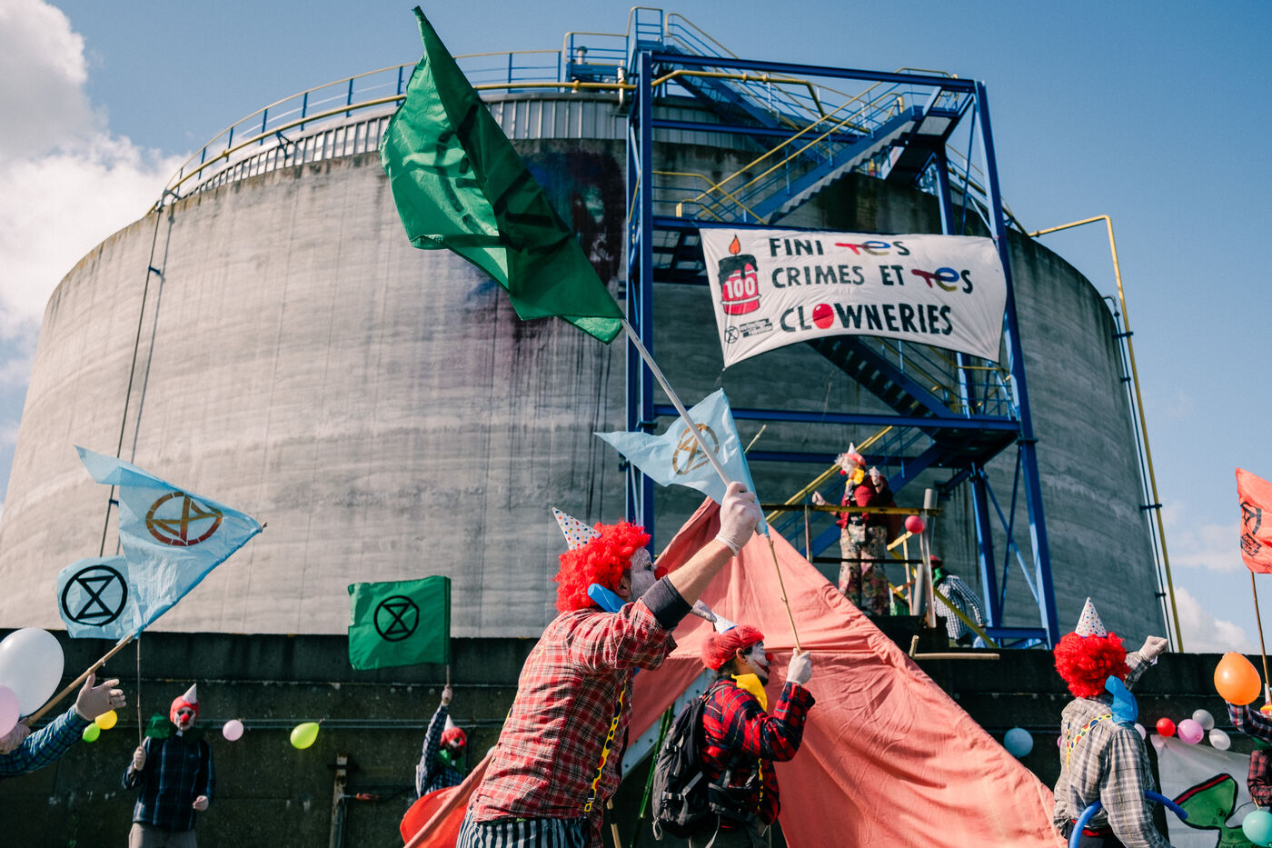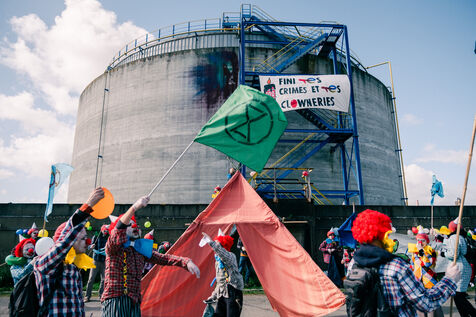 Extinction Rebellion fête les 100 ans de Total à la raffinerie de pétrole de Donges le 23 mars 2024. Plus de 50 activistes venus de Nantes et de toute la France se sont facilement introduits sur le site classé Seveso seuil haut de la deuxième plus grande raffinerie de France. Déguisés en clowns, les activistes sont venus dénoncer les 100 ans de Total en montant un chapiteau de cirque au pied d'une cuve qu'ils ont aspergée de peinture (à l'eau), en chantant et en dansant, avant un die-in sous l'effet de (faux) pétrole renversé sur eux par un clown déguisé en Patrick Pouyanné, PDG de l'entreprise. La fête a repris dans une énergie joyeuse et toujours non-violente sous l'oeil d'employés de la raffinerie, puis les activistes sont repartis, accueillis à l'extérieur par la gendarmerie qui a mis une personne en garde à vue, libérée le soir même.