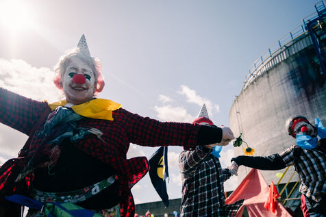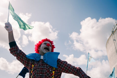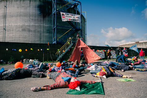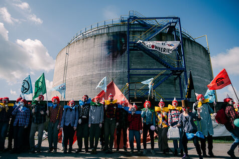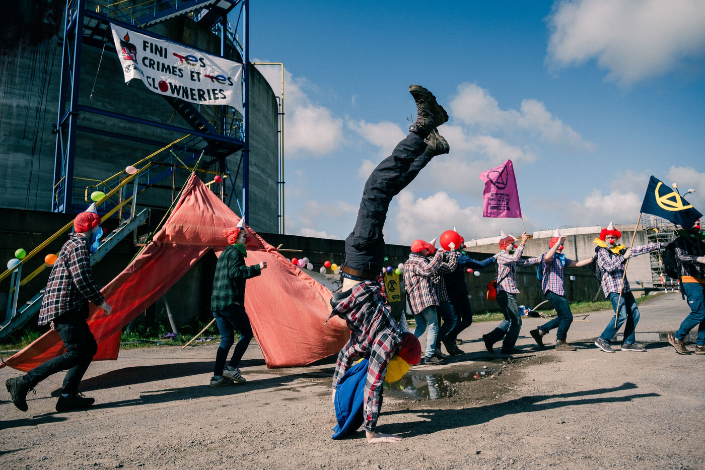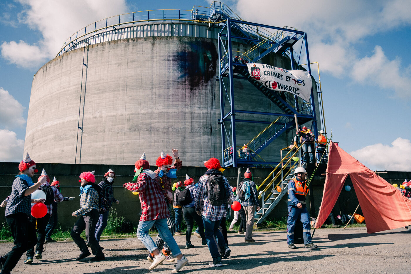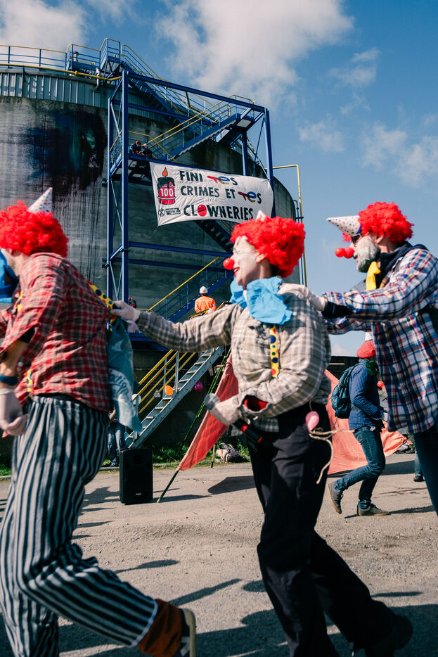 Extinction Rebellion celebrates 100 years of Total at the Donges oil refinery on March 23, 2024. More than 50 activists from Nantes and all over France easily took to the Seveso-classified site of France's second-largest refinery. Disguised as clowns, the activists came to denounce 100 years of Total by setting up a circus tent at the foot of a tank which they sprayed with (water-based) paint, singing and dancing, before a die-in under the effect of (fake) oil spilled on them by a clown disguised as Patrick Pouyanné, CEO of the company. The party resumed in a joyous, non-violent mood, watched by refinery employees, before the activists left, greeted outside by the gendarmerie, who took one person into custody, who was released the same evening.