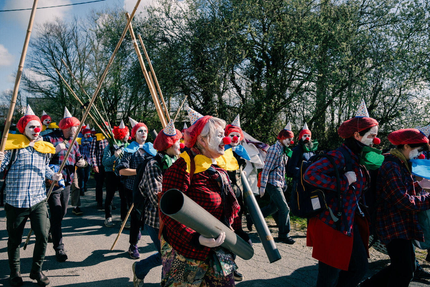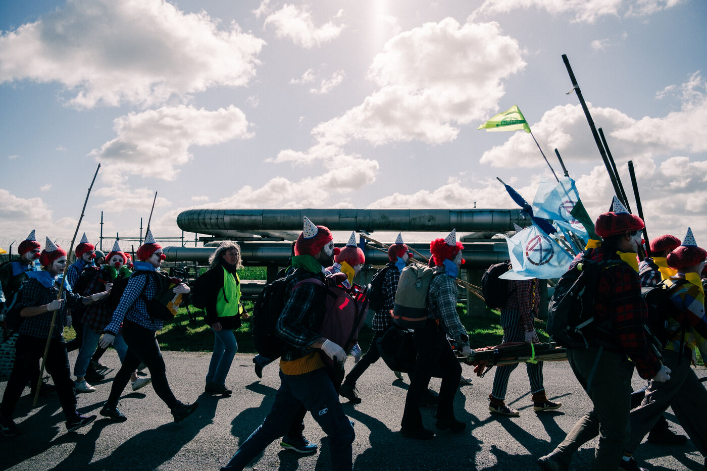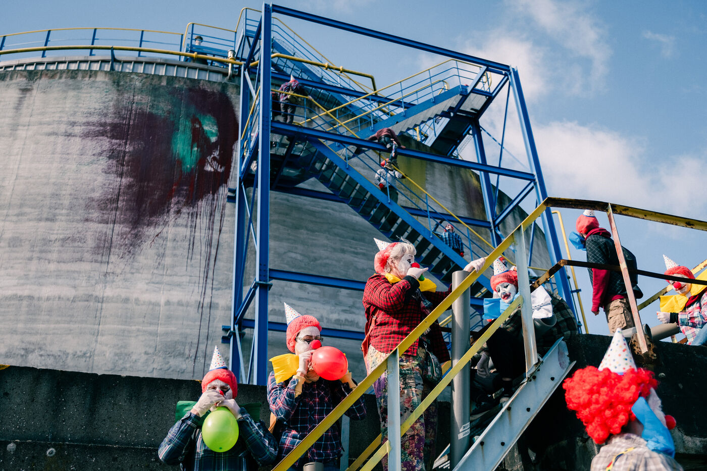 Extinction Rebellion celebrates 100 years of Total at the Donges oil refinery on March 23, 2024. More than 50 activists from Nantes and all over France easily took to the Seveso-classified site of France's second-largest refinery. Disguised as clowns, the activists came to denounce 100 years of Total by setting up a circus tent at the foot of a tank which they sprayed with (water-based) paint, singing and dancing, before a die-in under the effect of (fake) oil spilled on them by a clown disguised as Patrick Pouyanné, CEO of the company. The party resumed in a joyous, non-violent mood, watched by refinery employees, before the activists left, greeted outside by the gendarmerie, who took one person into custody, who was released the same evening.