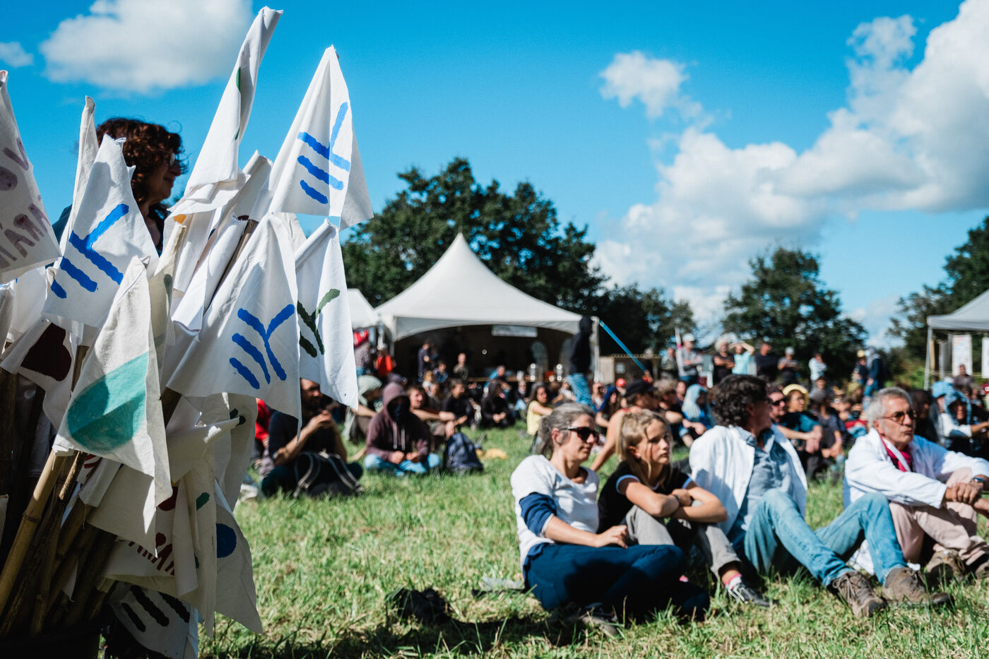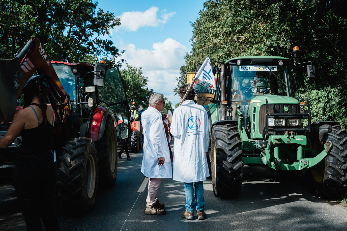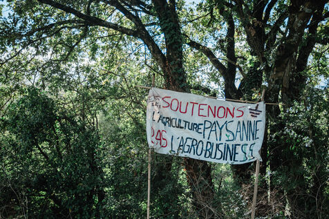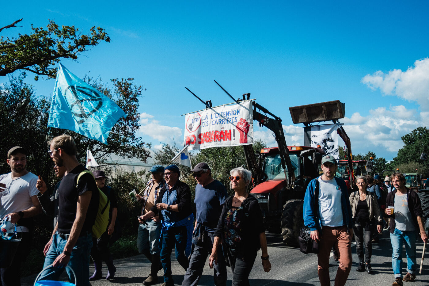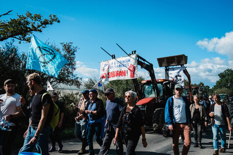 Demonstration in Saint-Colomban, south of Nantes, on September 28, 2024, by Soulèvements de la Terre (Earth Uprisings) and the local collective La tête dans le sable (Head in the sand) against the sand extraction industry, in particular the local GSM quarry and its planned extension, and Nantes' industrial greenhouse market gardening, which uses a third of this sand. Under heavy police surveillance, hundreds of demonstrators took sand from an industrial lamb's lettuce farm, grown in greenhouses on sand beds, and brought it back on tractors to be dumped at the entrance to the quarry from which it had been extracted.