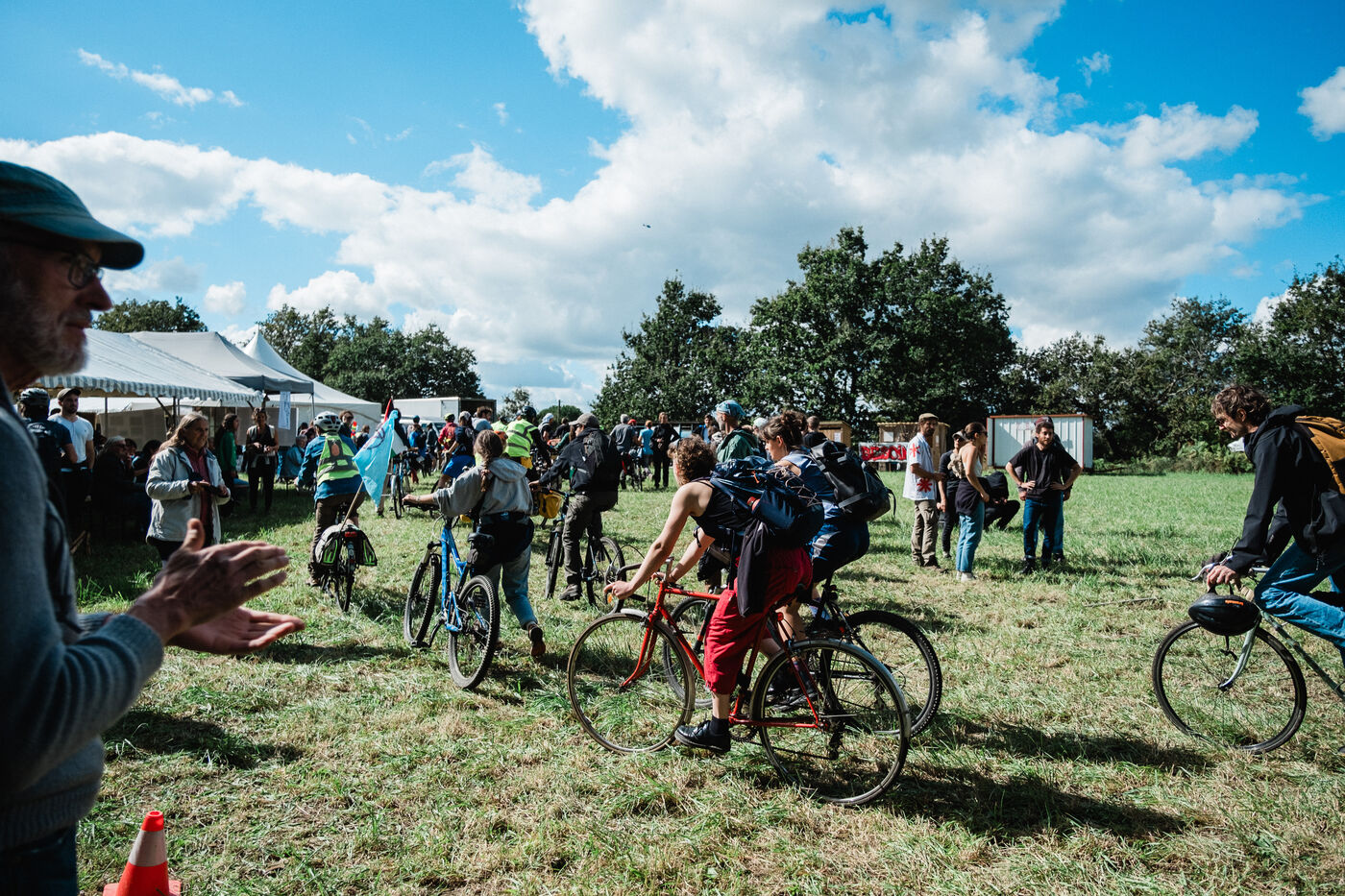 Manifestation à Saint-Colomban, au sud de Nantes, le 28 septembre 2024, des Soulèvements de la Terre et du collectif local La tête dans le sable contre l'industrie de l'extraction du sable, en particulier la carrière locale du groupe GSM et son projet d'extension, et le maraîchage industriel nantais sous serre, qui utilise un tiers de ce sable. Sous haute surveillance des forces de l'ordre, des centaines de manifestants ont prélevé du sable sur une exploitation industrielle de mâche, cultivée sous serres sur lits de sable, pour le ramener sur des tracteurs et le déverser à l'entrée de la carrière dont il a été extrait.
