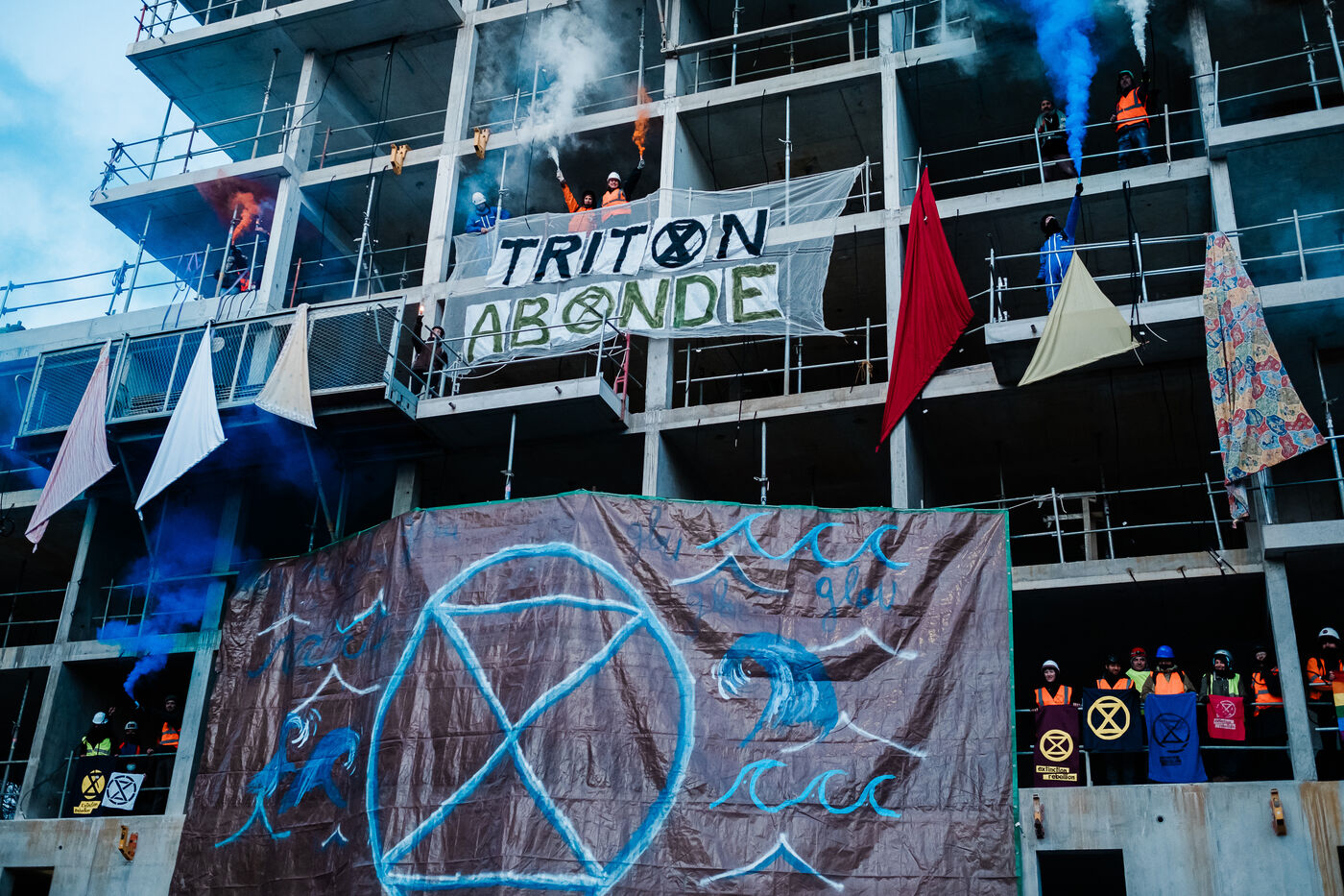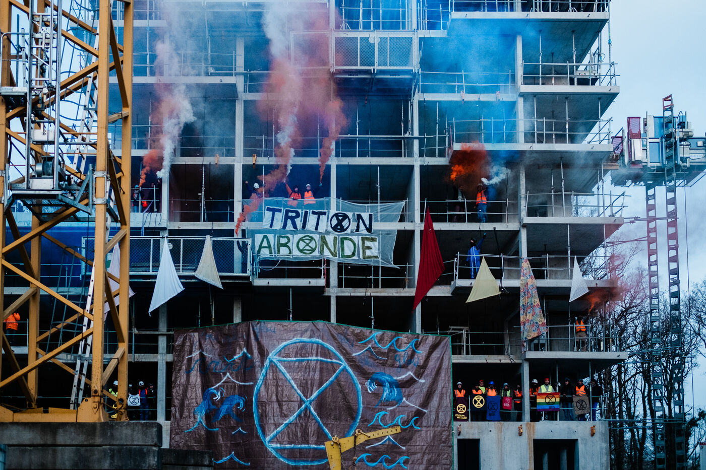 Action du mouvement écologiste de désobéissance civile non violente Extinction Rebellion sur un chantier de logements de la métropole de Nantes, le 13 décembre 2024, pour dénoncer la bétonisation et lutter contre l'artificialisation des sols et ses impacts sur le climat, les inondations et la destruction des espaces naturels et de la biodiversité.