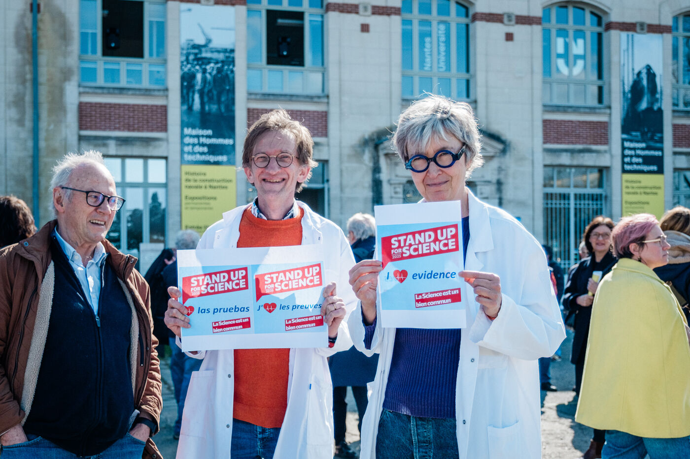 Rassemblement de 350 personnes pour le mouvement Stand up for Science, organisé par l'Université de Nantes, le 7 mars 2025, en soutien aux manifestations du même nom organisées le même jour à travers les Etats-Unis, pour défendre la recherche et les institutions scientifiques menacées de coupes budgétaires, censures et licenciements par l'administration Trump et le DOGE (département de l'efficacité gouvernementale) de Musk.