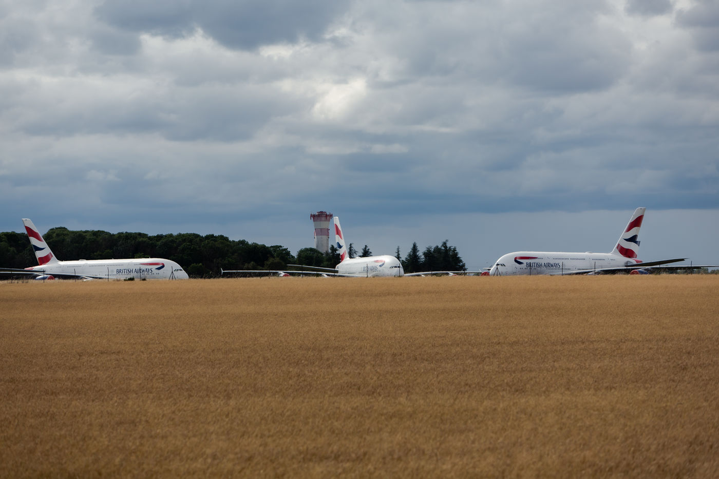 En raison de la baisse d activite lie a la COVID-19, la compagnie aerienne anglaise British Airways stock au sol, et pour une duree de six mois environ, 11 de ses avions A380 sur l aeroport Marcel Dassault de Chateauroux-Deols. Chateauroux, le 27 juin 2020