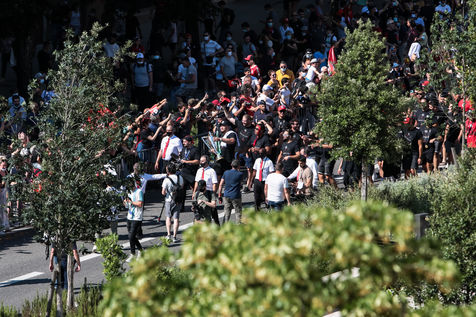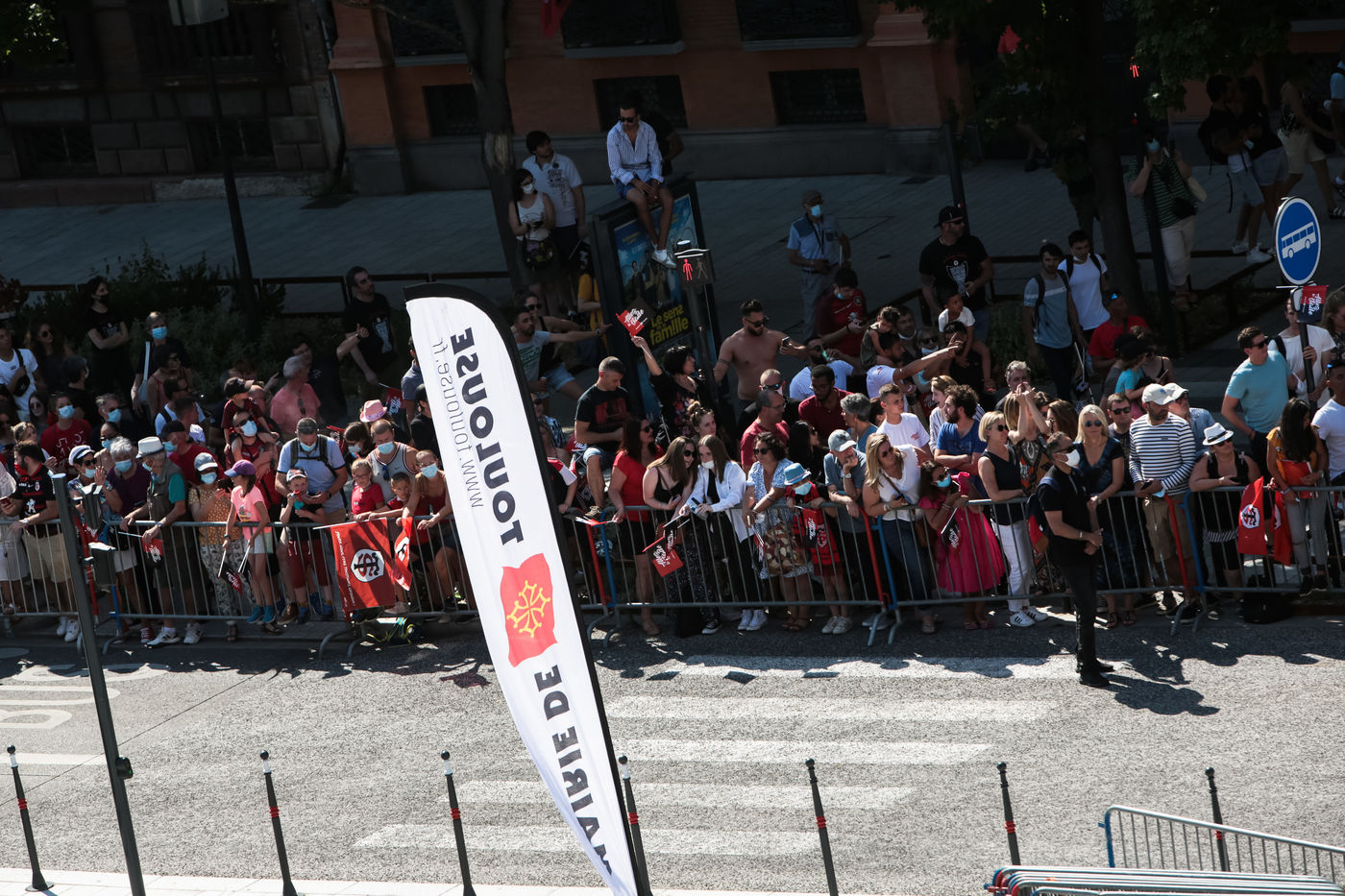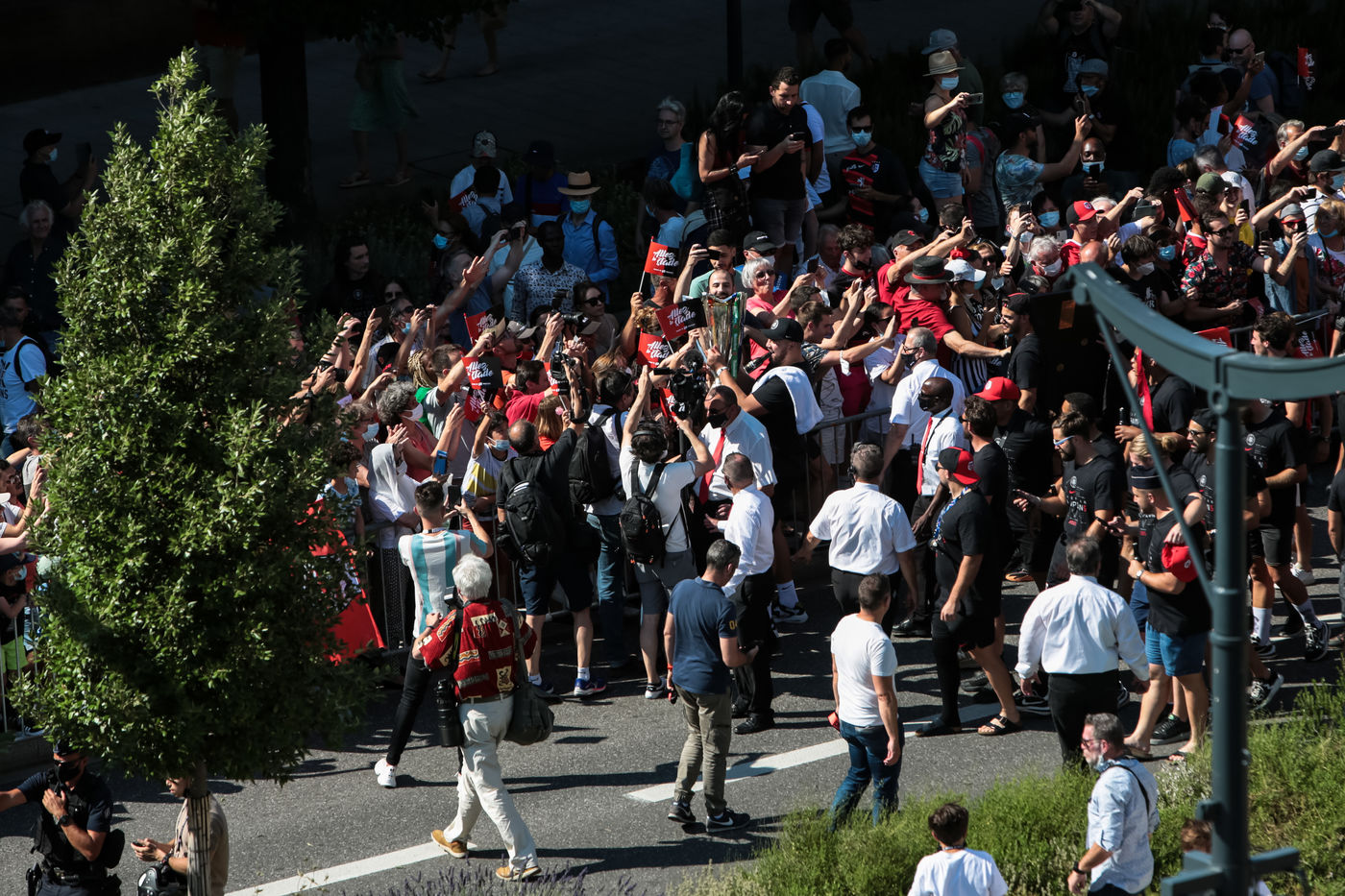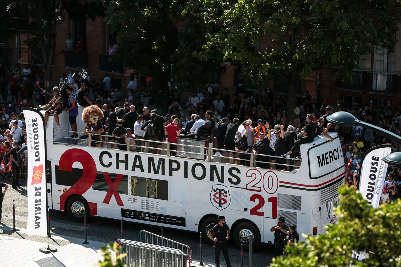 Les joueurs de rugby du stade Toulousain, vainqueurs cette annee de la coupe d Europe et du top 14, paradent dans les rues de Toulouse. Des supporters patientent le long des ramblas. Toulouse, France le 26 juin 2021.