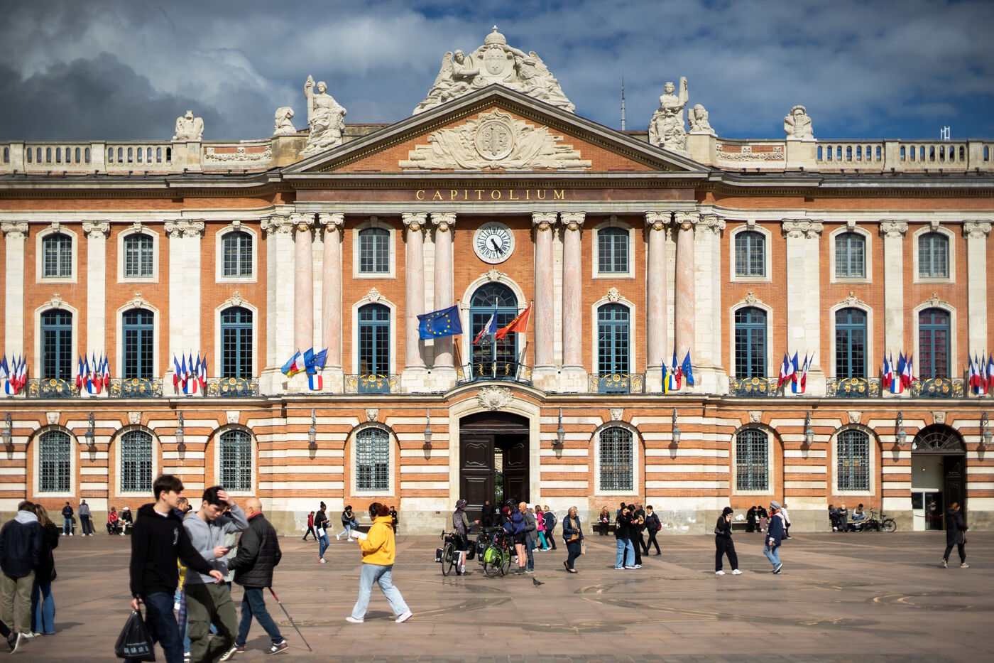 Illustration of the European flag flying next to that of France and the Occitanie region, on the wall of the Toulouse city hall, place de Capitole, on 11 May 2023