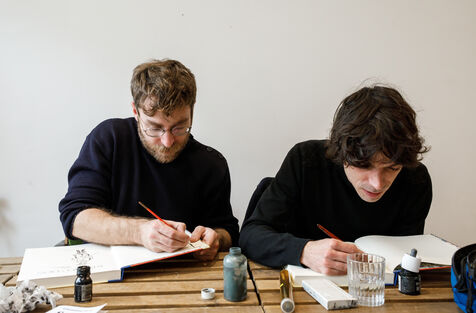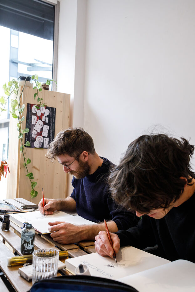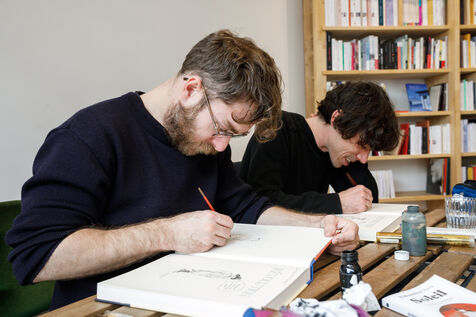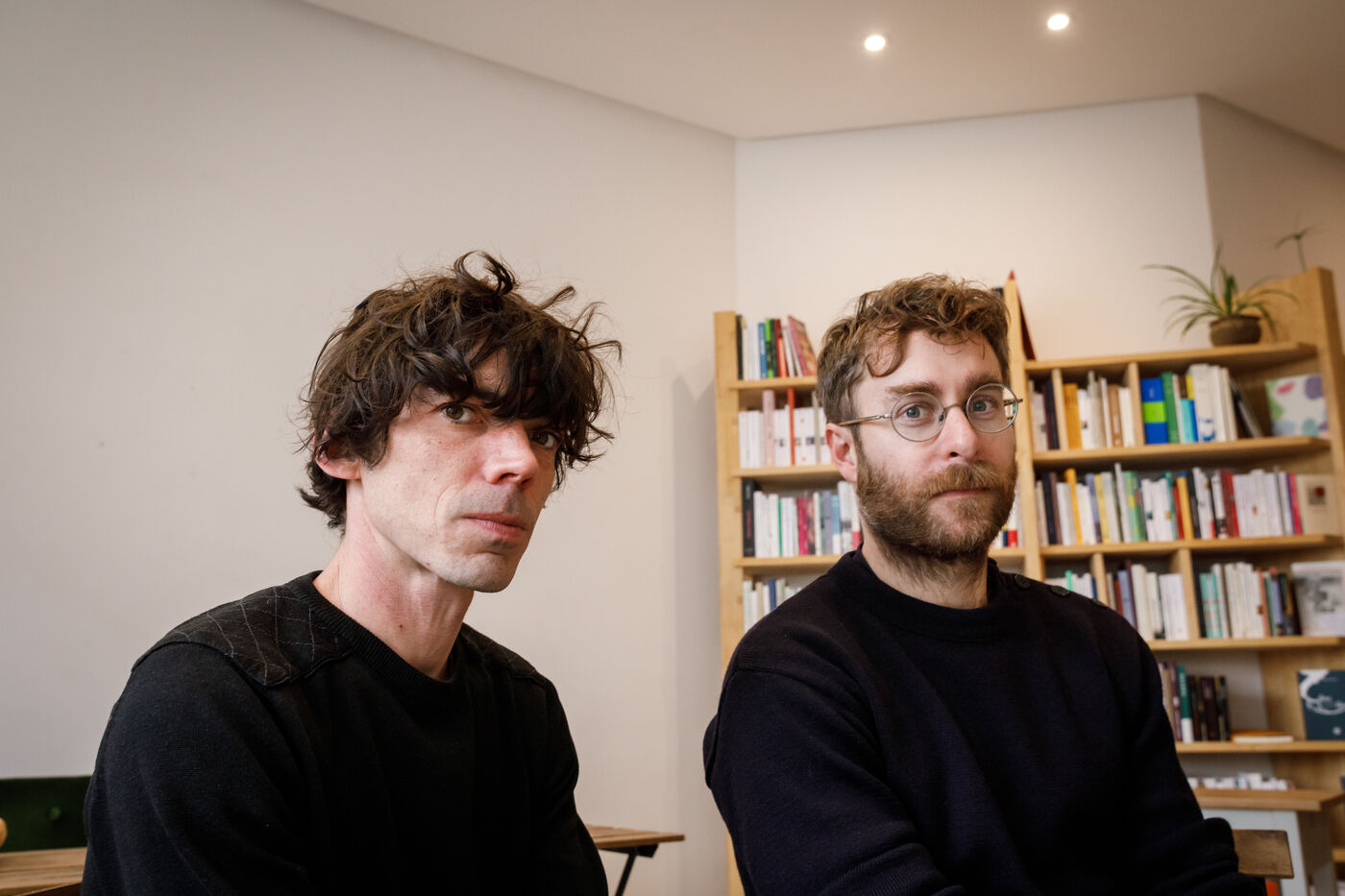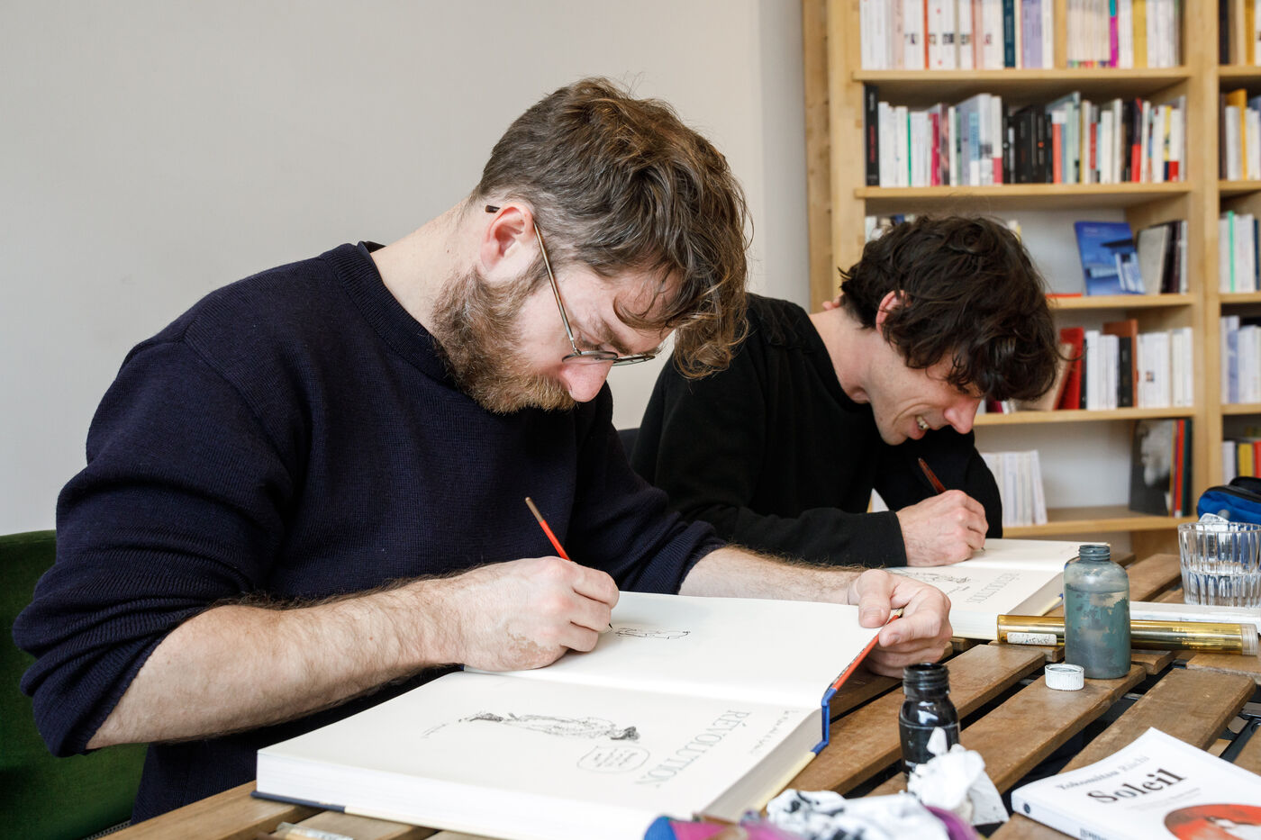Portrait des auteurs lorientais Younn Locard et Florent Grouazel lors d'une séance de dedicace à la librairie Fracas a Lorient, à l'occasion de la sortie du second tome de leur bande dessinée Revolution. Le premier tome, paru en 2019, a reçu le prix Fauve d'or du meilleur album au Festival d'Angoulême 2020.