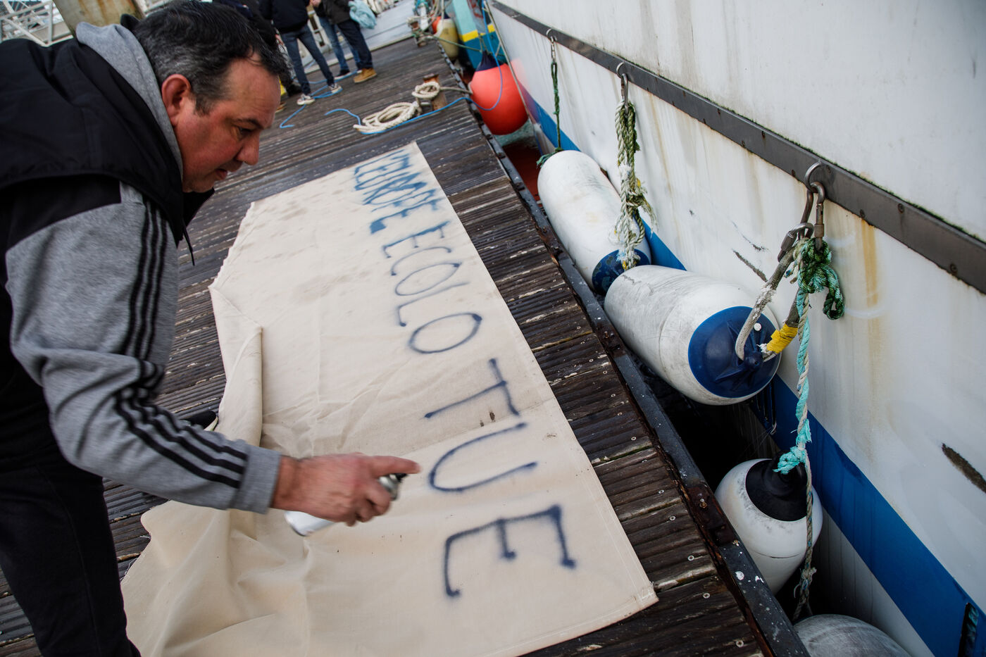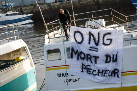 As of this Monday, fishing is banned in the Bay of Biscay for vessels over 8 metres long and carrying out certain types of fishing considered to be a risk for small cetaceans. At the Lorient Keroman fishing port, the netters are therefore all locked alongside the quayside for a month. On this first day of the ban, they are putting up banners on their vessels.
