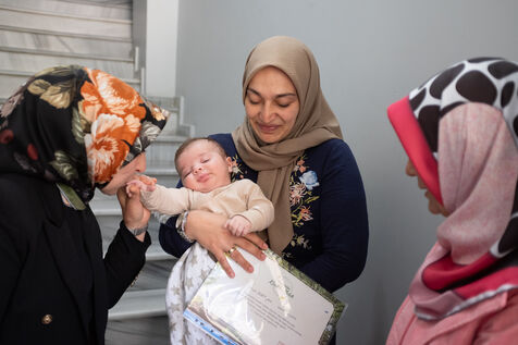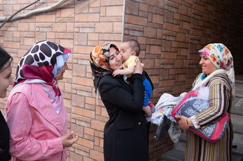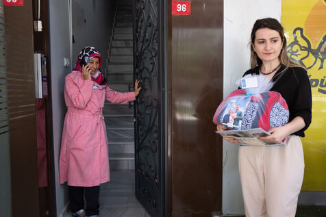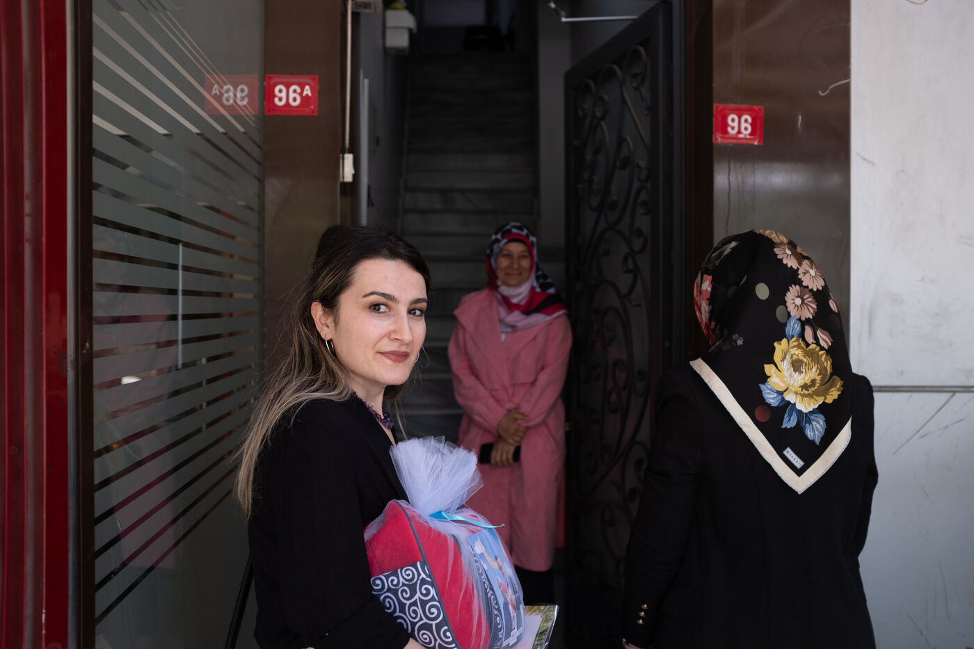 Women from the women's wing of Erdogan's party campaign all year round. In the aftermath of the general elections won in May 2023 by the incumbent president and his AKP party, the women of the women's branch of the Kasimpasa district, where Erdogan was born, are going door to door to thank their voters and give newborn babies presents. In the presence of the wife of the district mayor, Necibe Seyhan Yildiz, the head of the Beyoglu women's section, Sengul Kazanir, visites young mothers together to hand out a certificate attesting that an olive tree had been planted in their child's name, and a birth bag with clothes for the newborn.