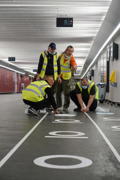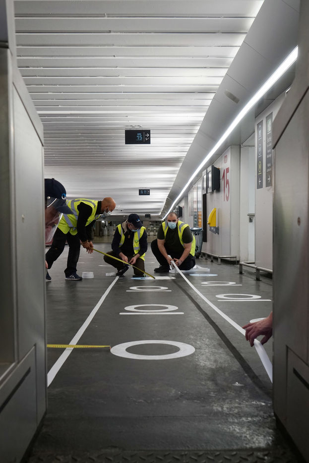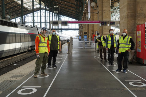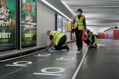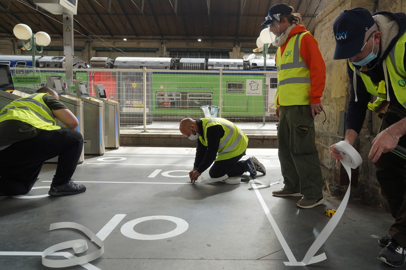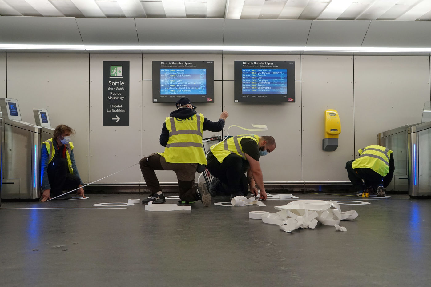 A few days before the deconfinement of 11 May, the company in charge of setting up a system to enforce social distancing in the station is putting down its last adhesives. They will have been working non stop for five days, getting the instructions only at the last minute.