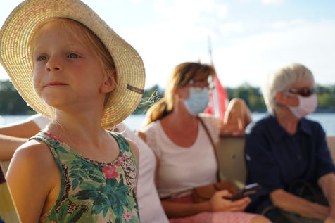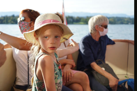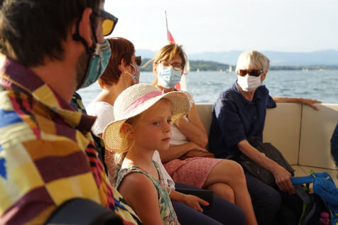 En ce début septembre à Genève il est obligatoire de porter le masque uniquement dans les transports (ici le bateau navette de Genève qui s'appelle la Mouette) et les lieux clos. Ainsi à l'extérieur la vie reste un peu la même qu'à la période hors pandémie.