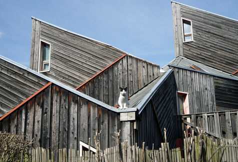 The result was this astonishing neo-medieval low-cost housing estate of pointed wooden houses stacked and interlocking with a large green space all around.