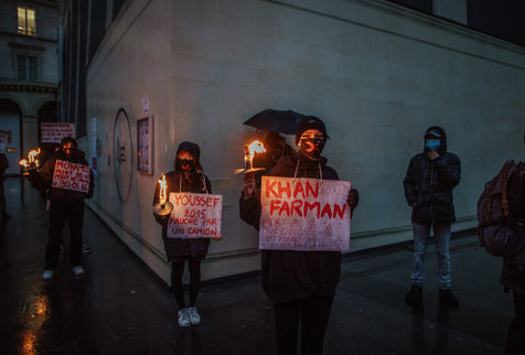 "Mohammed 2015, percuté par une voiture", "Ejaz tué d'un coup de couteau", "Yohanes, bébé mort"... Autant de prénoms et de causes de décès écrits en lettres rouges et brandis sur des pancartes par des dizaines de manifestants lors d'un rassemblement en hommage aux morts et aux disparus aux frontières, place du Palais Royal à Paris, dimanche 6 février 2022. A la tombée de la nuit les petits flambeaux illuminent les visages des manifestants venus à l'appel du collectif Actions Refugees Paris, organisatrice de l'évènement avec d'autres associations de solidarité avec les personnes exilées. Au cours du rassemblement, des prises de parole rendent hommages aux disparus. Cette commémoration dénonce aussi les politiques migratoires meurtrières qui coûtent la vie à des milliers de personnes chaque année. L'Organisation Internationale pour les migrations fait état de plus de 45 000 morts et disparus aux frontières depuis 2014. Elle met également en garde contre les drames massifs qui se banalisent. Une réalité visible à la frontière franco-britannique où on compte près de 350 morts depuis ces deux dernières décennies.