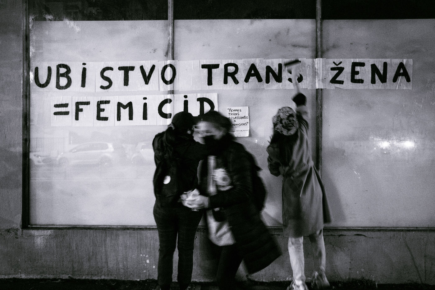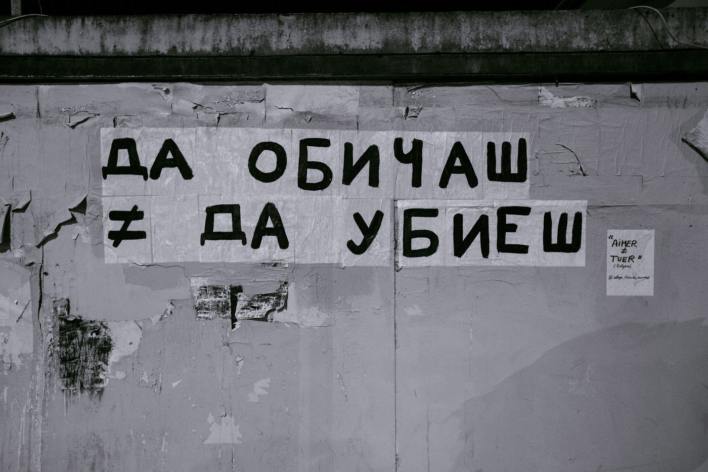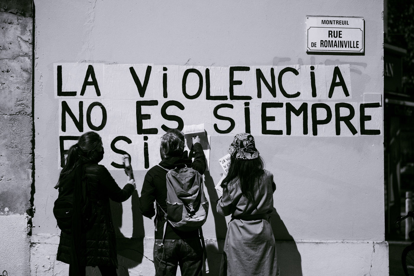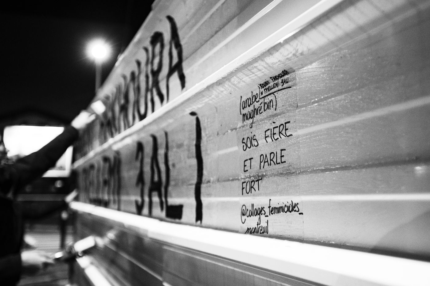 Session de collages contre les féminicides et contre les violences sexistes et sexuelles en plusieurs langues afin de rendre accessibles les slogans féministes.