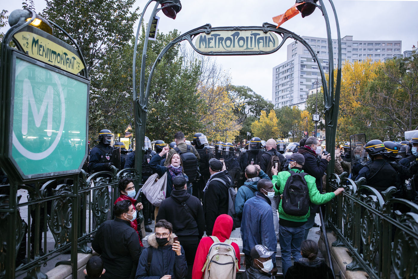 Aujourd'hui avait lieu un rassemblement pour protester contre le couvre-feu, son efficacité et ses effets liberticides. Ce rassemblement a été encerclé par les CRS et la BRAV. La police a menacé les manifestants en les encerclant et en les poussant dans le métro.