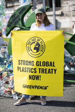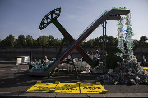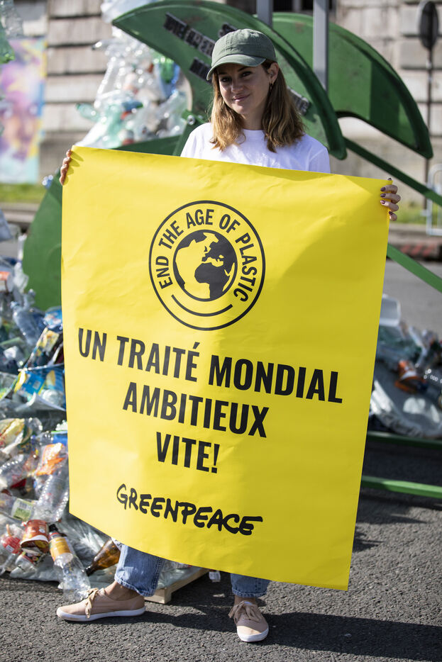 Greenpeace International unveils a giant art installation by Benjamin Von Wong in front of the Musée d'Orsay, in the run-up to the global plastics treaty negotiations.