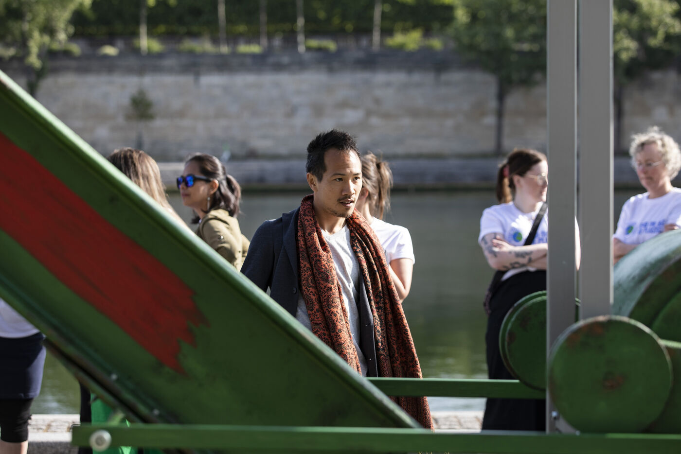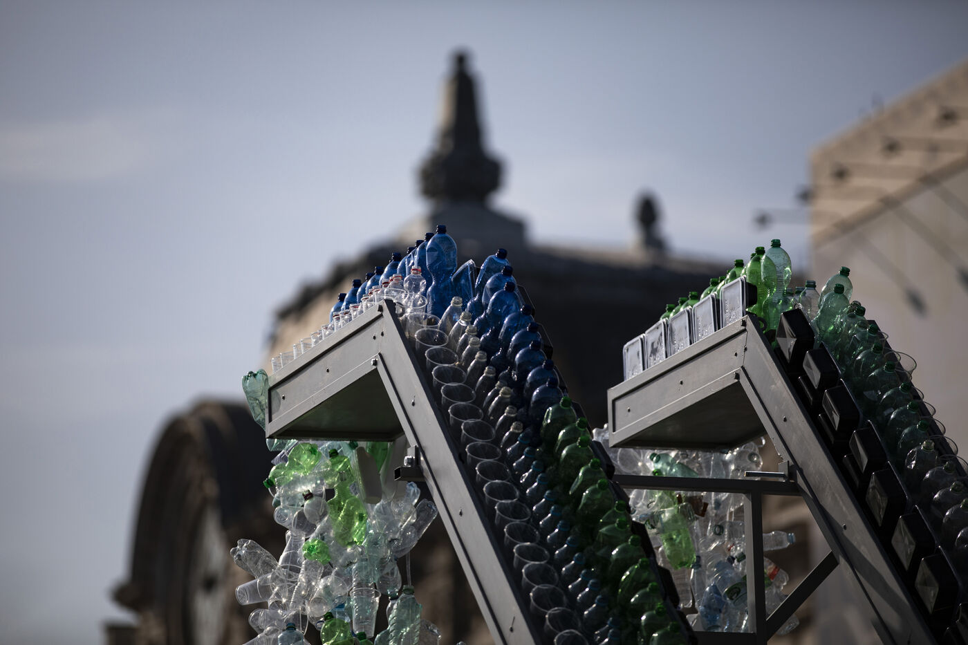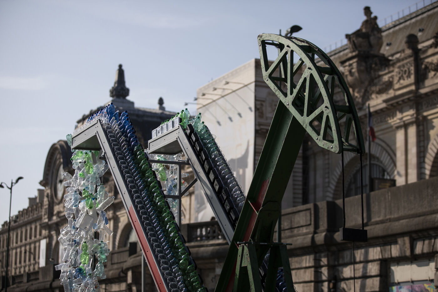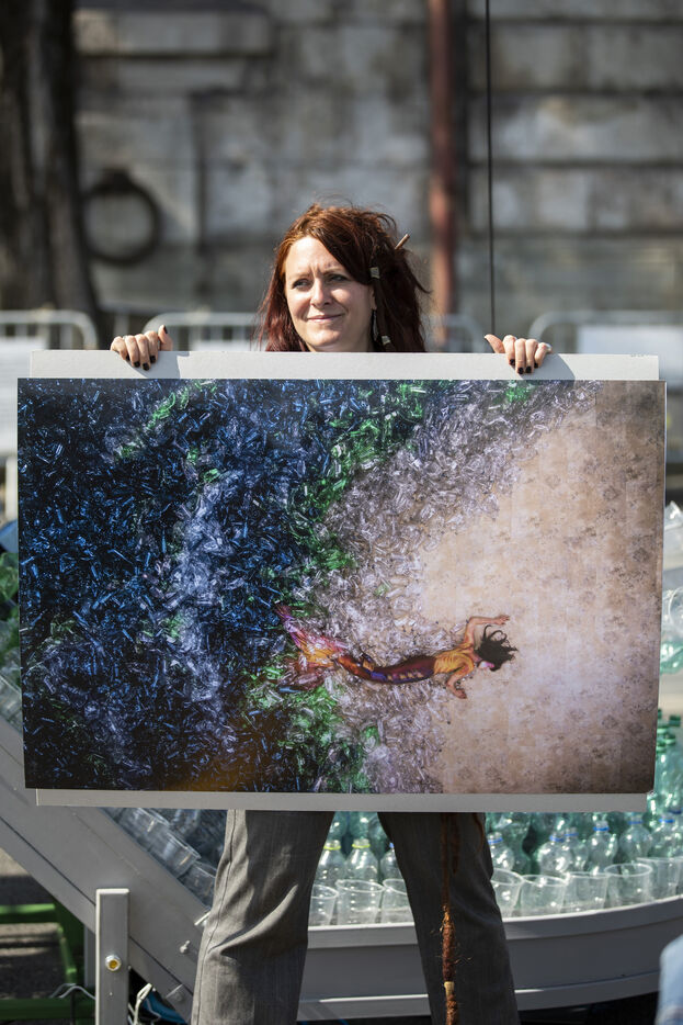 Greenpeace International dévoile une installation artistique géante de Benjamin Von Wong devant le musée d'Orsay, à l'approche des négociations sur le traité mondial sur les plastiques.
