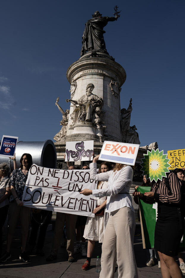 En marge du somment pour un nouveau pacte financier mondial, un rassemblement est organisé par plusieurs ONG pour demander la fin des financements fossiles.