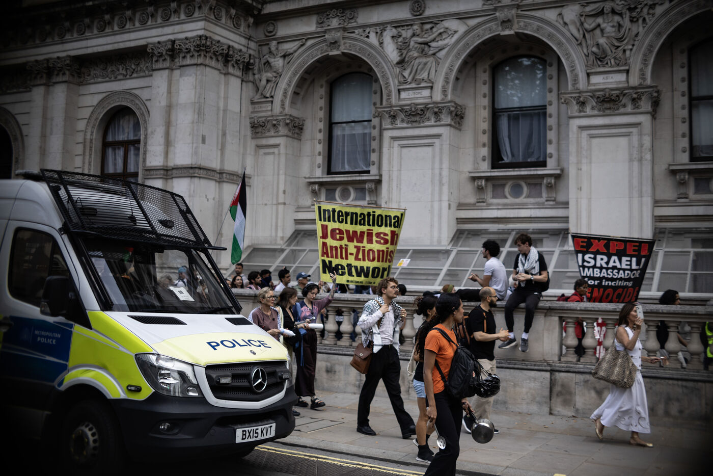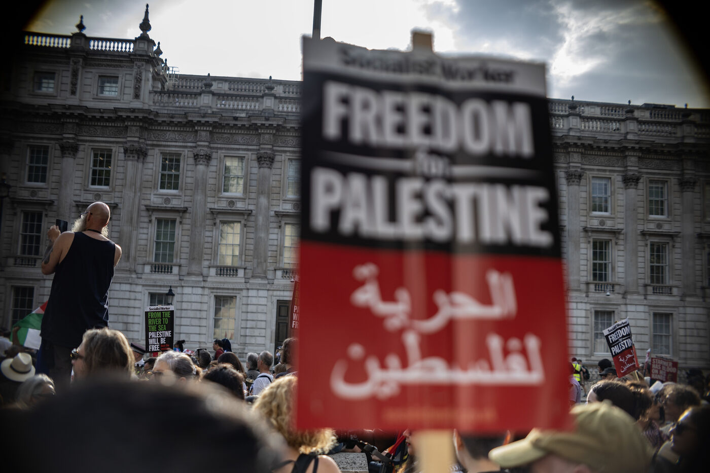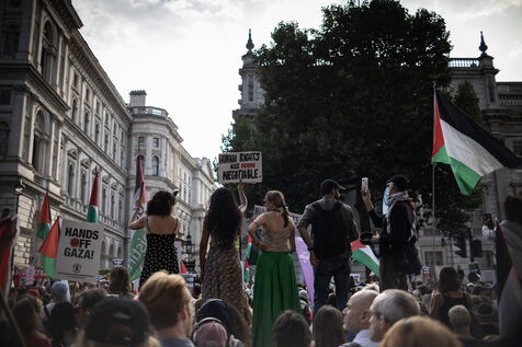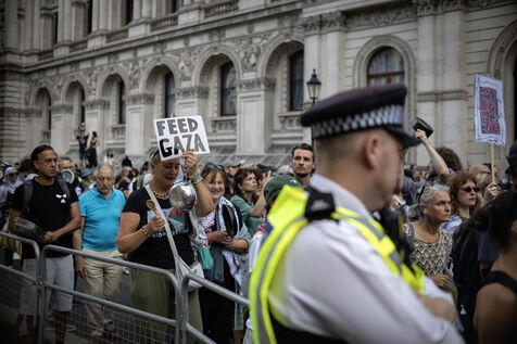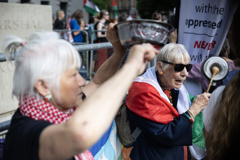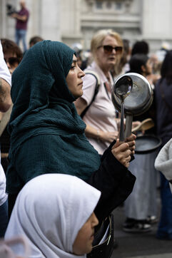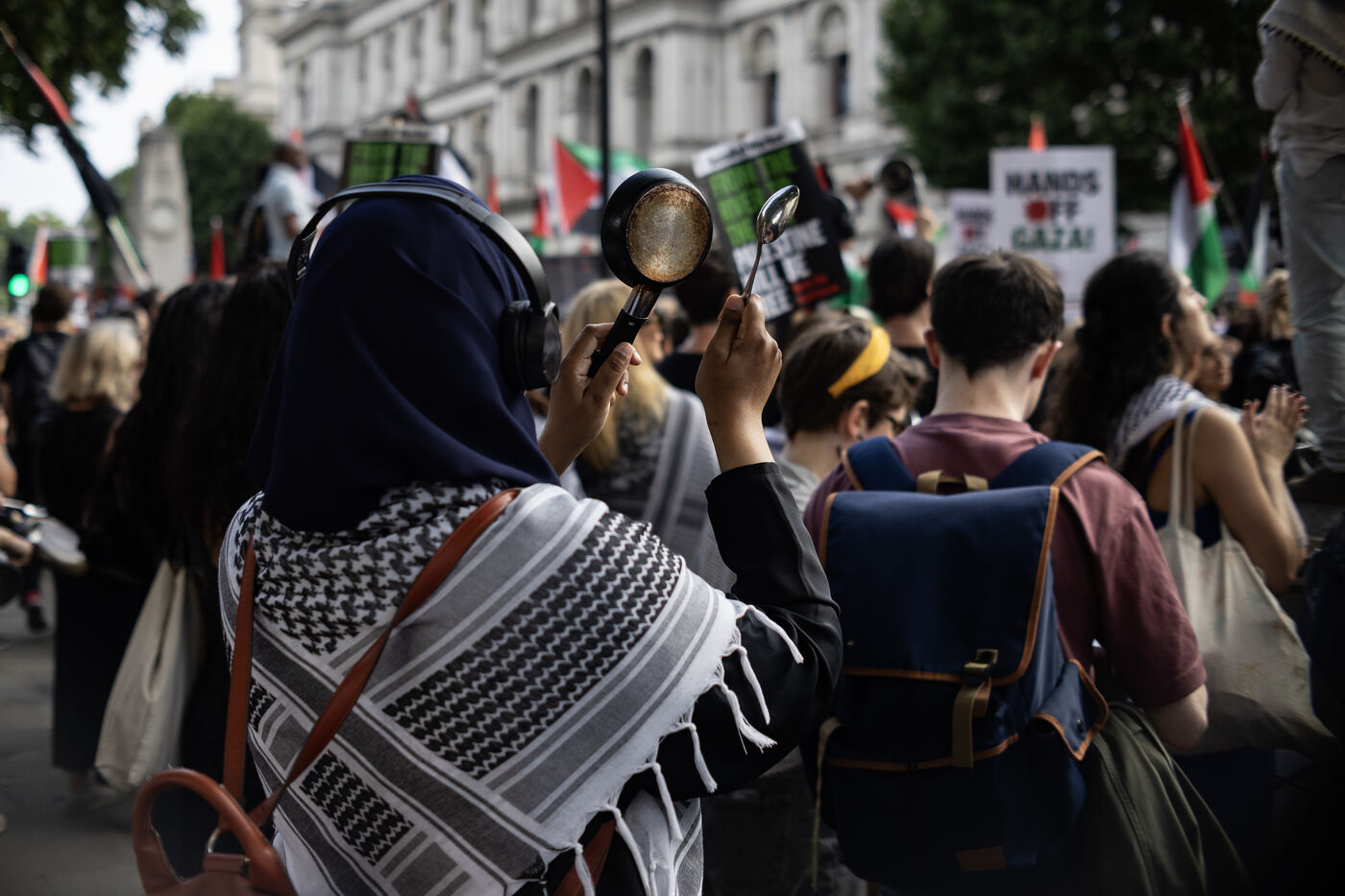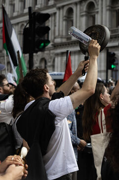 Pro-Palestinian demonstration with saucepans and cooking utensils in front of Downing Street in support of the Palestinian people.