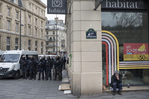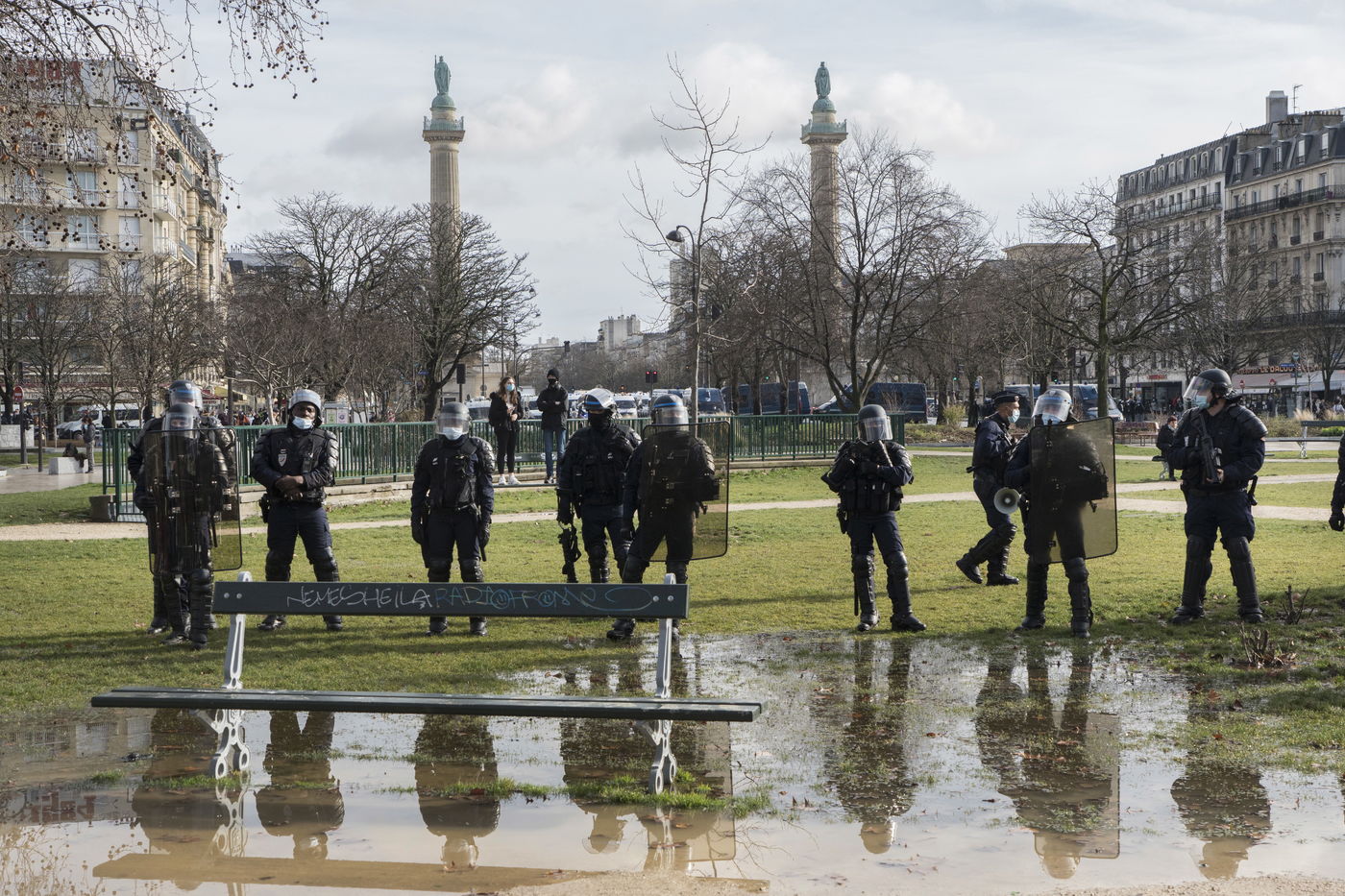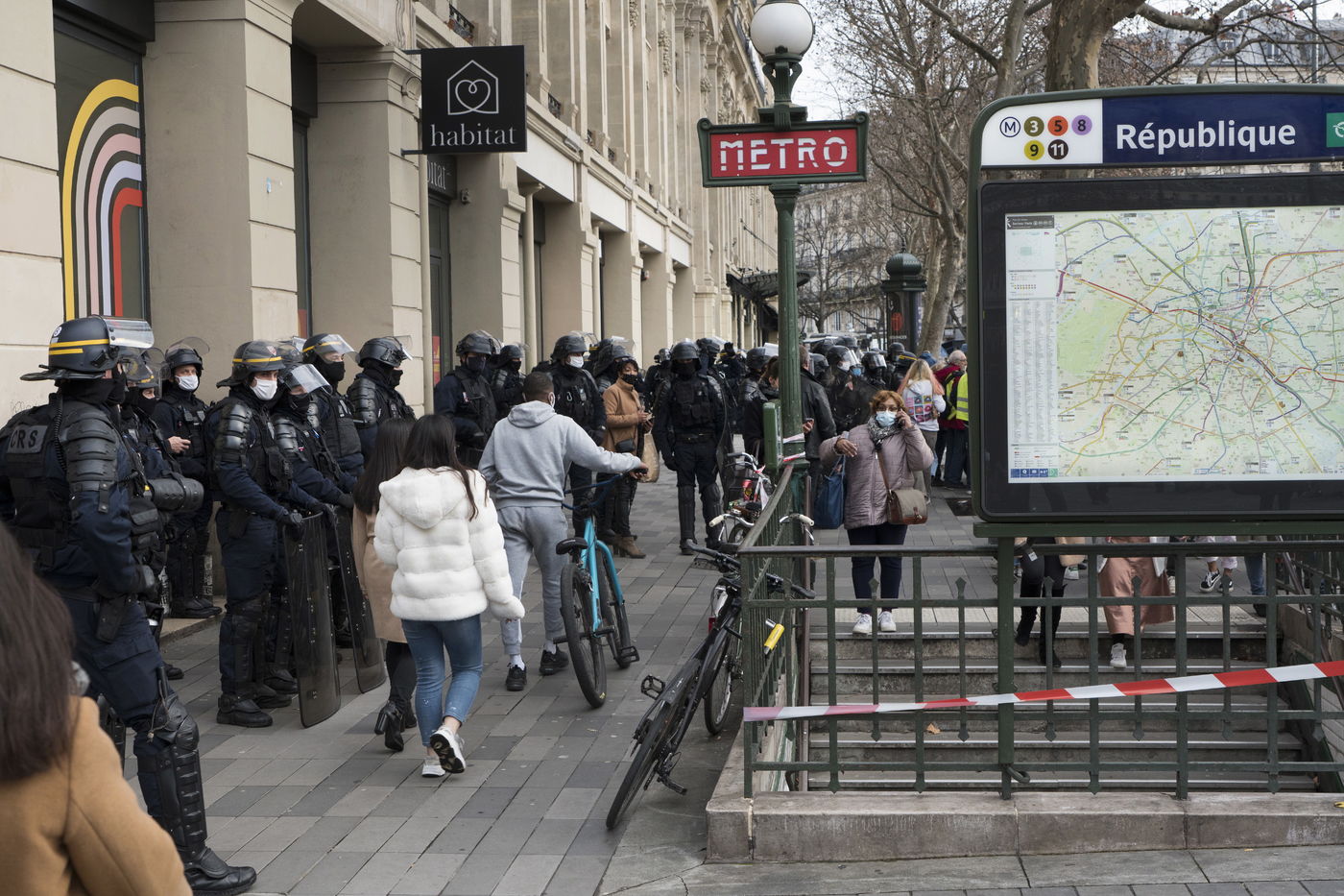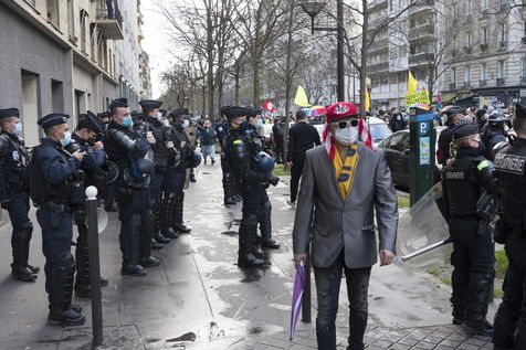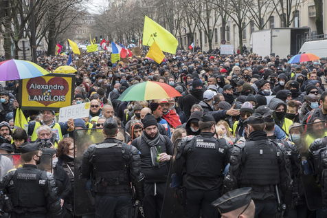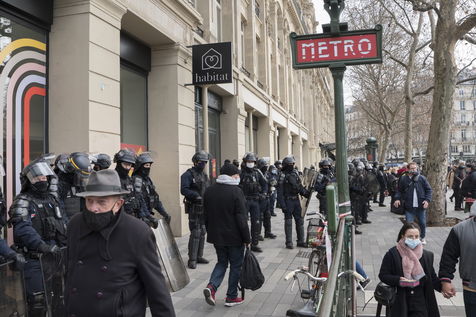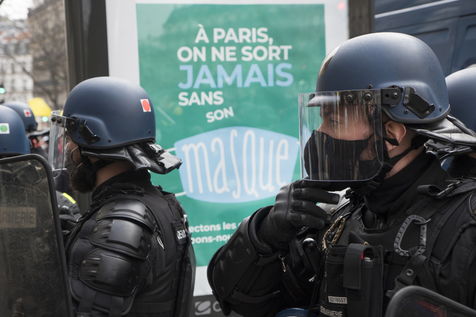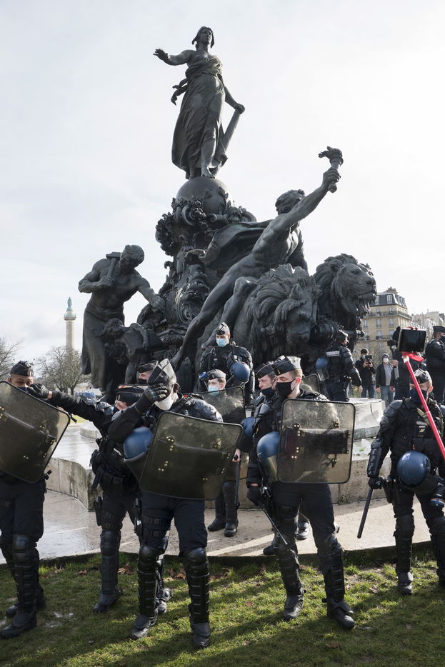 Strong police presence during the demonstration. Thousands of demonstrators in France gathered for the Unitary March of Freedoms to protest against French law, Article 24 of Global Security, bans the publication of images identifying French police officers. Journalists and rights groups criticized the new law