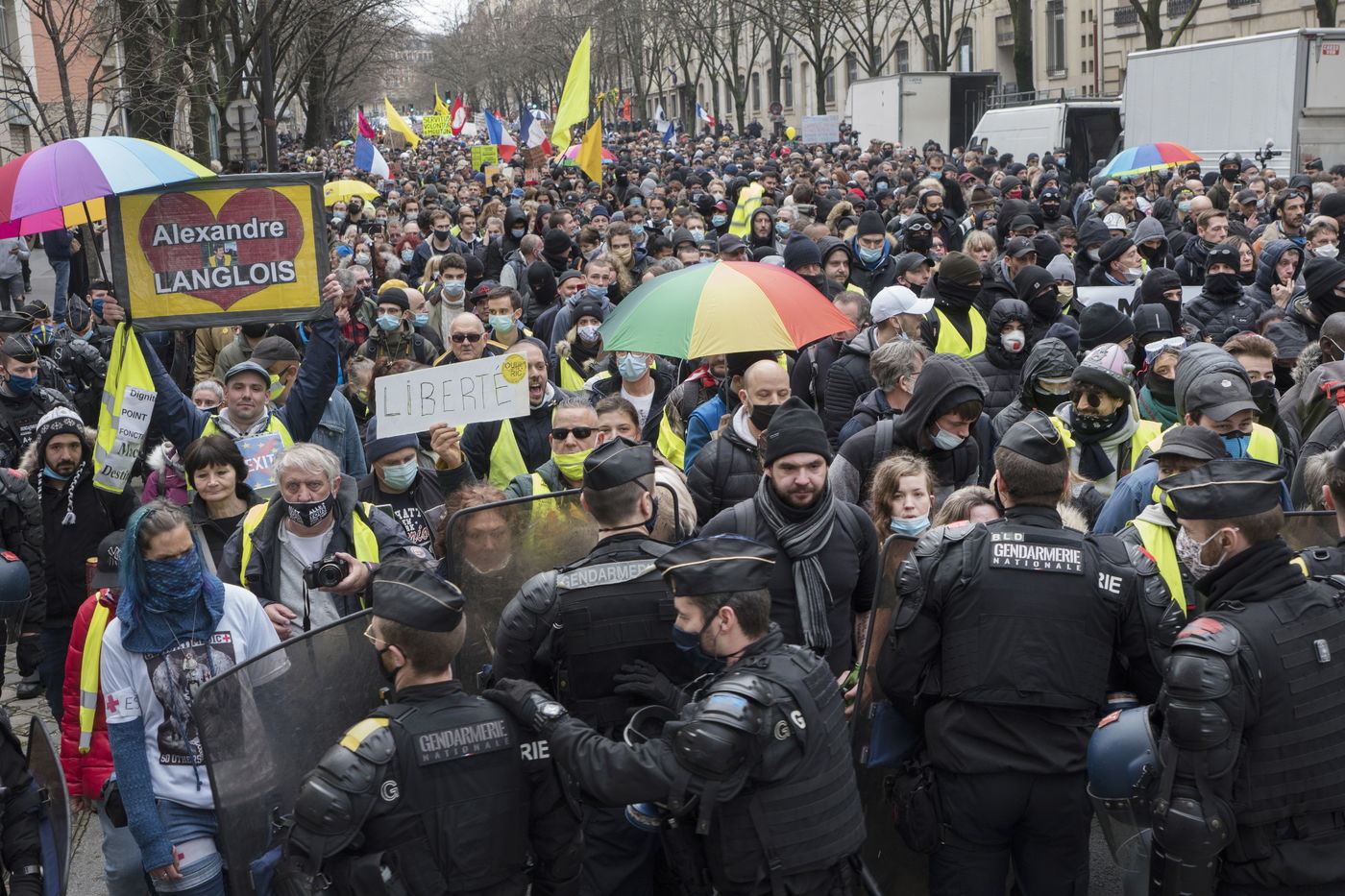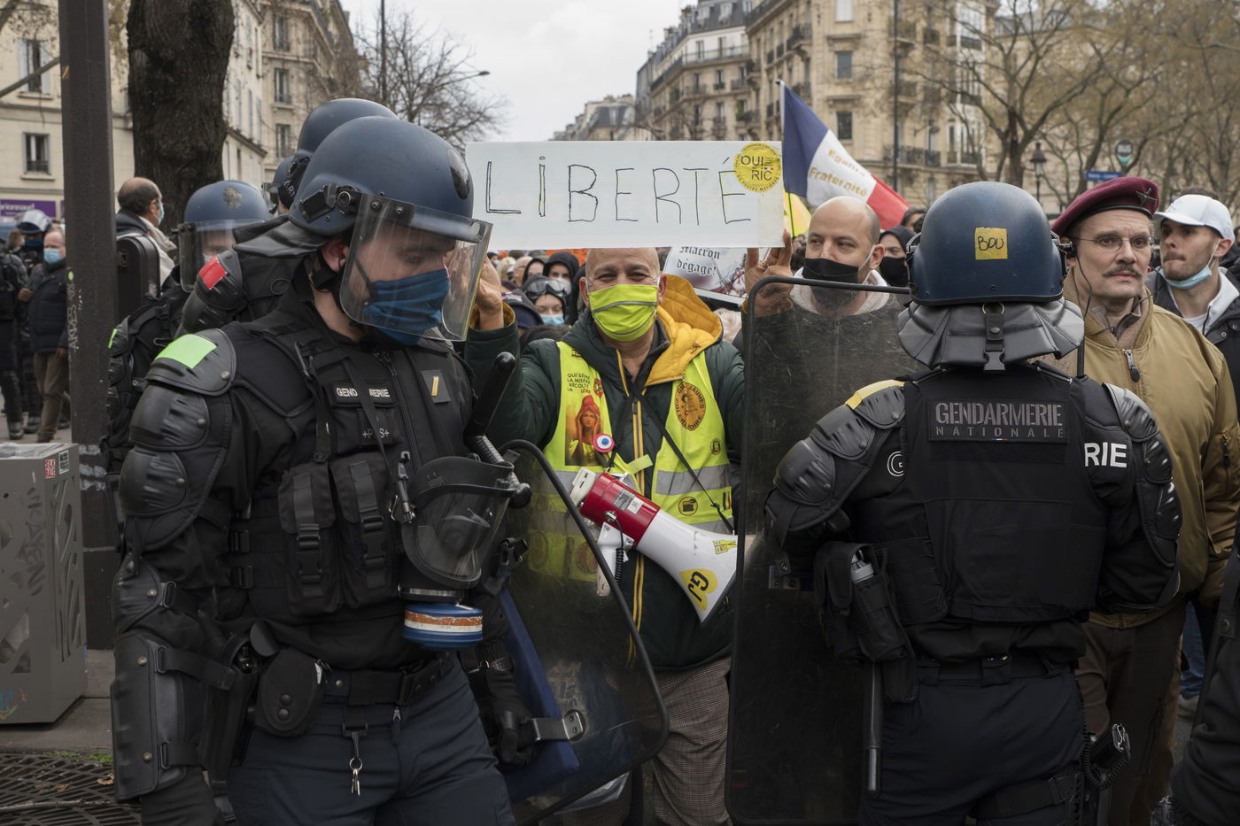 Forte presence policiere lors de la manifestation. Des milliers de manifestants en France se sont rassembles pour la Marche Unitaire des libertes pour protester contre le loi française, l article 24 de la Securite Globale, interdit la publication d images identifiant des policiers francais. Les journalistes et les organisations de defense des droits ont critique la nouvelle loi