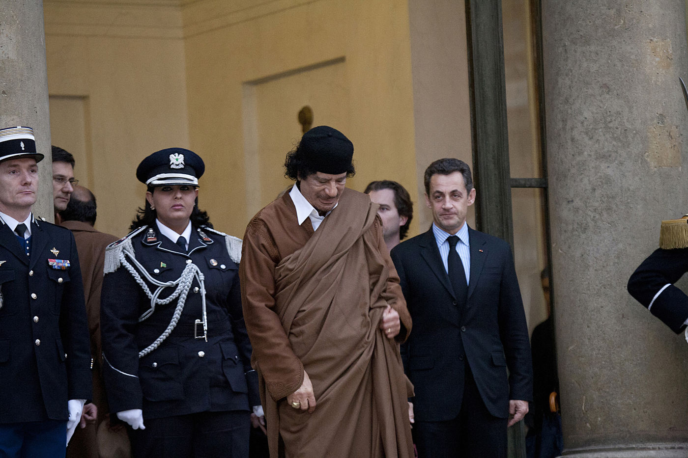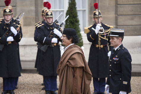 Colonel Muammar al-Gaddafi, who has been de-facto leader of Libya since 1969 is welcomed on his visit to Paris by the invitation of French President Nicolas Sarkozy at the Elysee Presidence.