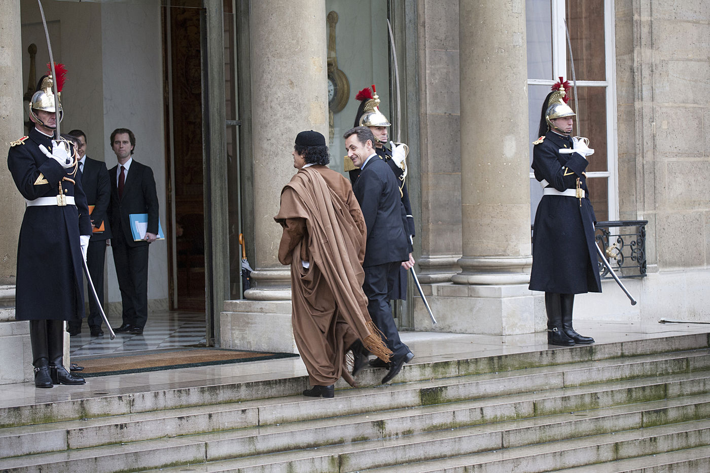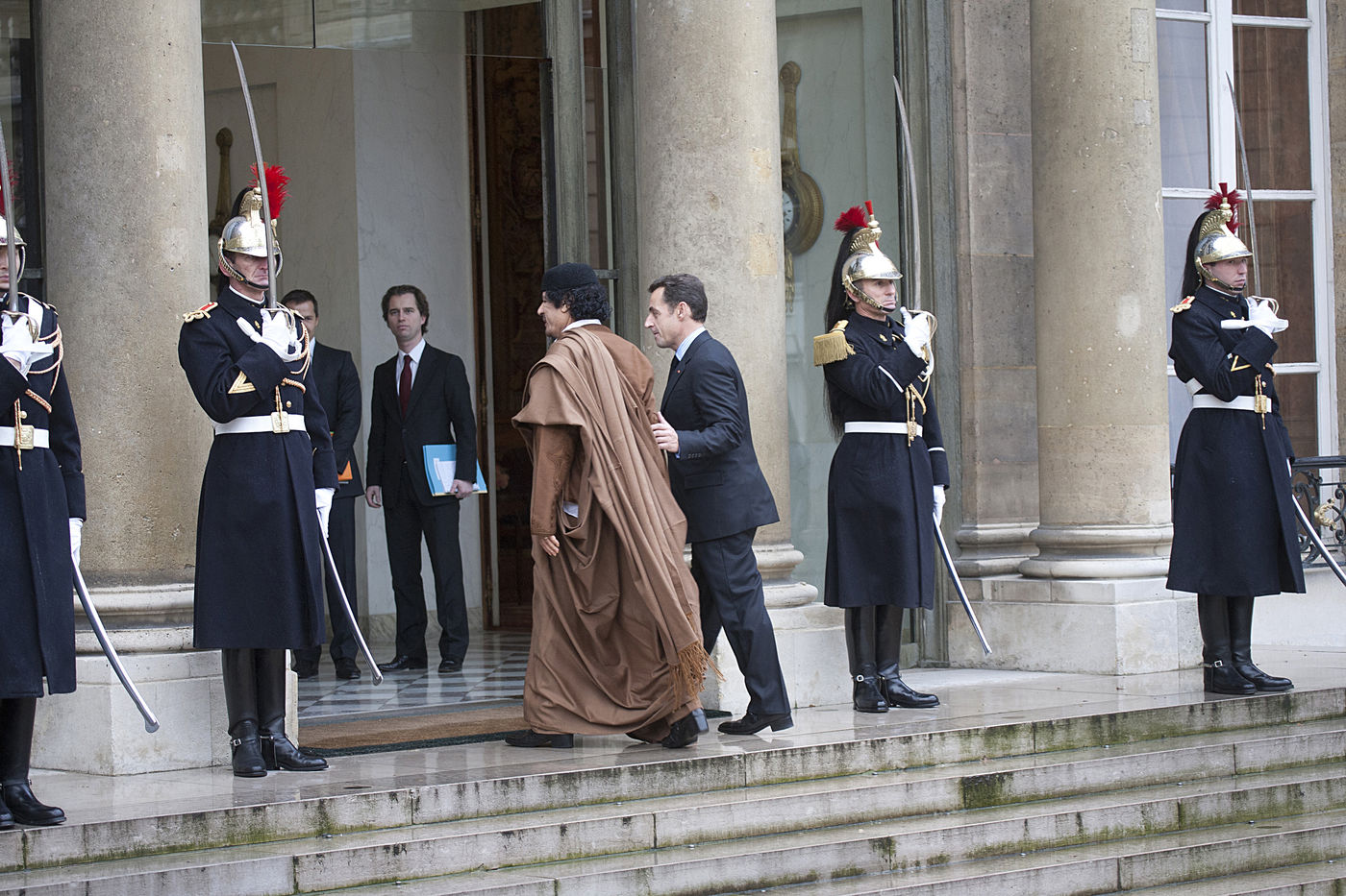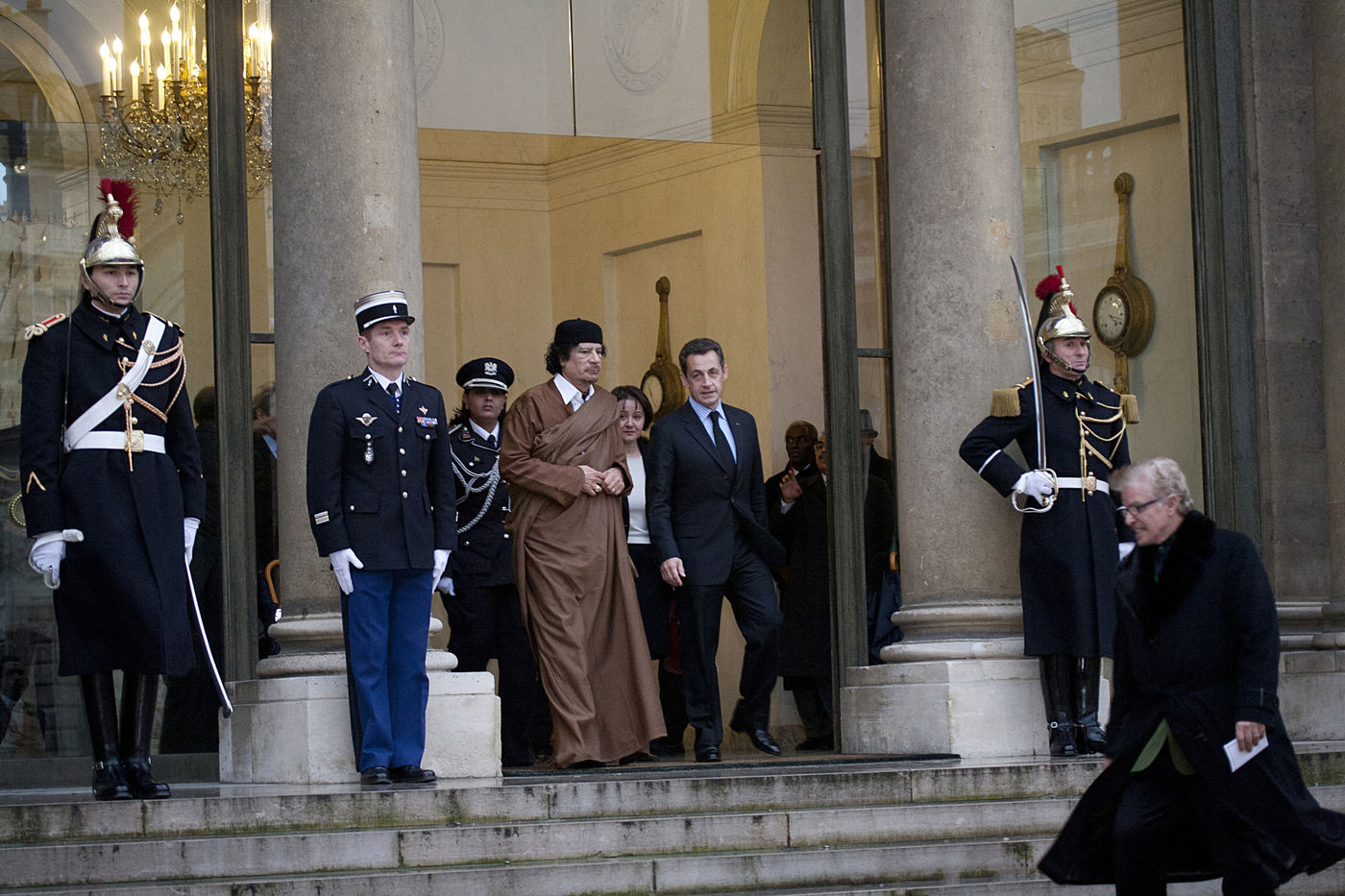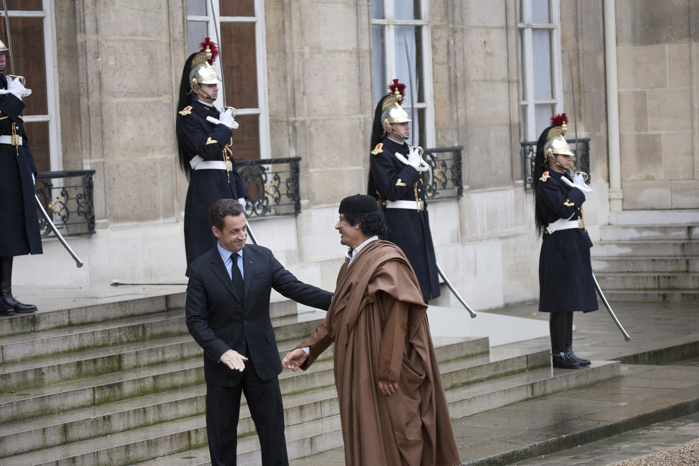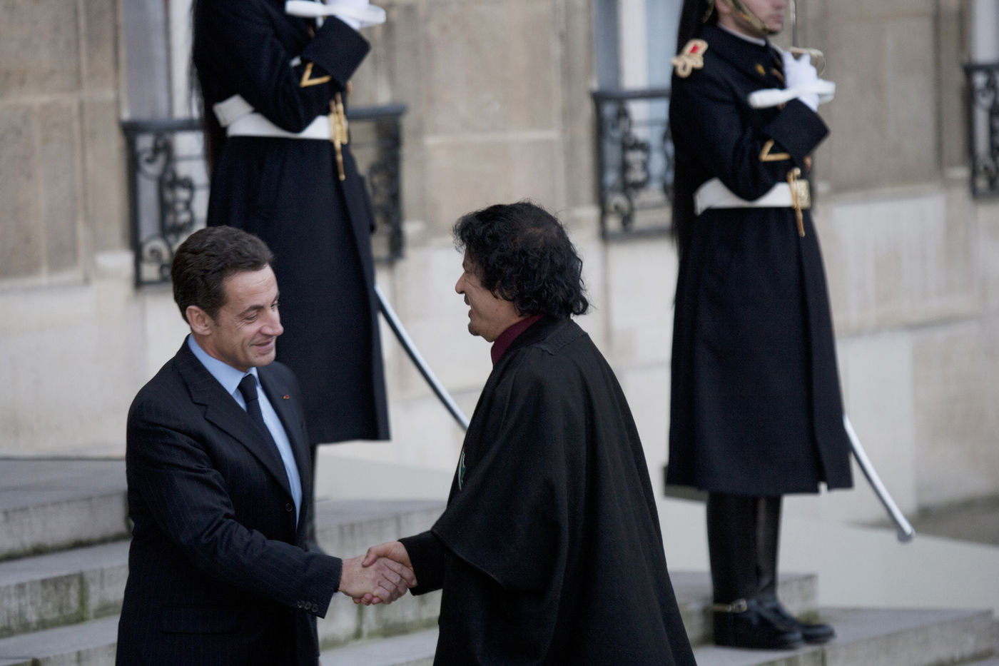 Le colonel Mouammar al-Kadhafi, qui dirige de facto la Libye depuis 1969, est accueilli lors de sa visite a Paris par l invitation du president francais Nicolas Sarkozy a la presidence de l Elysee. Palais de l Elysee, Paris, 10 decembre 2007