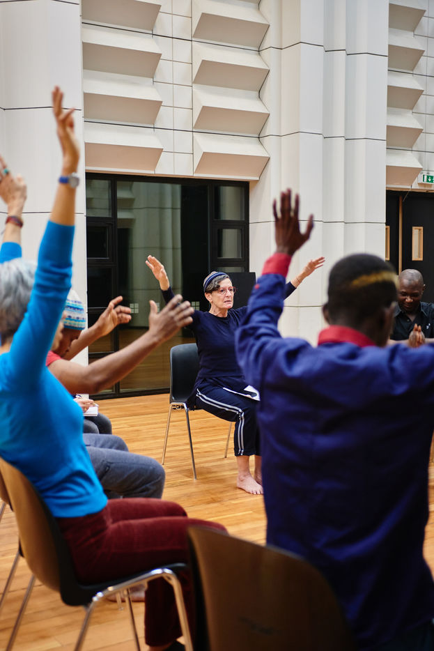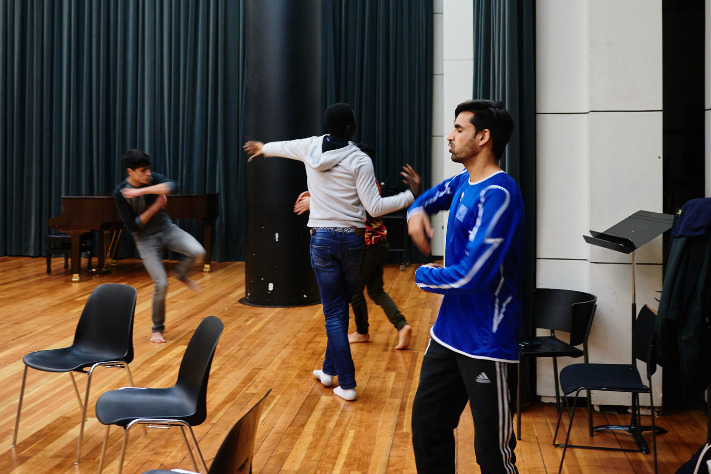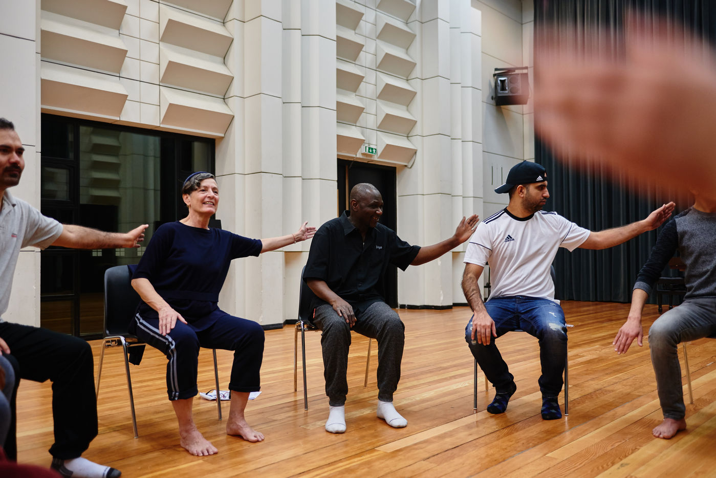 Régine Chopinot in residency at the Opéra de Paris Bastille leading choregraphic workshops that welcome people in exile, learning the French language or in precarious situations.