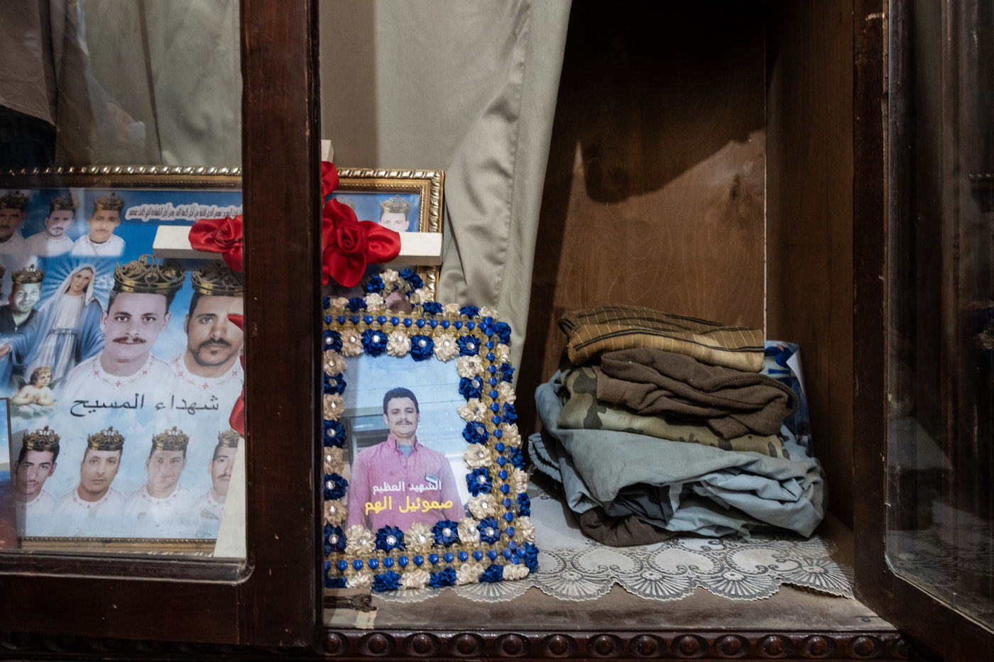 Mariam, the wife of the martyr Samuel, discreetly opened the door of the family shrine. Next to the altar is a cupboard with her husband's belongings, including a shirt with miraculous effects.