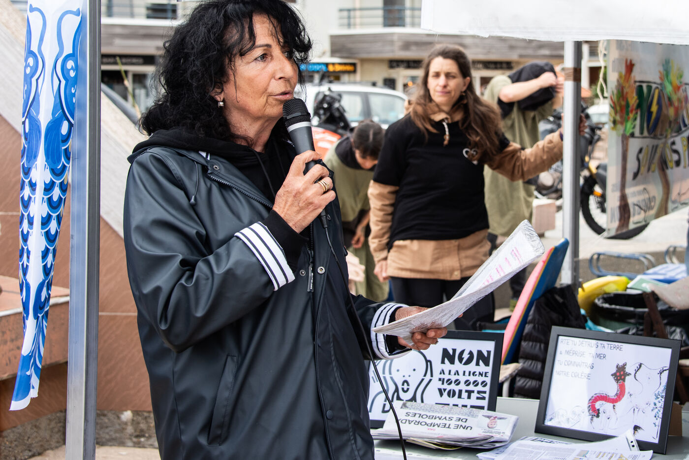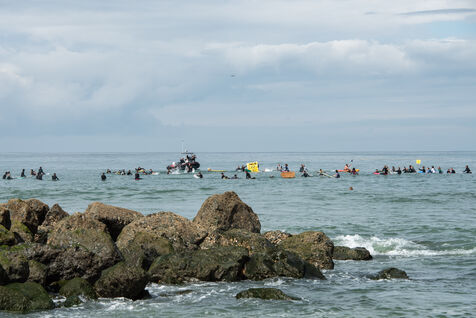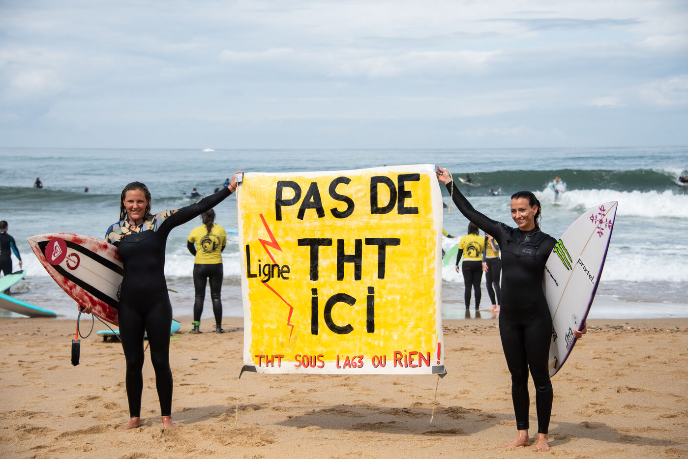 Citizens gathered again, this time in Capbreton, to fight against the RTE project. This time, surfers jumped into the water and participated in their own way. Maud Le Car and Joan Duru took part. As well as artist Tom Frager