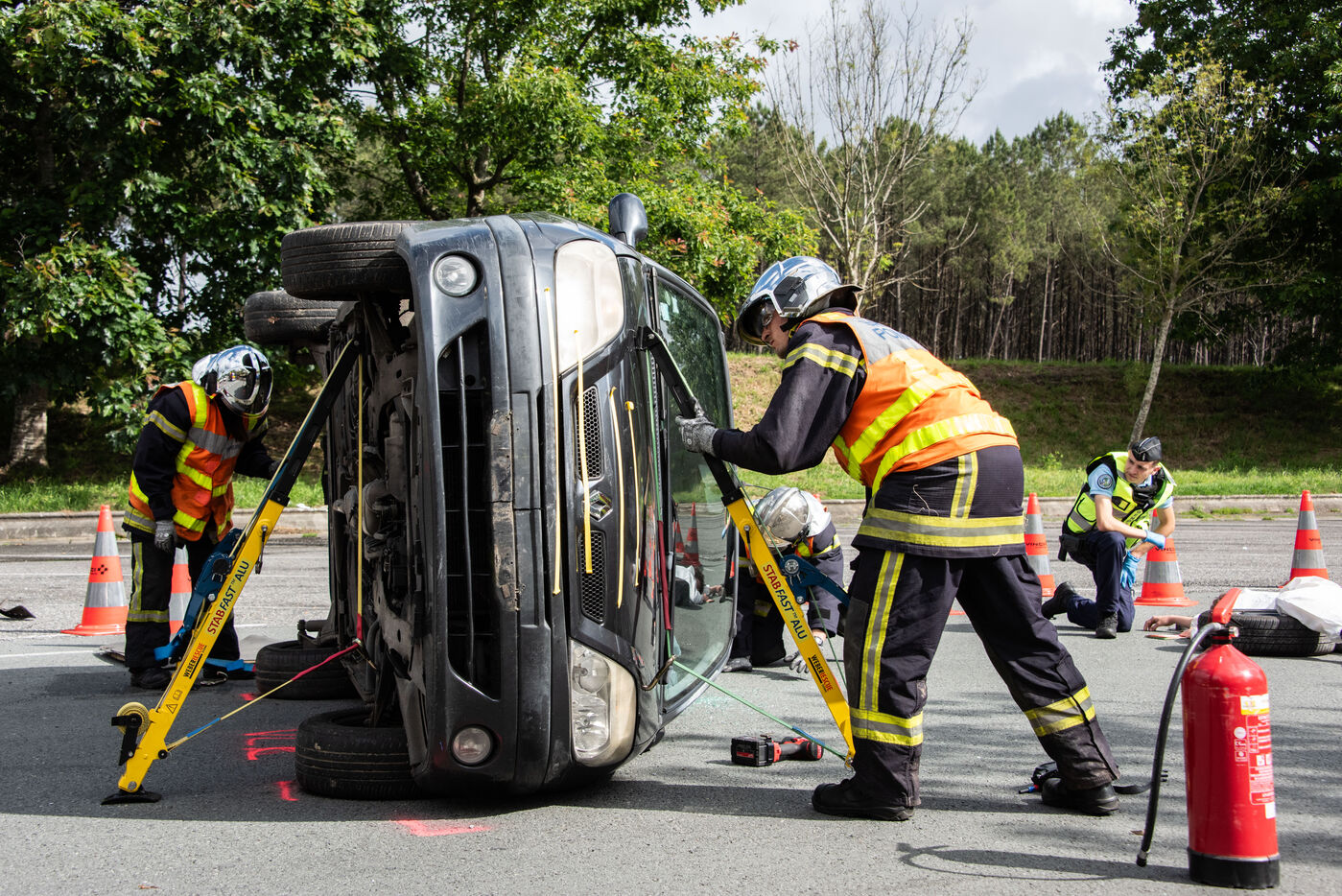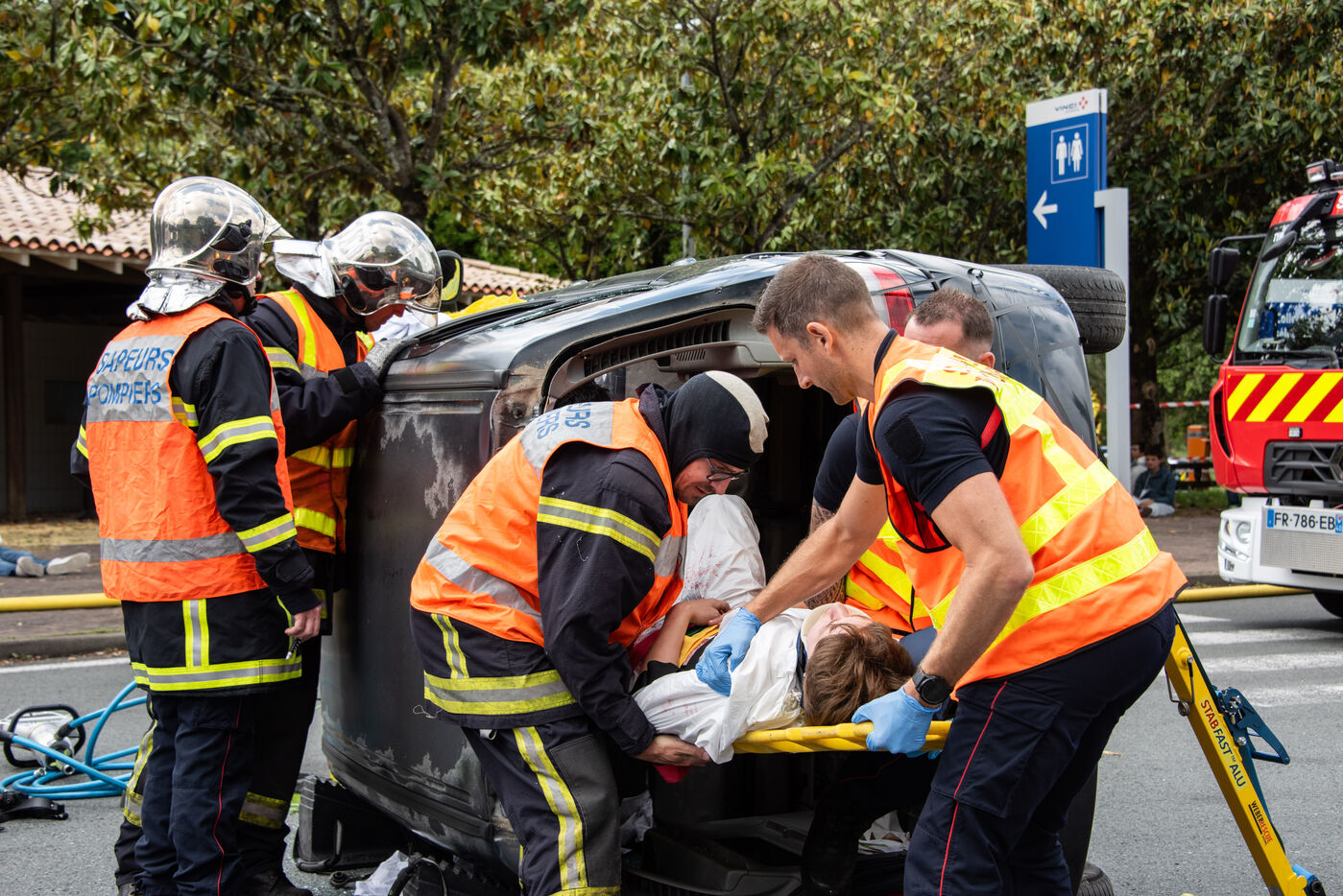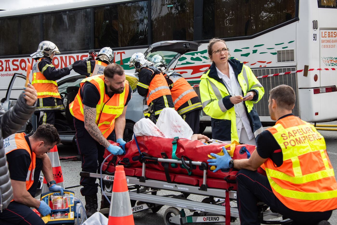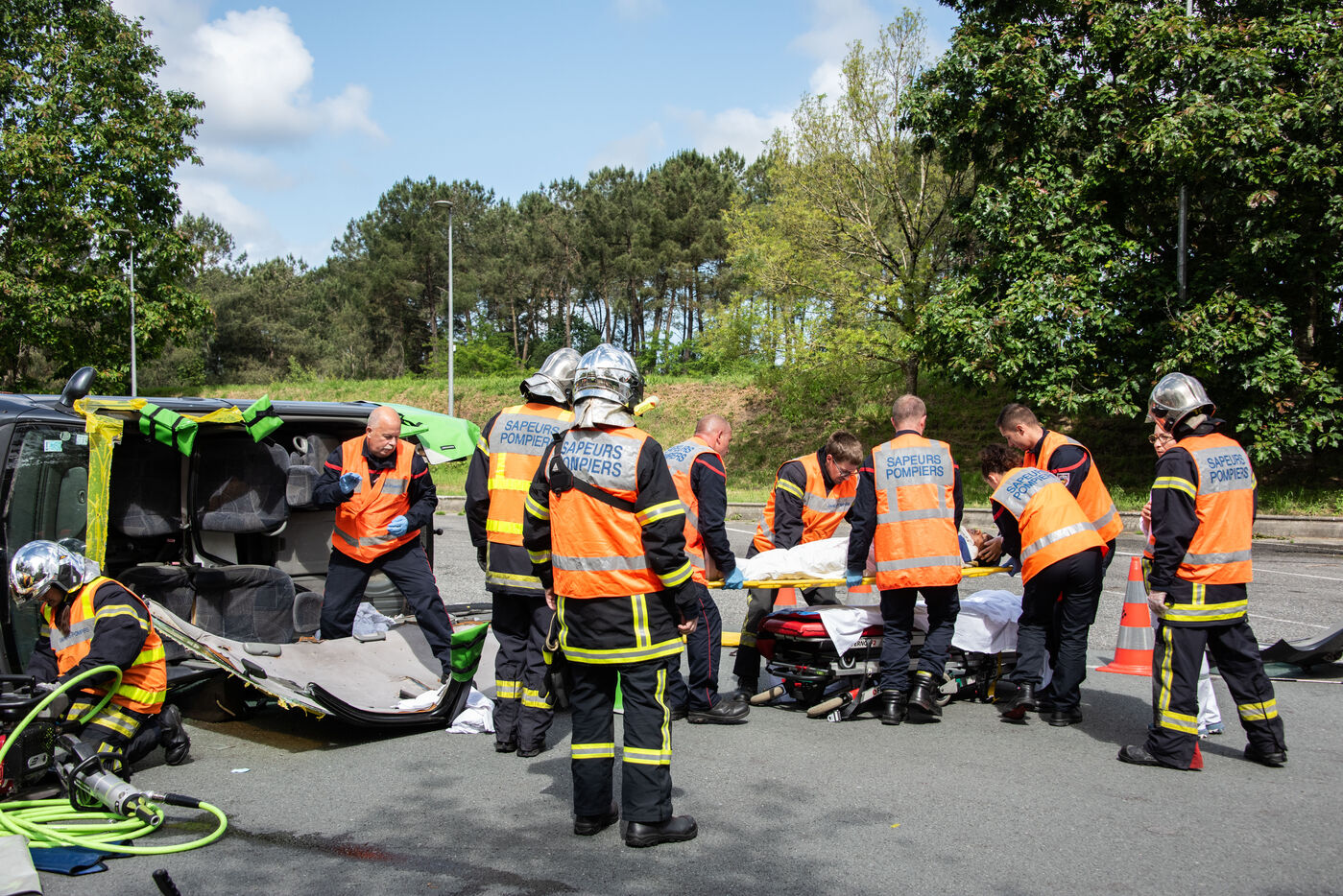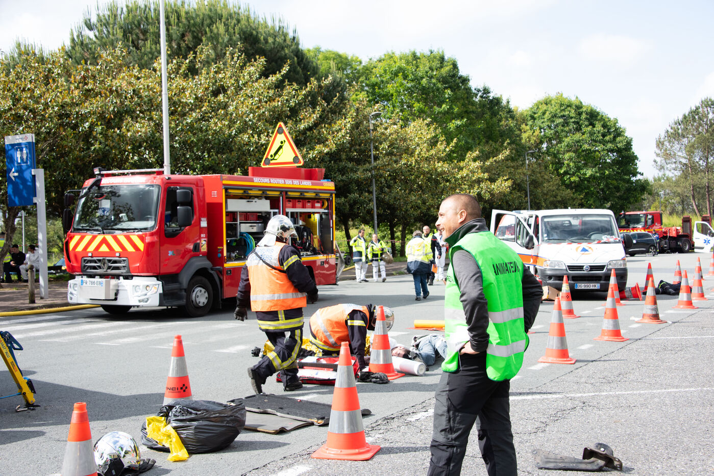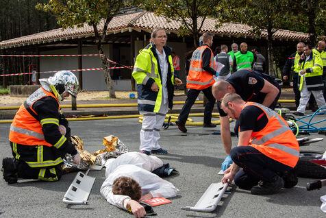 Prefecture, gendarmes, firefighters, SDIS, Samu, command center, Protection Civile etc. from several towns in the Landes region, took charge of various accident cases (simulated by high school students, among others). The organization and handling of the scenarios were filmed and monitored by facilitators and observers, before being debriefed.