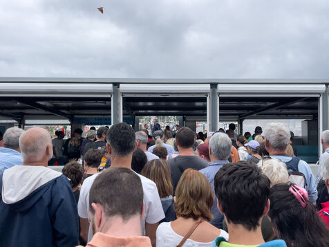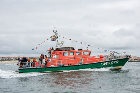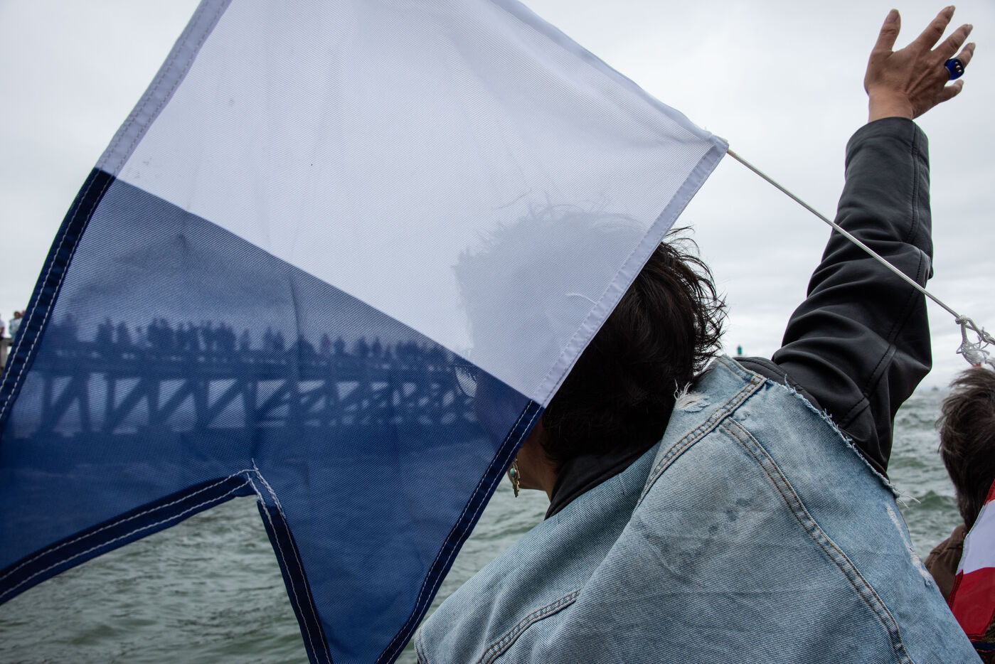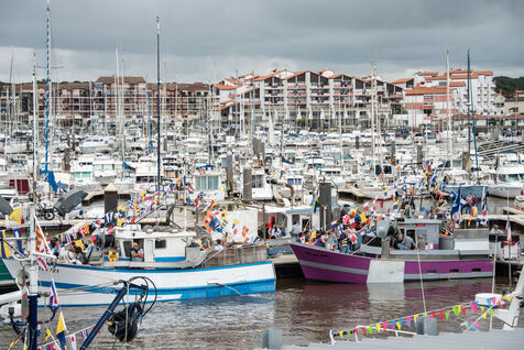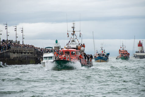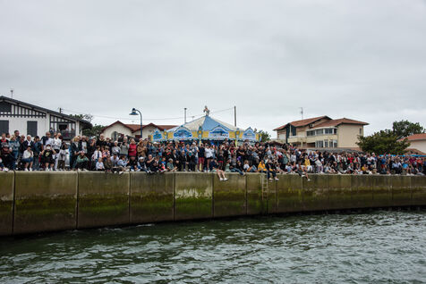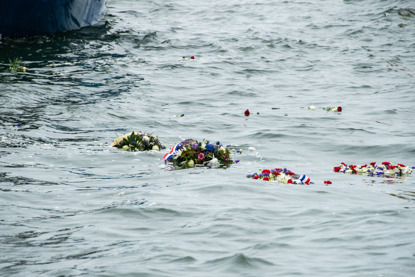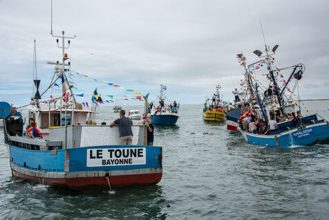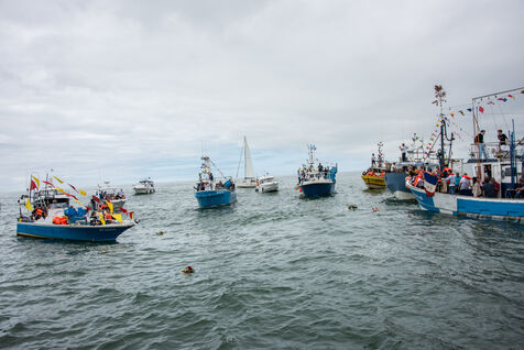 Le deuxième jour, traditionnellement, les marins-pêcheurs sortent en mer en procession et se regroupent aux large pour lancer des couronnes de fleurs en mémoire des marins ayant péri en mer. Les visiteurs sont nombreux à venir assister à la sortie en mer, par cette après-midi sans pluie.