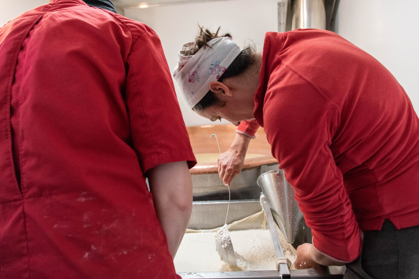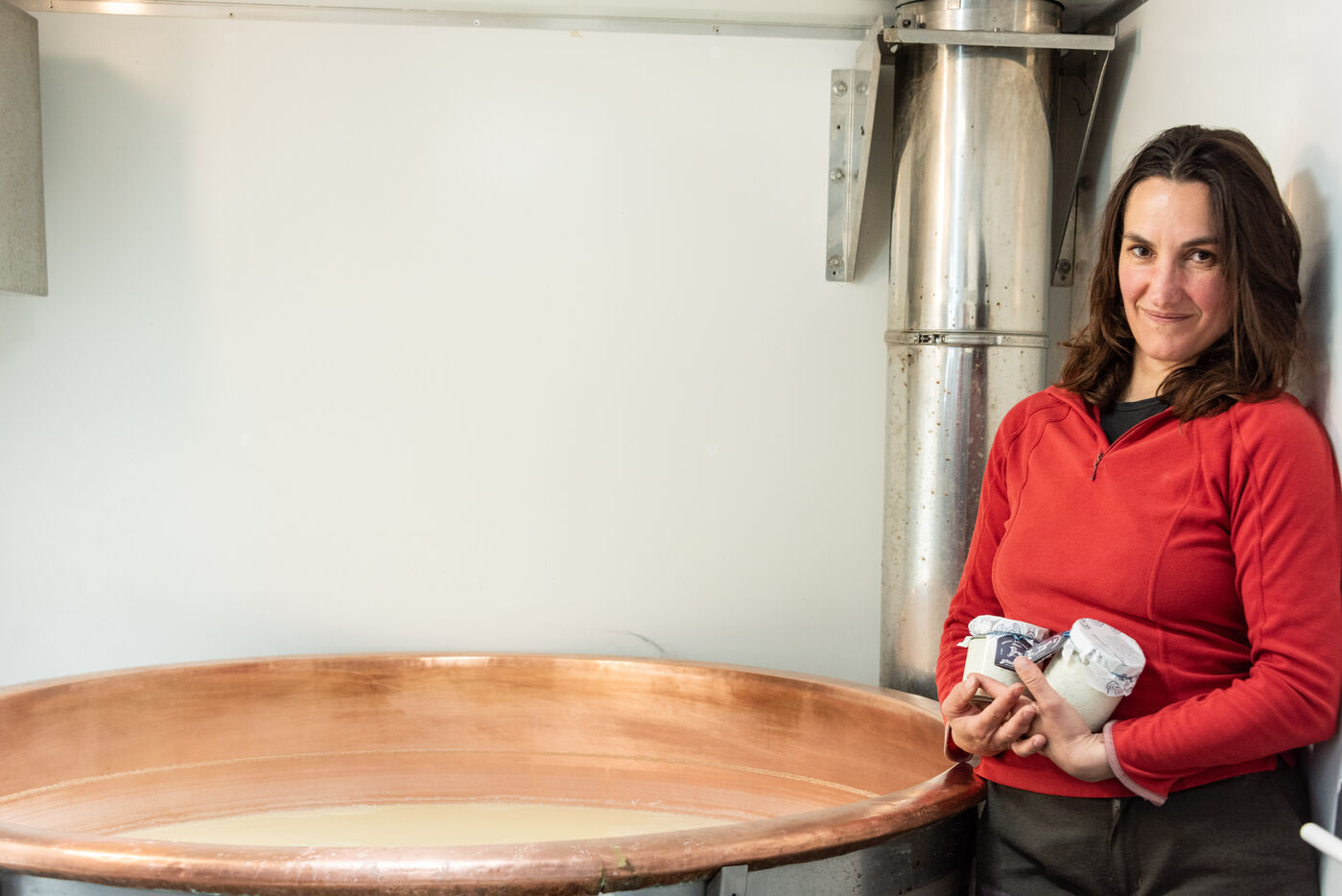 Depuis 5 ans, elle passe récolter tous les matins (de décembre à juillet) environ 800 litres de petit lait issu de la fabrication de la tomme de brebis dans les fermes aux alentours de chez elle. Puis elle le transforme dans sa petite fromagerie mobile en greuil, l’équivalent de la ricotta. « C’est une peu tabou le petit lait parce que c’est interdit de le jeter. Mais c’est compliqué pour les paysans de s’en débarrasser ». Certains le donnent aux cochons, d’autres l’épandent mais l’acidité peut tuer la prairie, et puis il faut faire attention à la météo pour éviter de polluer les nappes ». Marie vend environ 50% de sa production artisanale en circuit direct (commerces locaux et libre-service), le reste à des grossistes.