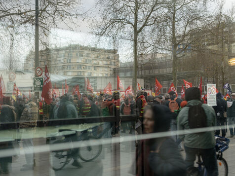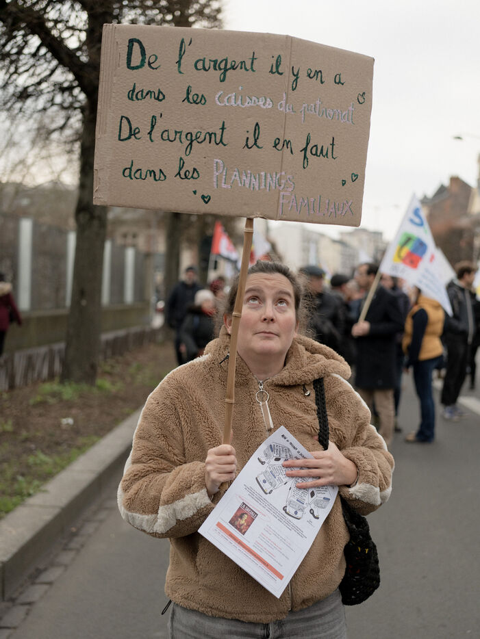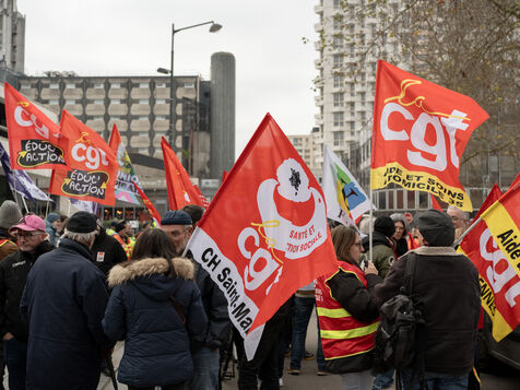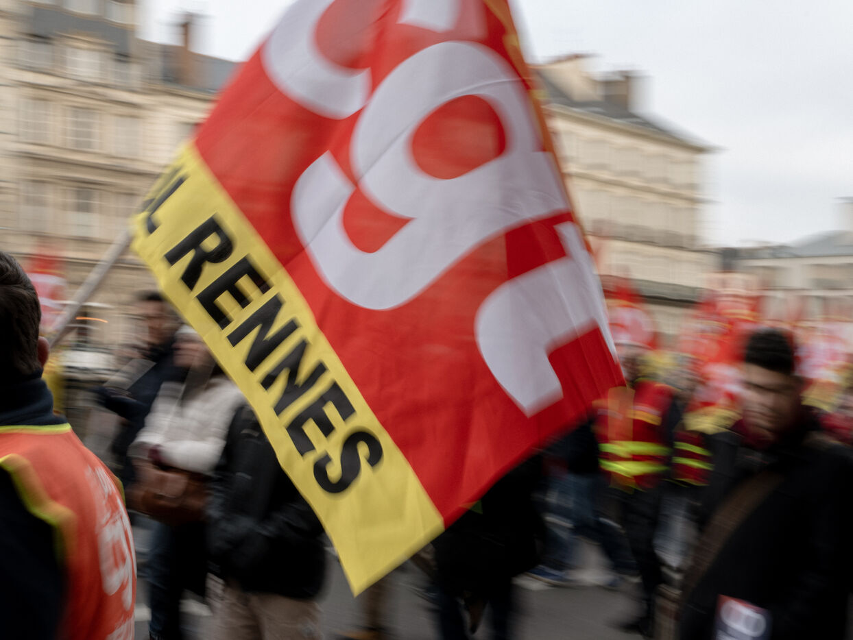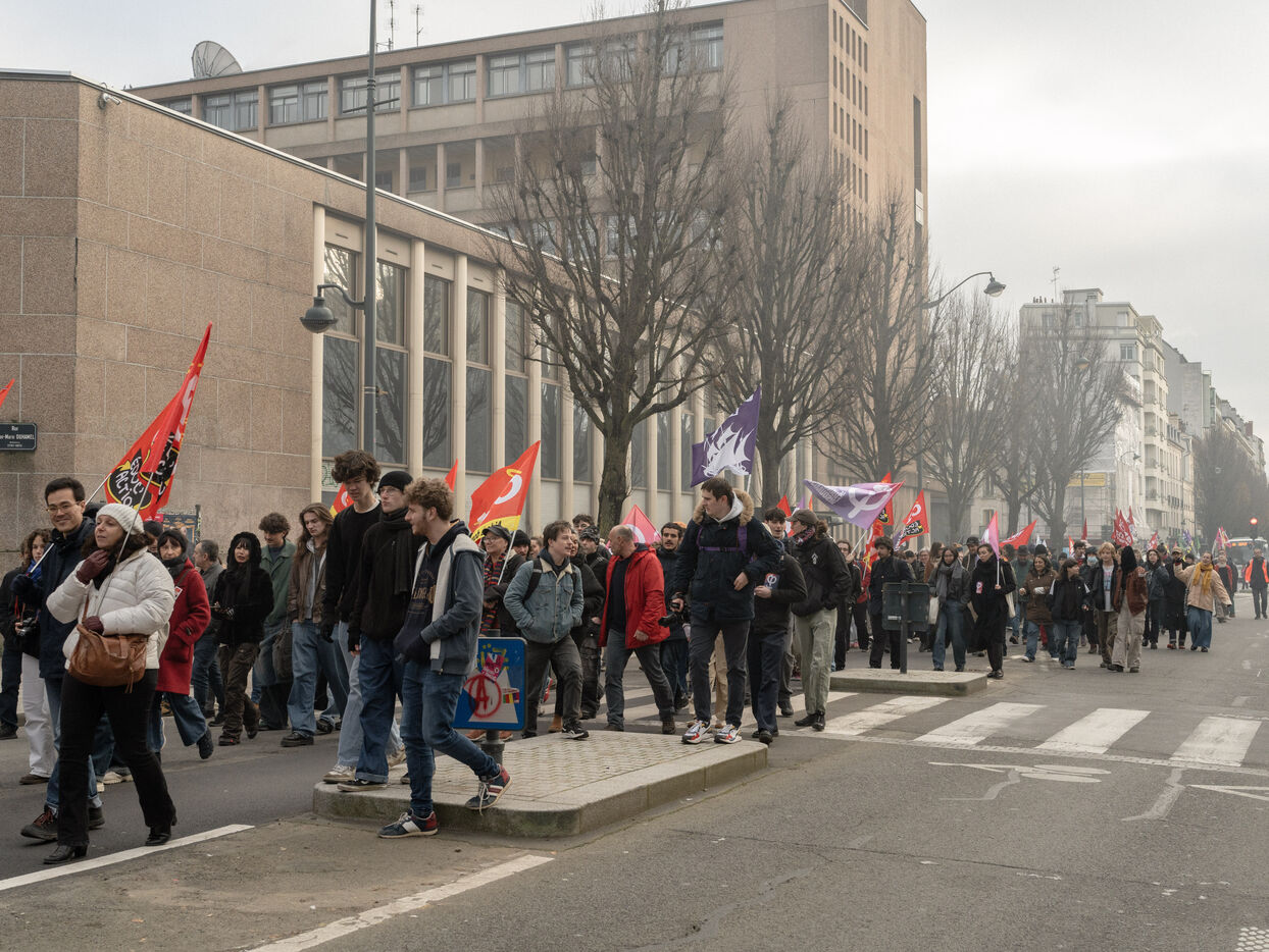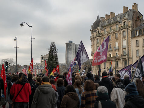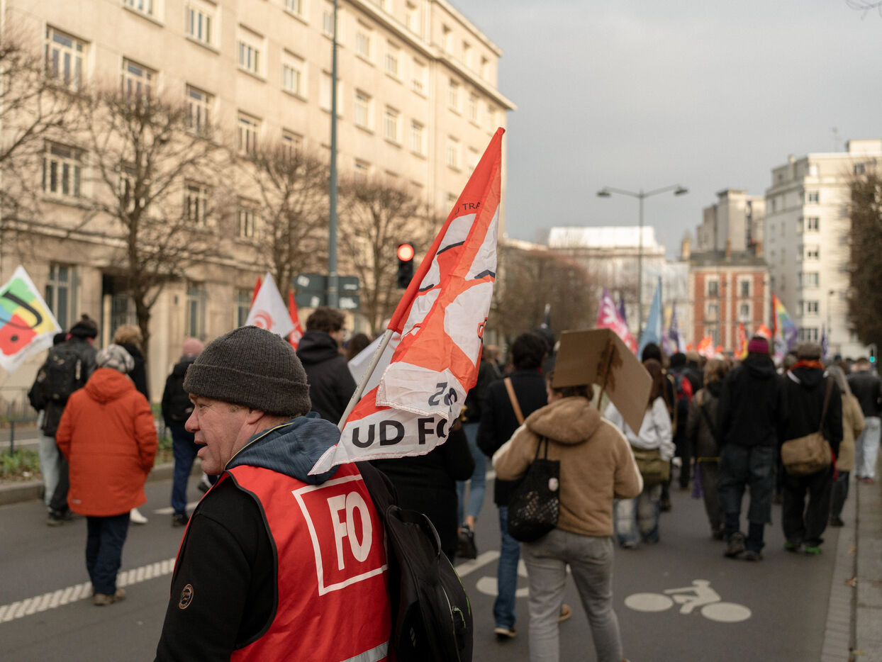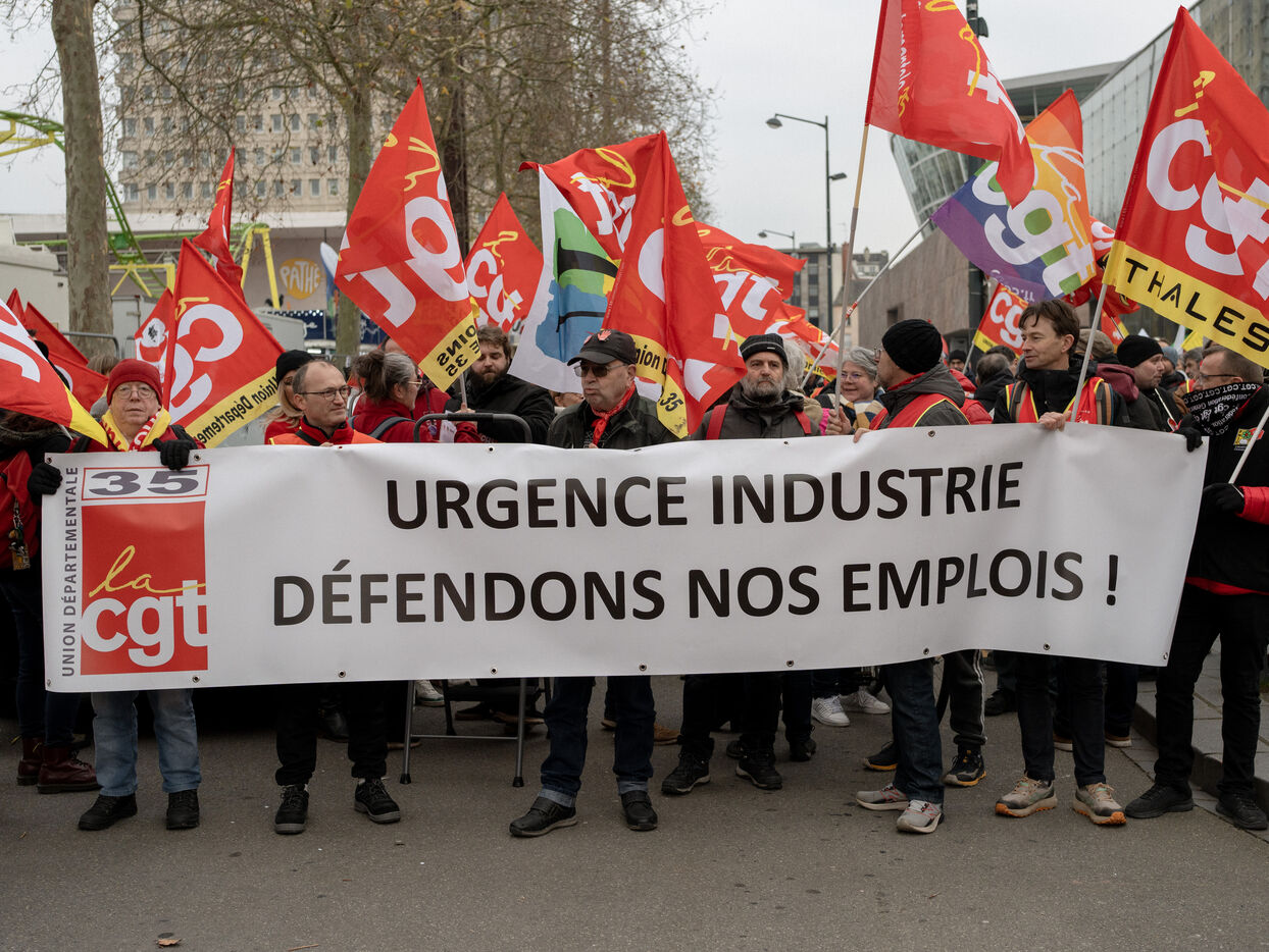 Manifestation pour l'emploi et l'industrie à Rennes (Ille-et-Vilaine) le 12 décembre 2024. Les manifestants protestaient contre les plans sociaux mis en place dans de nombreuses sociétés françaises. À date du 12 décembre, 300 000 emplois étaient menacés ou avaient déjà été perdus, selon le cabinet Altares, qui dénombrait 300 plans sociaux.