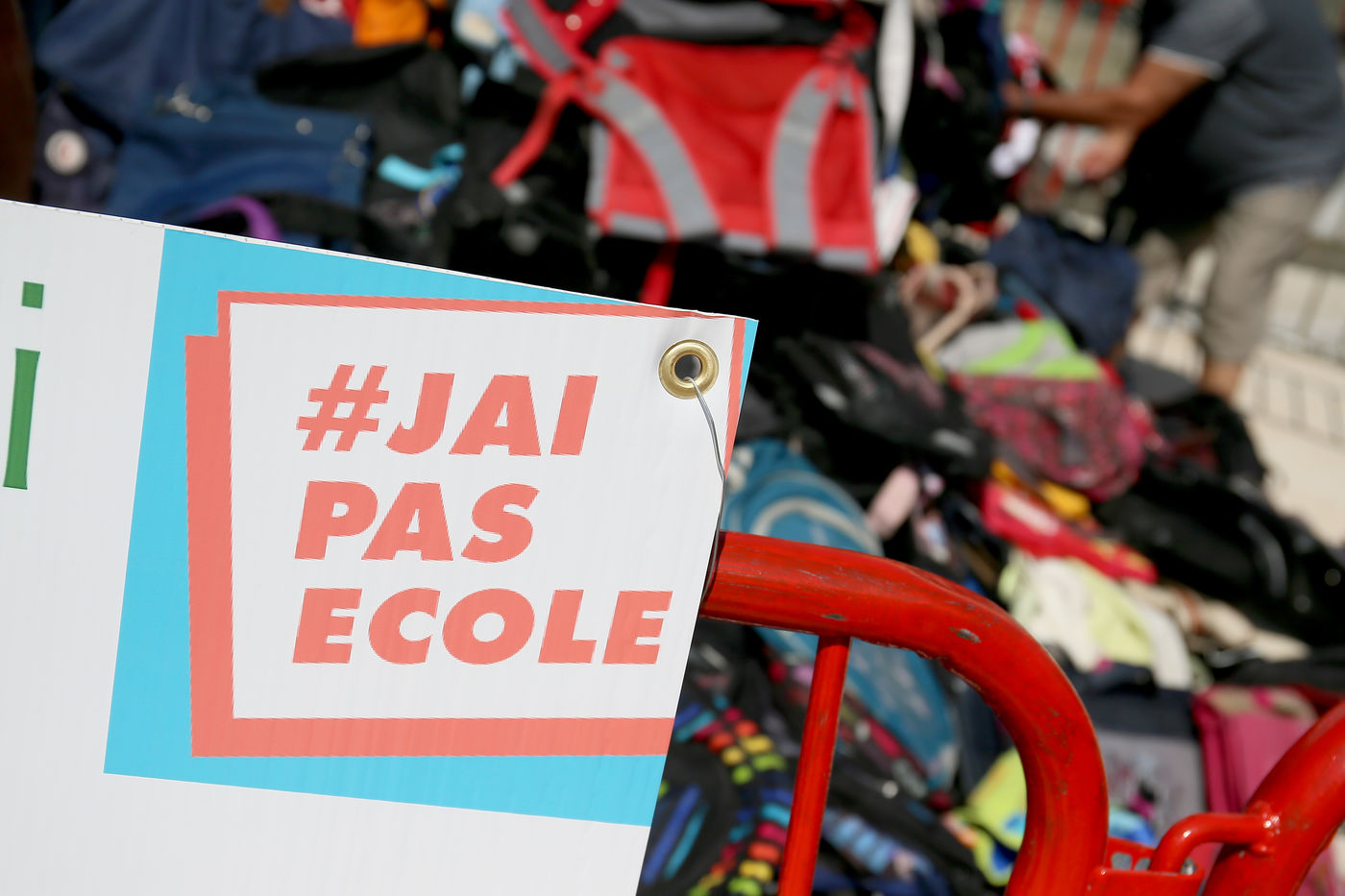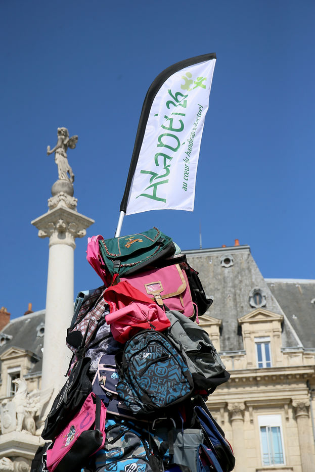 Opération symbolique de pyramide de cartables devant la fontaine monumentale de Valence a l'initiative de l?ADAPEI de la Drôme. La structure dénonce la situation de 257 enfants handicapes mentaux qui seront privés de rentrée scolaire dans la Drôme cette année faute de place disponible dans les quatre instituts médico-educatifs (IME) du département.