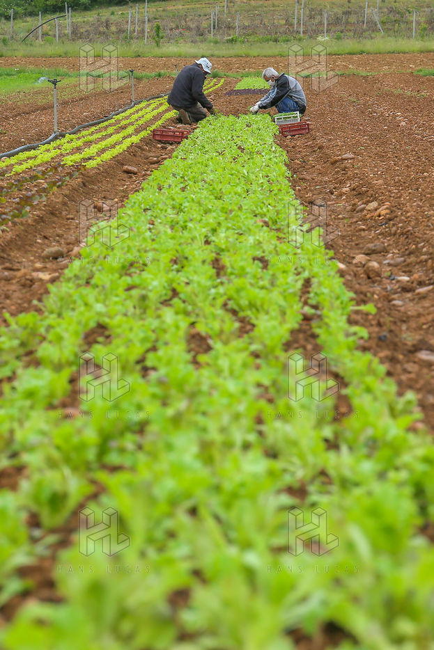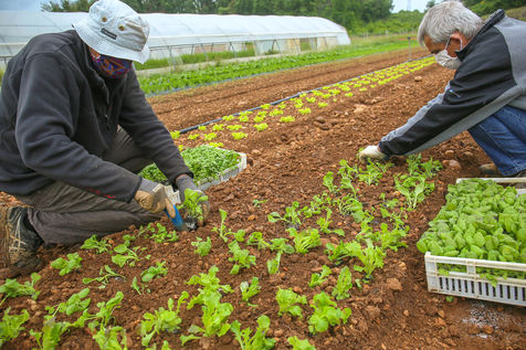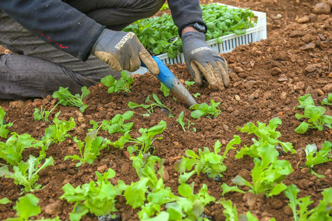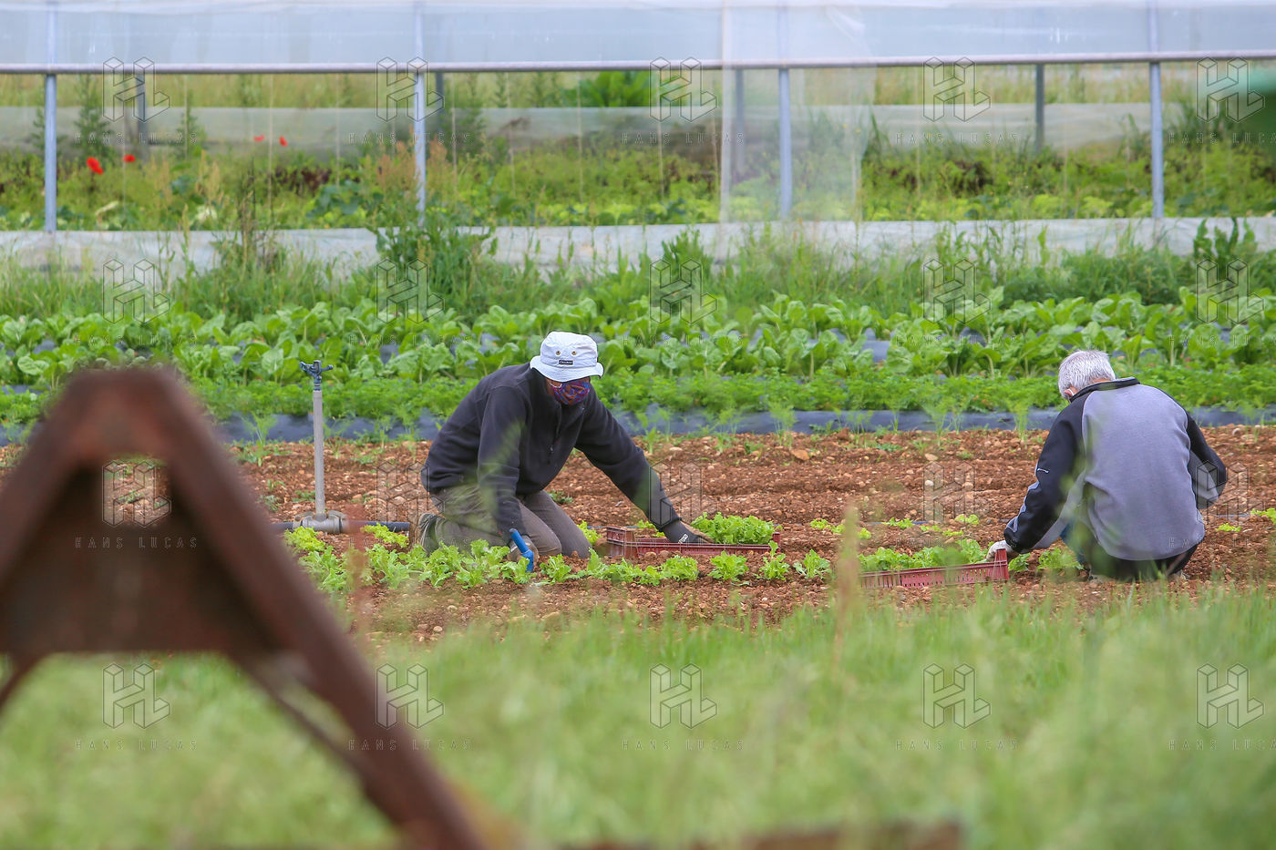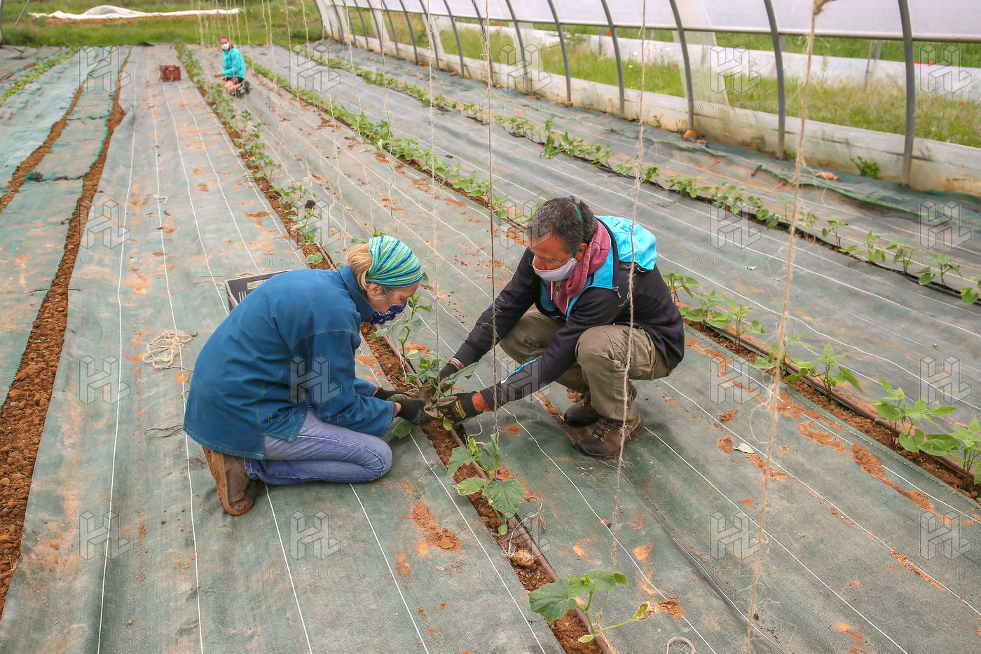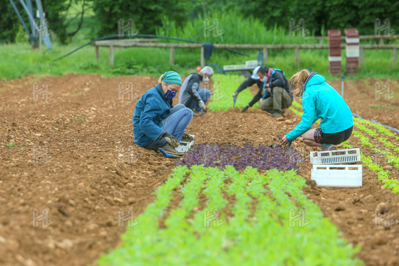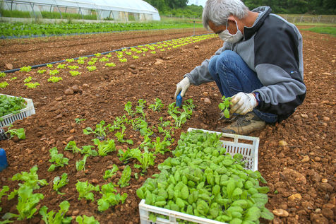 Suite à l'appel du ministre de l'Agriculture Didier Guillaume, plusieurs bénévoles participent aux travaux de plantation et de maraichage des Jardins Graine de Cocagne qui propose des paniers de fruits et légumes bio et 100% locaux.