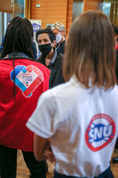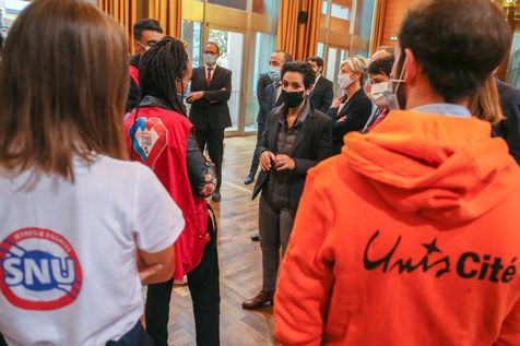 Sarah El Haïry, secrétaire d?État chargée de la Jeunesse et de l?Engagement auprès du ministre de l'Éducation nationale, de la Jeunesse et des Sports, rencontre une dizaine de jeunes qui réalisent une mission de service civique. Avec le plan 1 jeune 1 solution, ce sont 100 000 missions supplémentaires de service civique qui seront mises en place en 2020-2021.