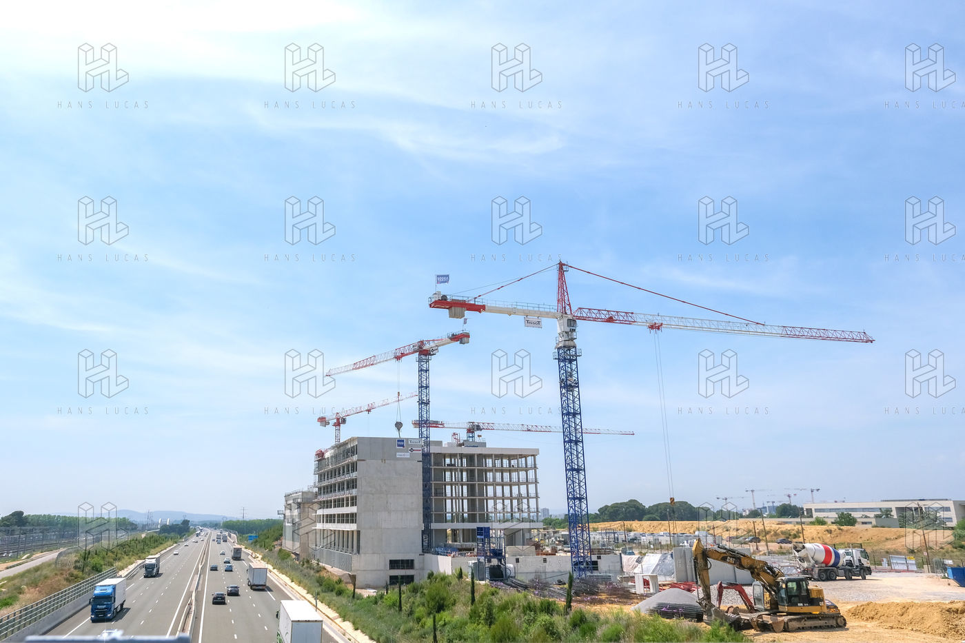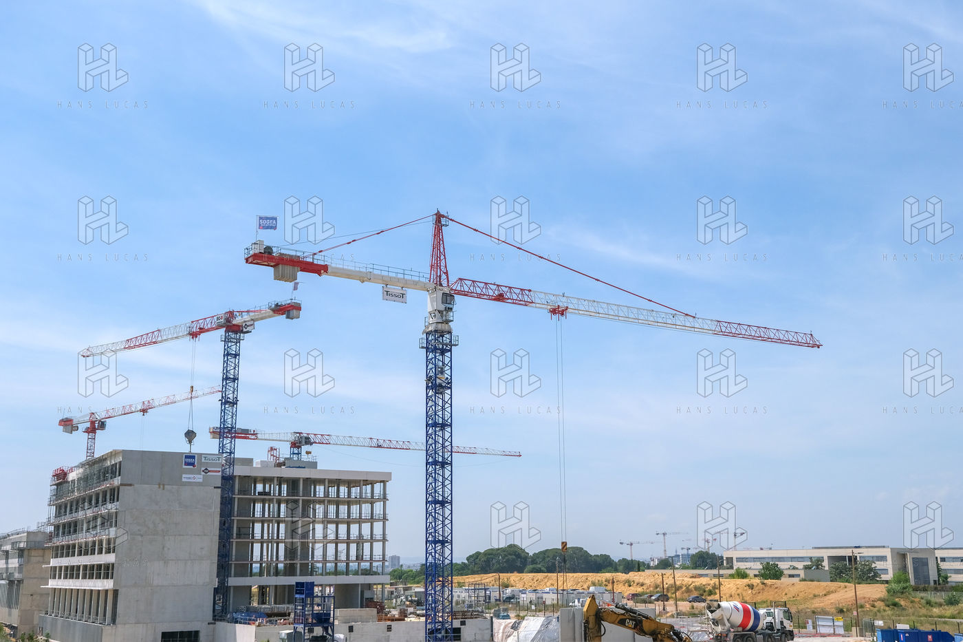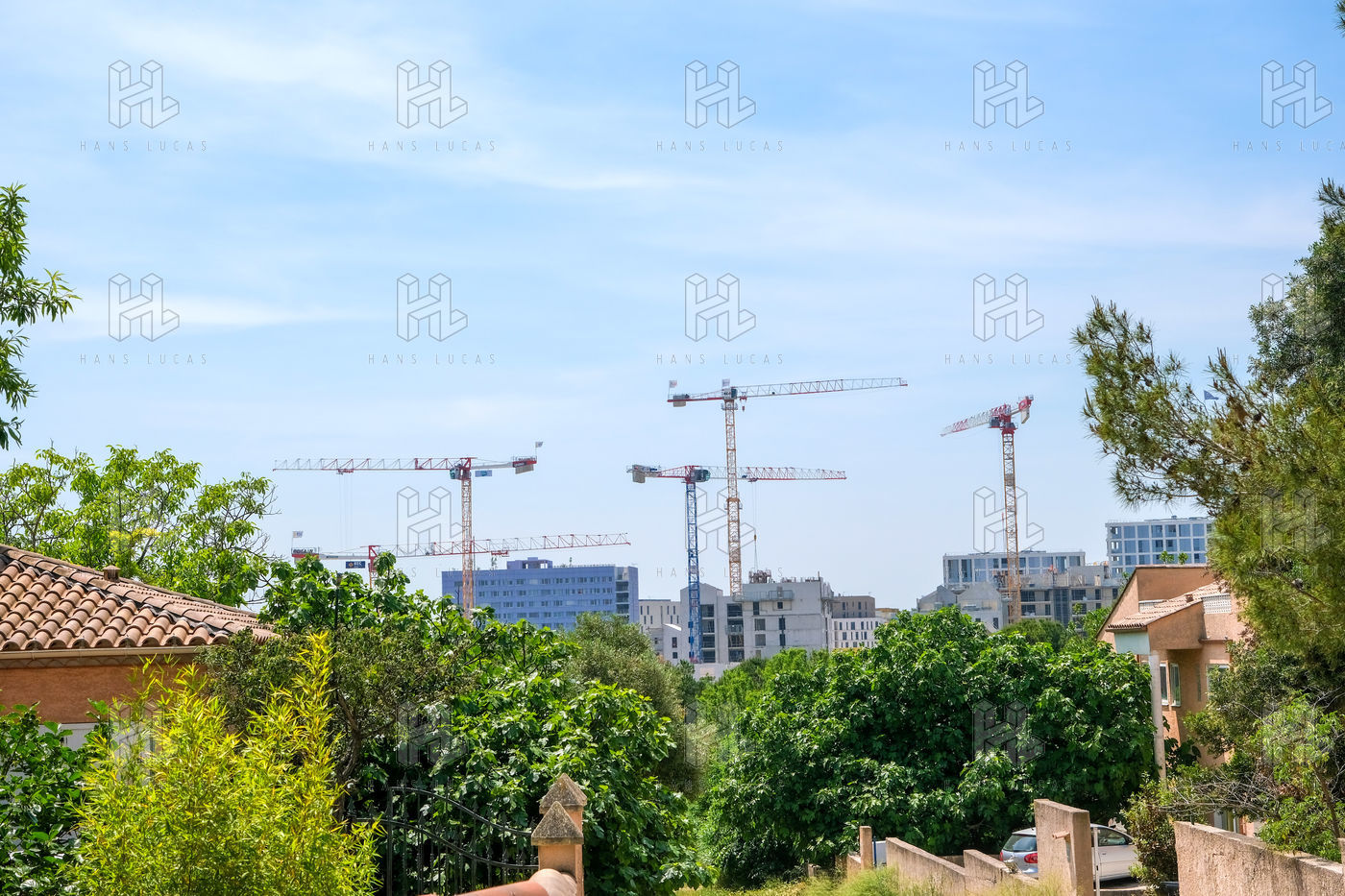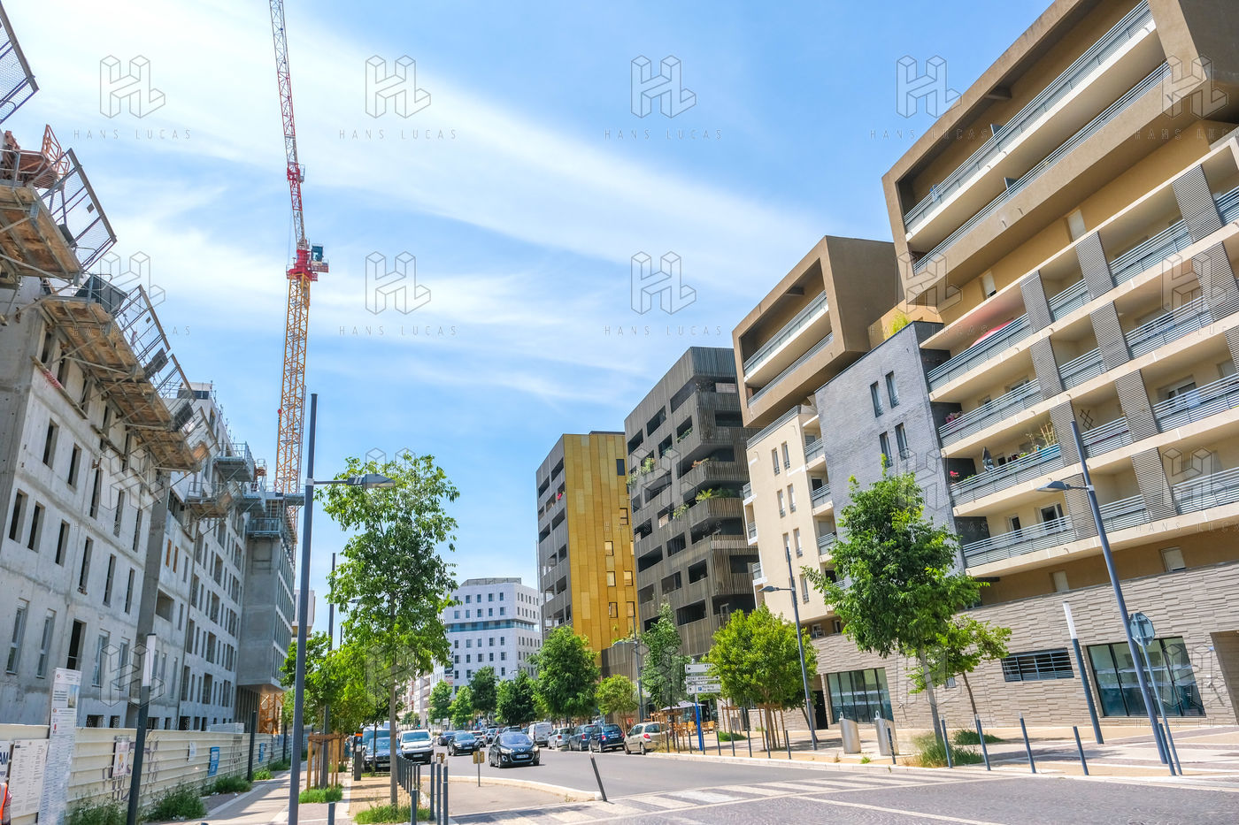 Le développement urbain de Montpellier se poursuit au sud de la Ville, en bordure d'autoroute. Les chantiers d'immeubles s'installent dans les terrains vagues, les espaces de végétation et dans les champs.