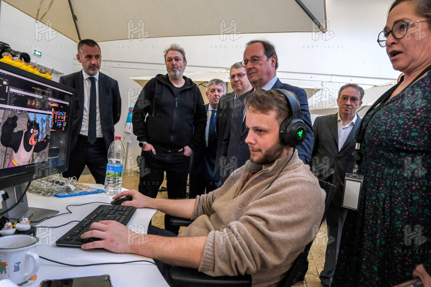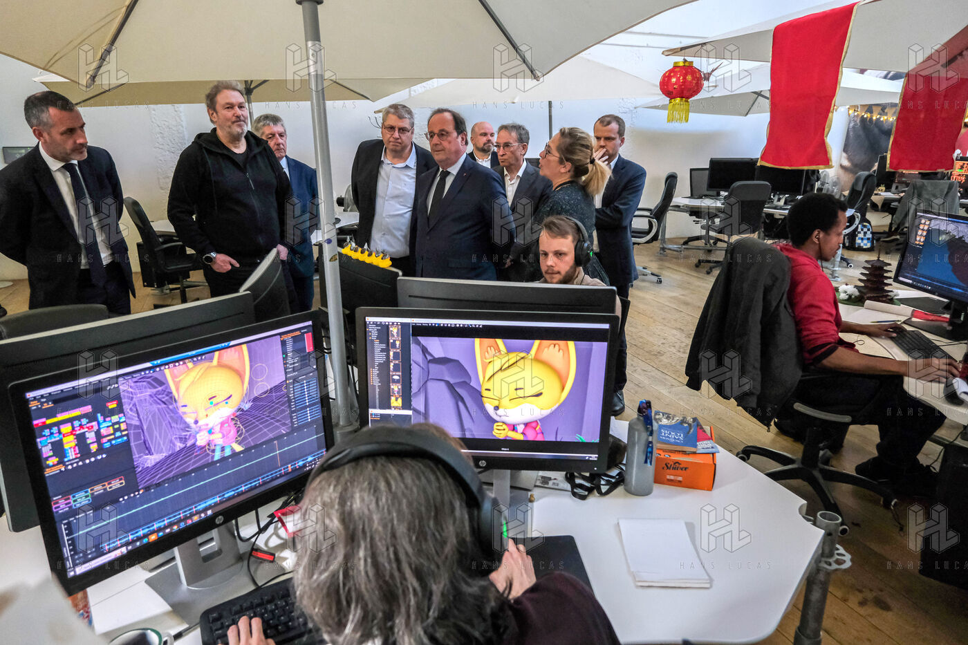 Visit of the former President of France, François Hollande, to the company TeamTO, one of the main animation studios in Europe, in Bourg-les-Valence, France, on March 18, 2024