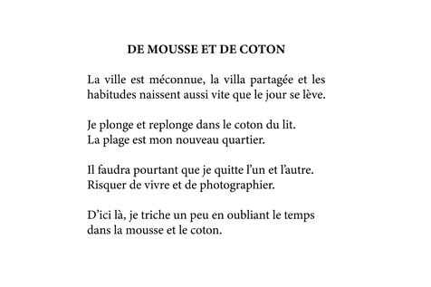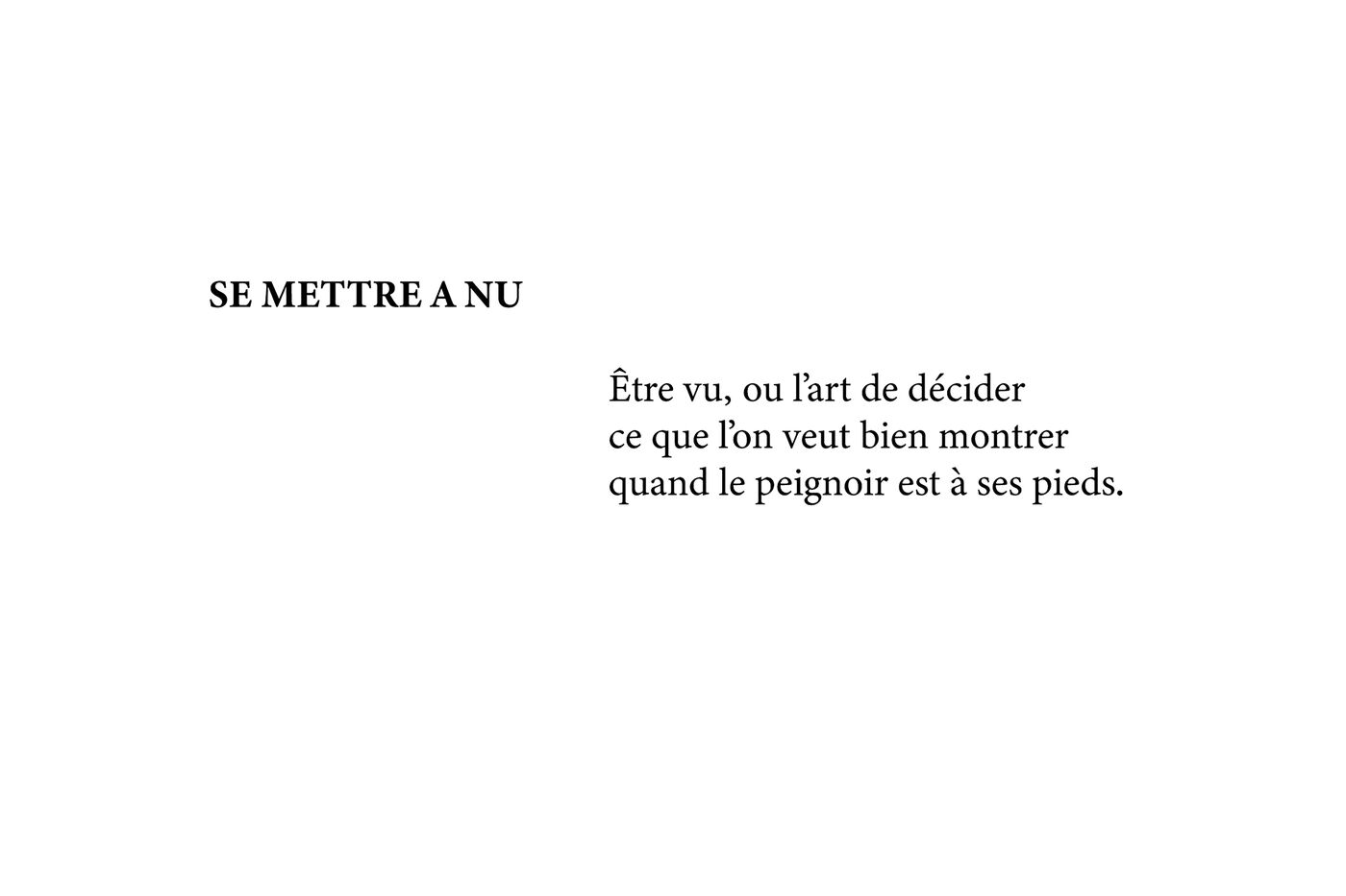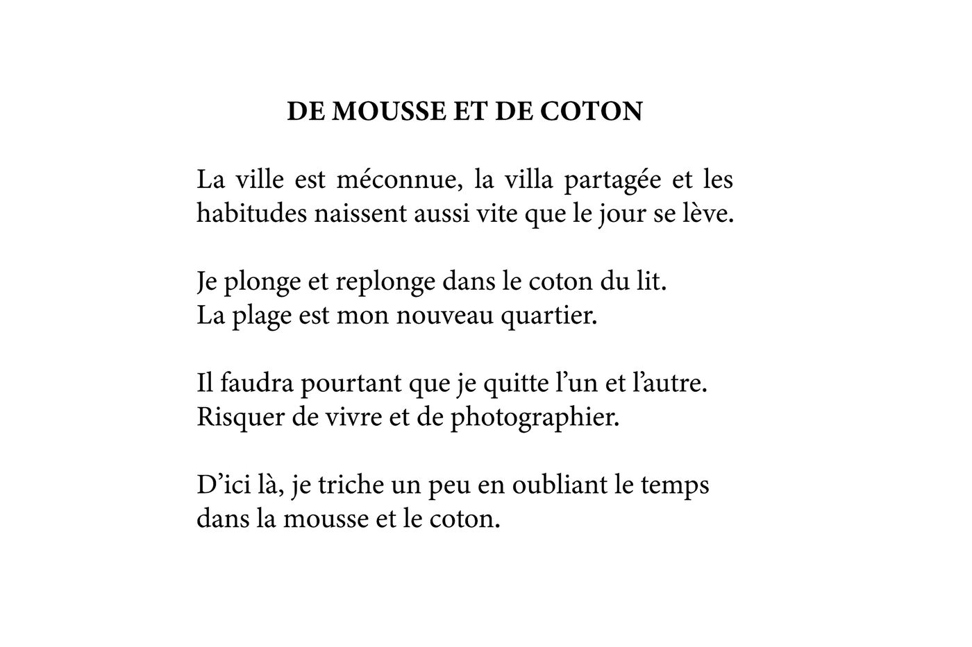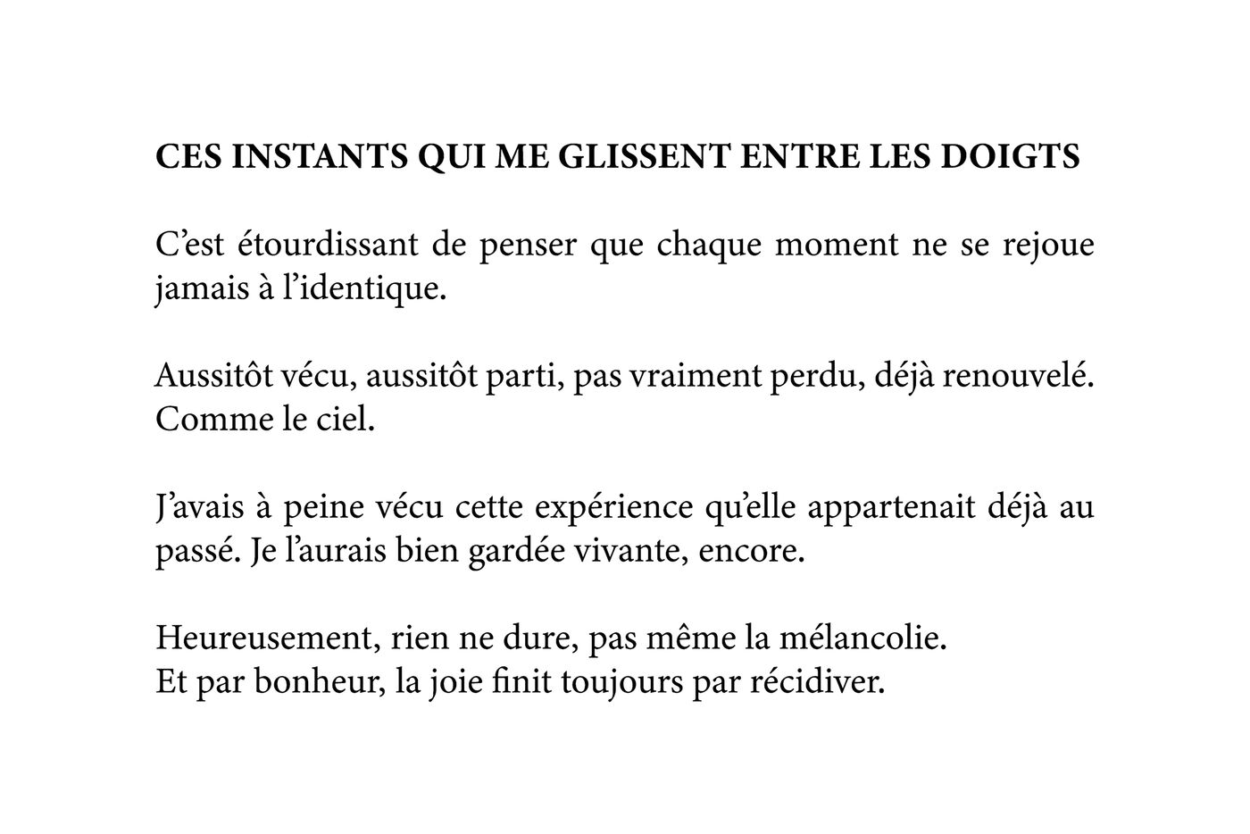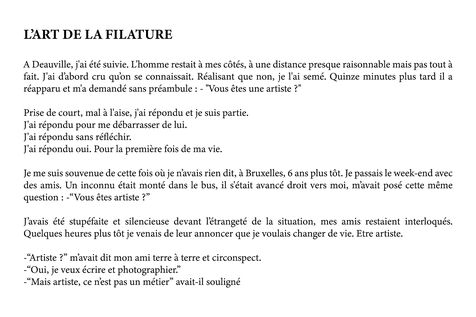 Travelling through your emotions instead of running away from them. Going around them, drawing their contours. Overcoming your doubts. Then doubting again. No longer doubting that it will last forever. Living under the same roof, sharing and wondering if that's what networking is all about. Telling yourself that it's a shame to be so big and never feel up to it. Lacking codes, training, references and yet still being there. Deciding that the result will ultimately be the path you take. The feeling that you've experienced something significant. Putting into words what is not being said. Finding yourself in exactly the right place. Seeing your project evolve and yourself with it. Ego toasting, ego dancing. The oldest of the young talents. Figuratively speaking, taking your clothes off. The encounters that touch. Ideas that are born. Getting back to basics. Photographing. Writing.