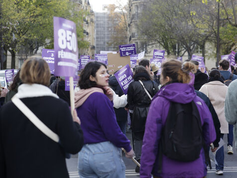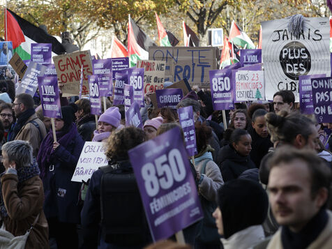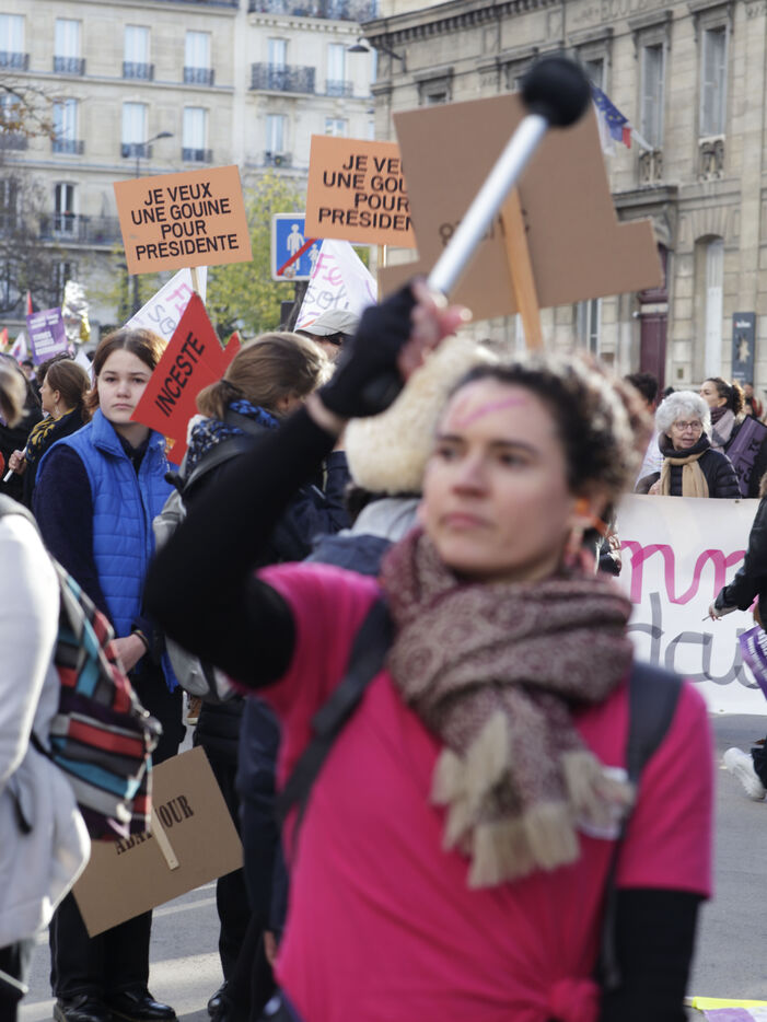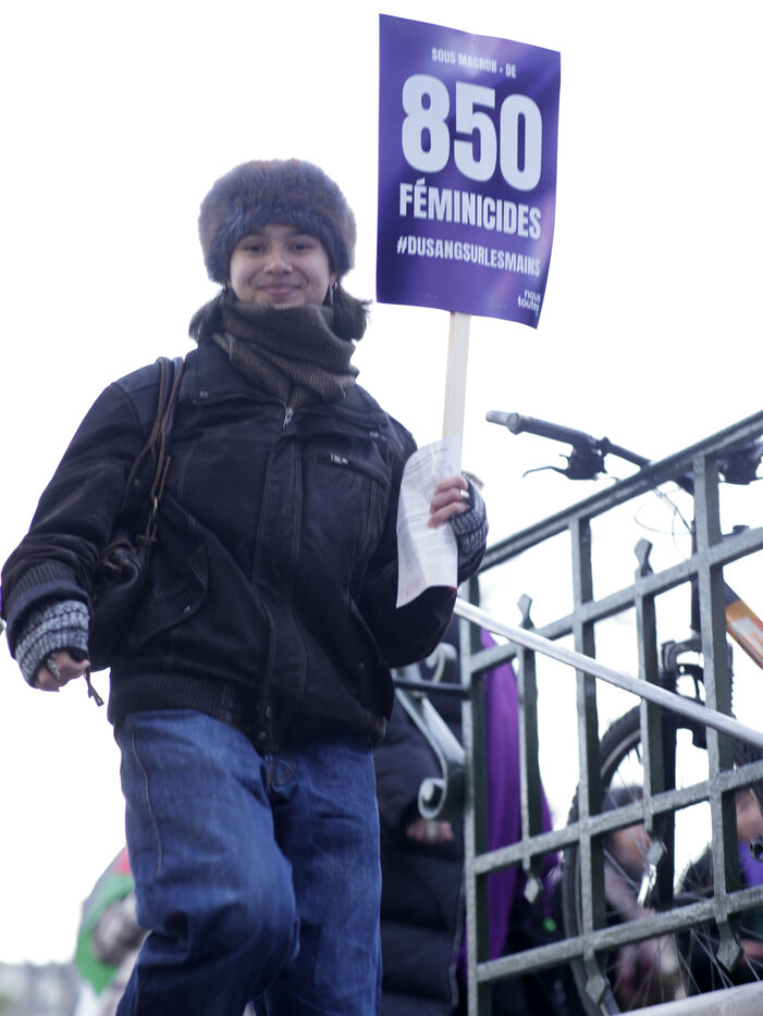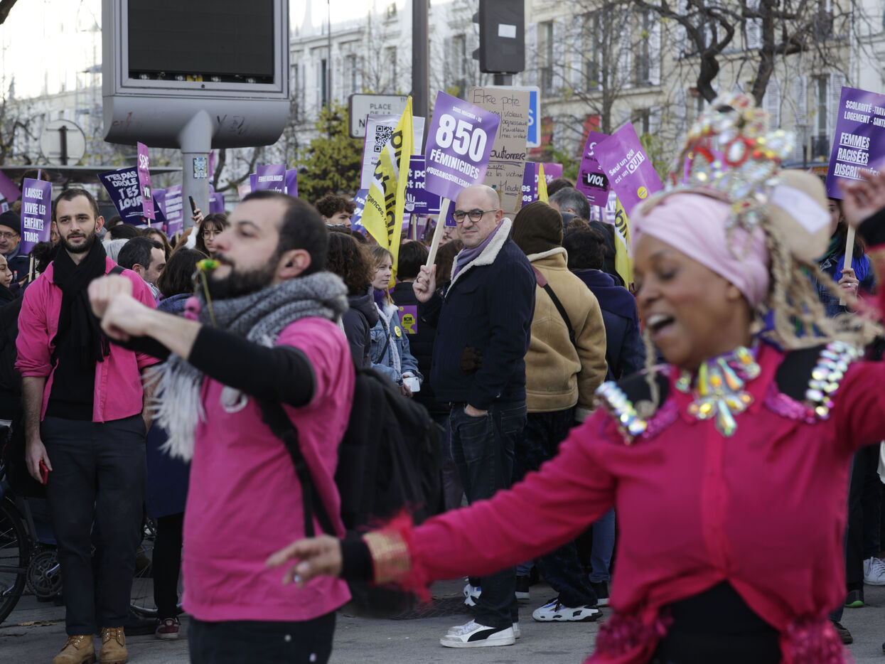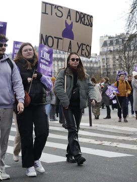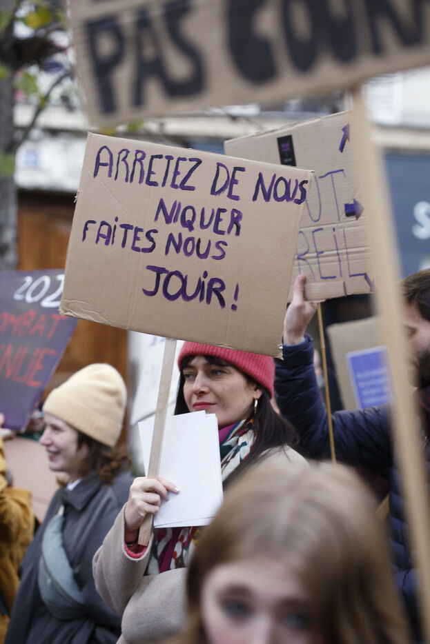 Grand march on November 25, 2023 for the international day for the eradication of violence against women. The march took place from the Place de la Nation to the Place de la République. At the head of the Parisian procession marched the families of feminicide victims, with portraits of their missing loved ones. Everywhere, the color purple dominated the procession.