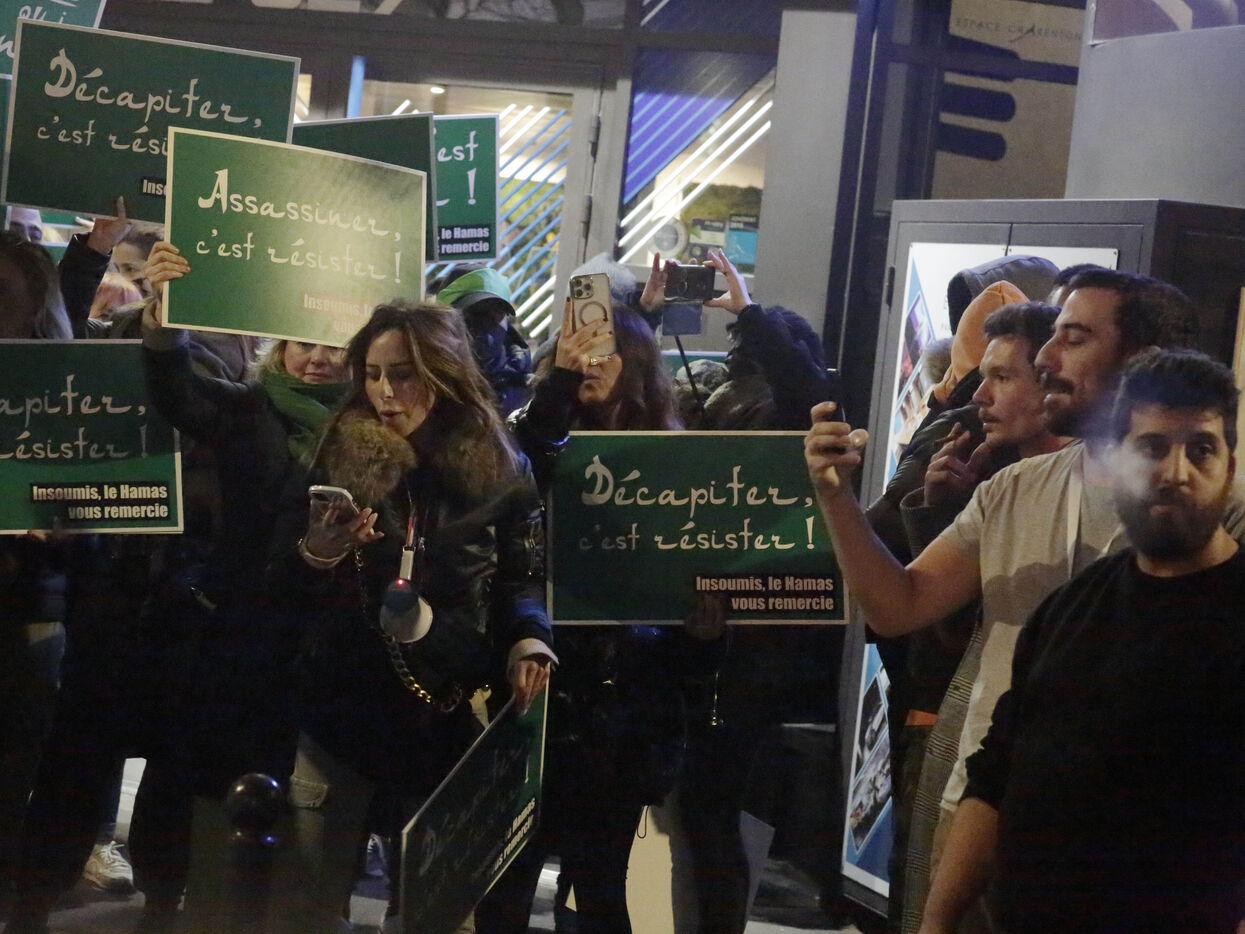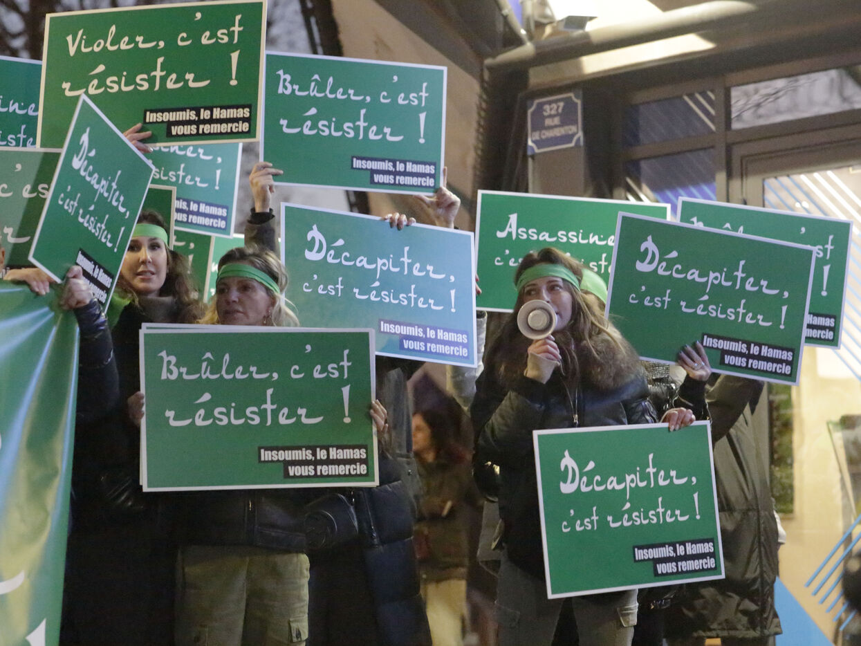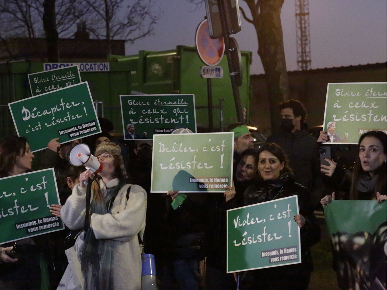 The "Nous Vivrons" collective turned out in front of the building where La France Insoumise was meeting, to challenge its stance on Hamas. Participants wore green headbands in reference to Hamas fighters, and held up placards with slogans such as "To burn is to resist" and "To murder is to resist" to denounce Jean-Luc Mélenchon's ambiguous stance on this organization.
