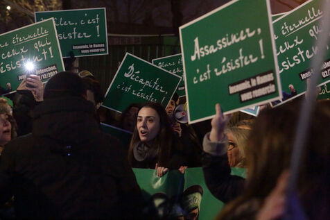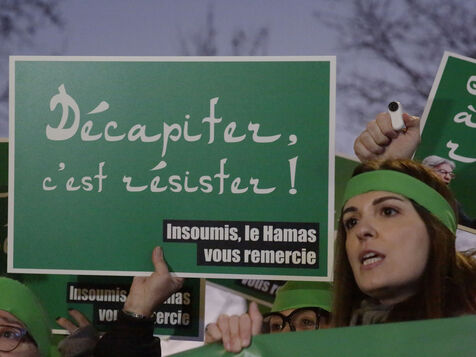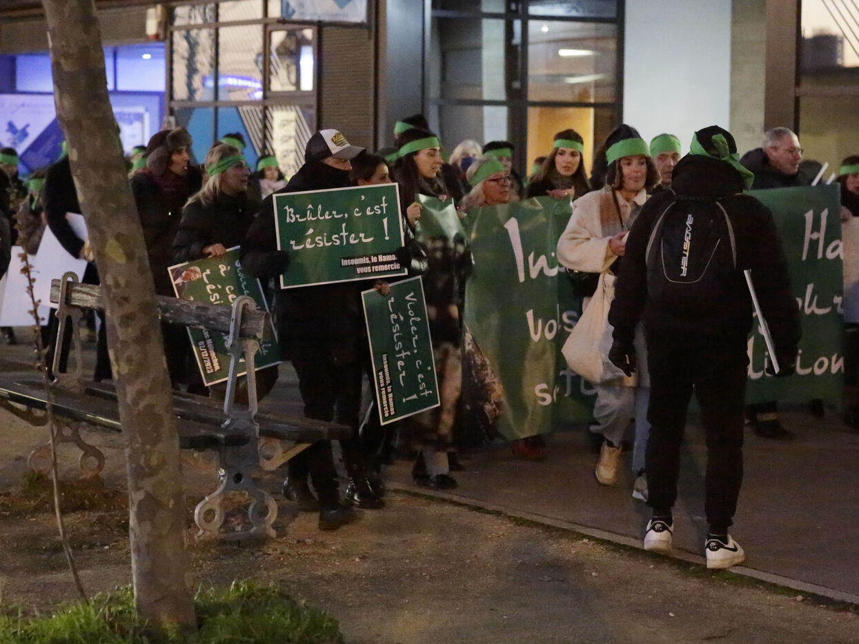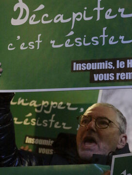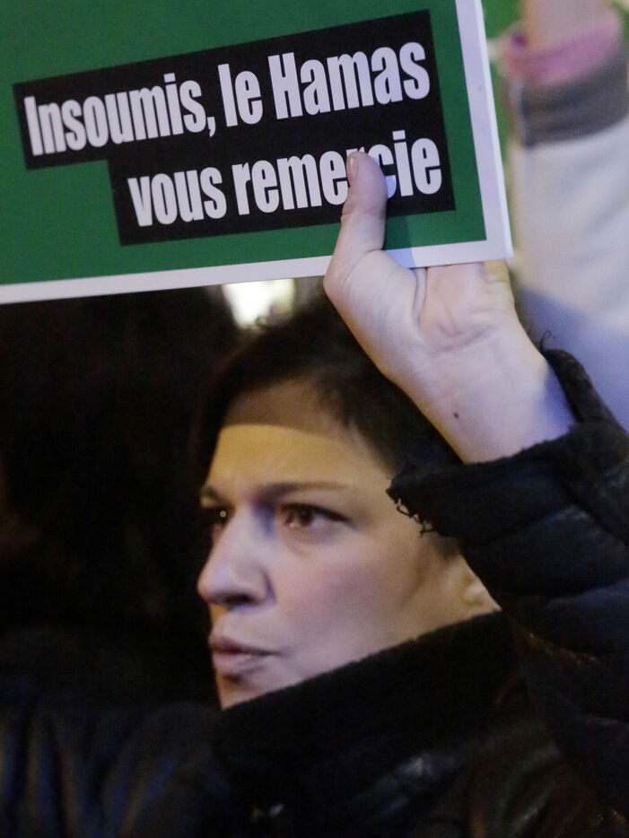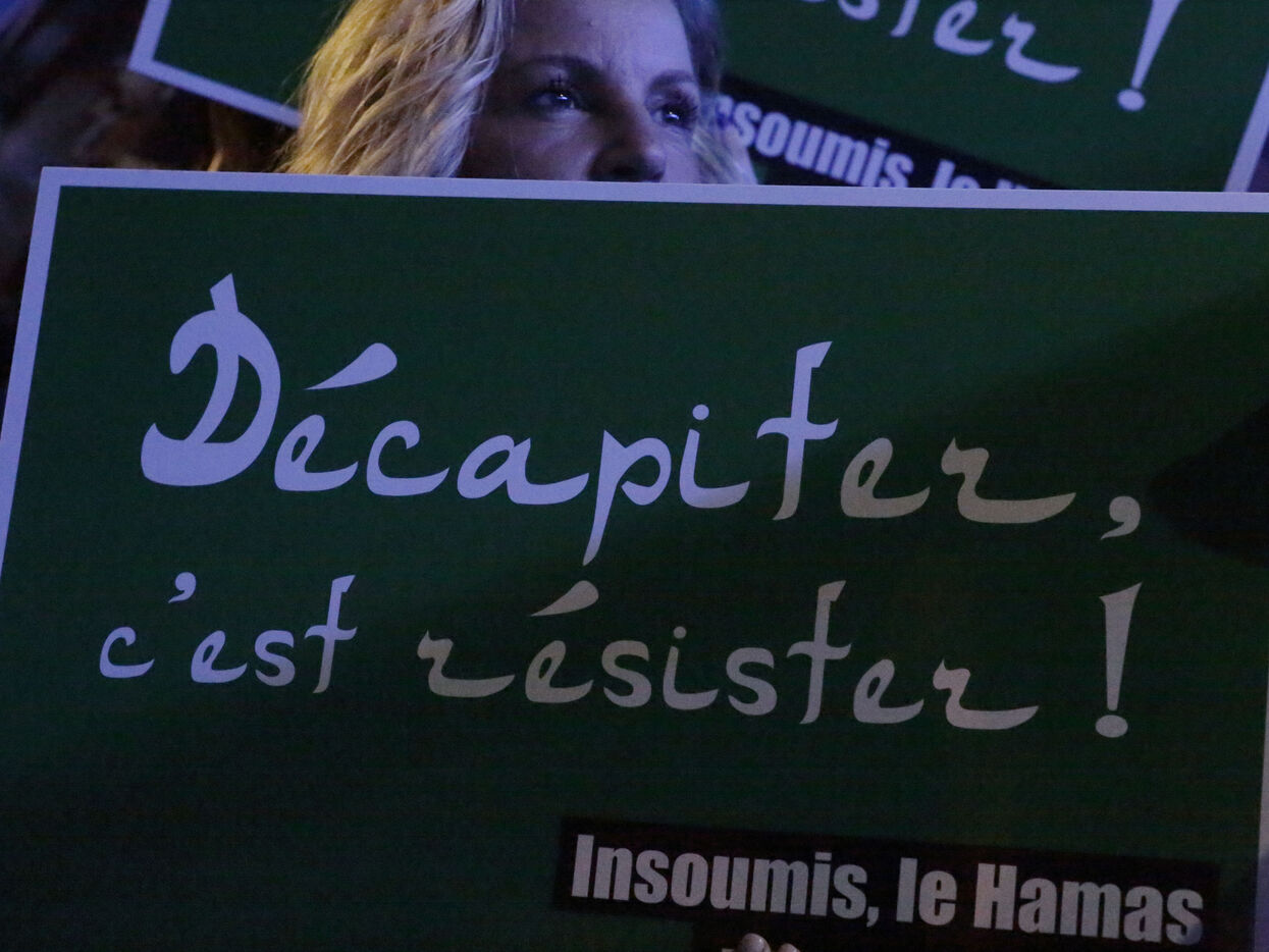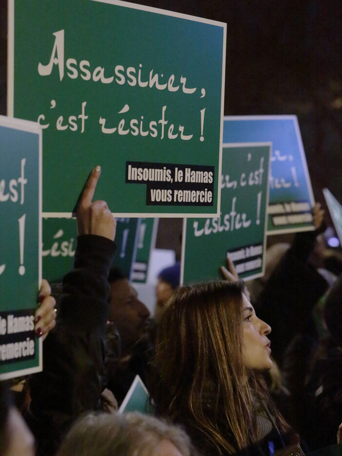 The "Nous Vivrons" collective turned out in front of the building where La France Insoumise was meeting, to challenge its stance on Hamas. Participants wore green headbands in reference to Hamas fighters, and held up placards with slogans such as "To burn is to resist" and "To murder is to resist" to denounce Jean-Luc Mélenchon's ambiguous stance on this organization.