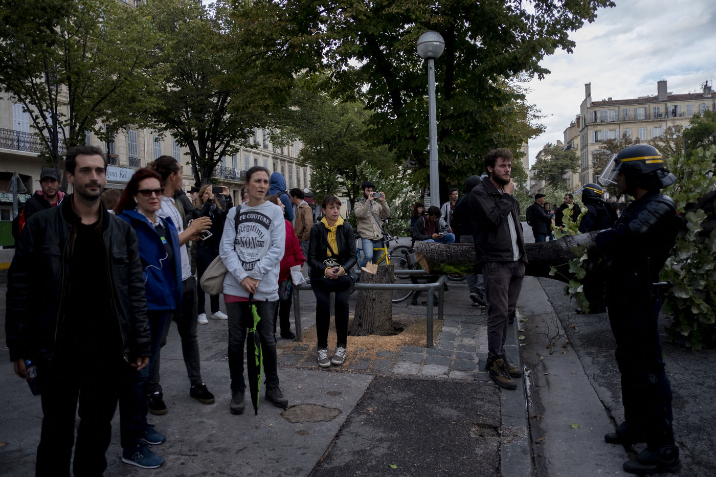 Le 16 octobre à Marseille, l'abattage des arbres qui entoure la place Jean Jaurès, appelé communément la plaine, a débuté. En quelques heures, les ouvriers se sont afférés à couper les arbres, malgré les tentatives des habitants de la Plaine pour ralentir leurs destructions. Certains se sont hissé dans les arbres alors que d'autres tentent tant bien que mal à ralentir les travaux. La tension est palpable. Depuis près d'une semaine, des affrontements éclatent entre force de l'ordre et les défenseurs de la plaine qui refusent d'accepter le plan de rénovation de la place qui n'a pas tenu compte de l'avis des habitants et commerçants. Sans réelle concertation, ce projet de réaménagement est appelé à devenir une zone à défendre. Alors que la coupe des arbres semblent imminentes, la tristesse des défenseurs de la plaine est sur les visages.
