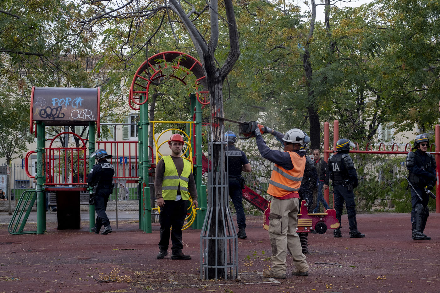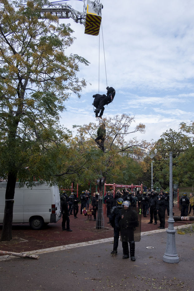 On October 16 in Marseille, the felling of the trees surrounding Place Jean Jaurès, commonly known as the plain, began. Within a few hours, the workers were busy cutting down the trees, despite attempts by the inhabitants of the Plains to slow down their destruction. Some have climbed into the trees while others are trying to slow down the work as best they can. The tension is palpable. For nearly a week, clashes have been raging between the police and the defenders of the plain who refuse to accept the plan to renovate the square, which did not take into account the opinions of the inhabitants and traders. Without real consultation, this redevelopment project is destined to become an area to be defended. As the cutting of trees seems imminent, the sadness of the defenders of the plain is on their faces.