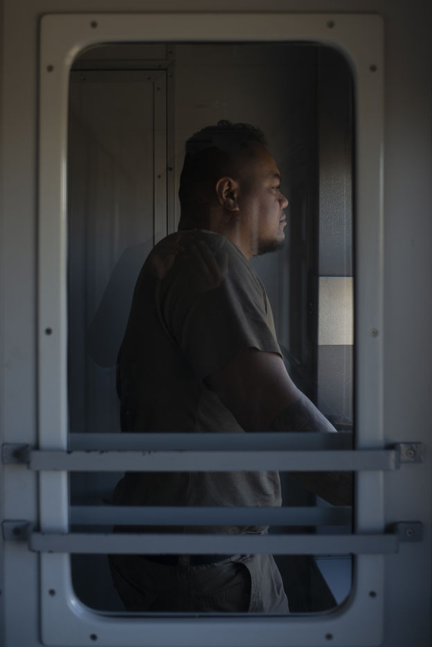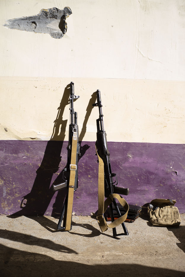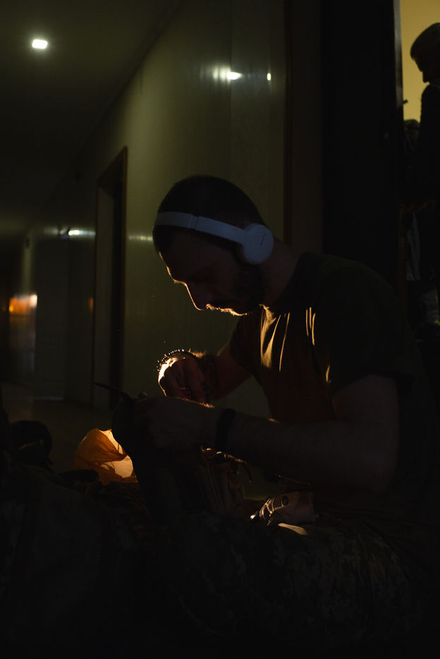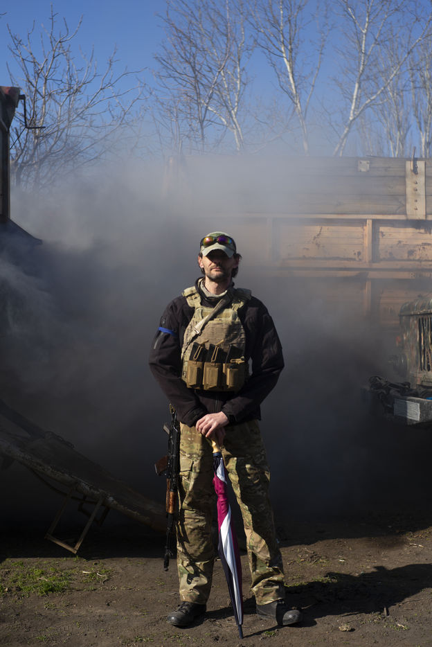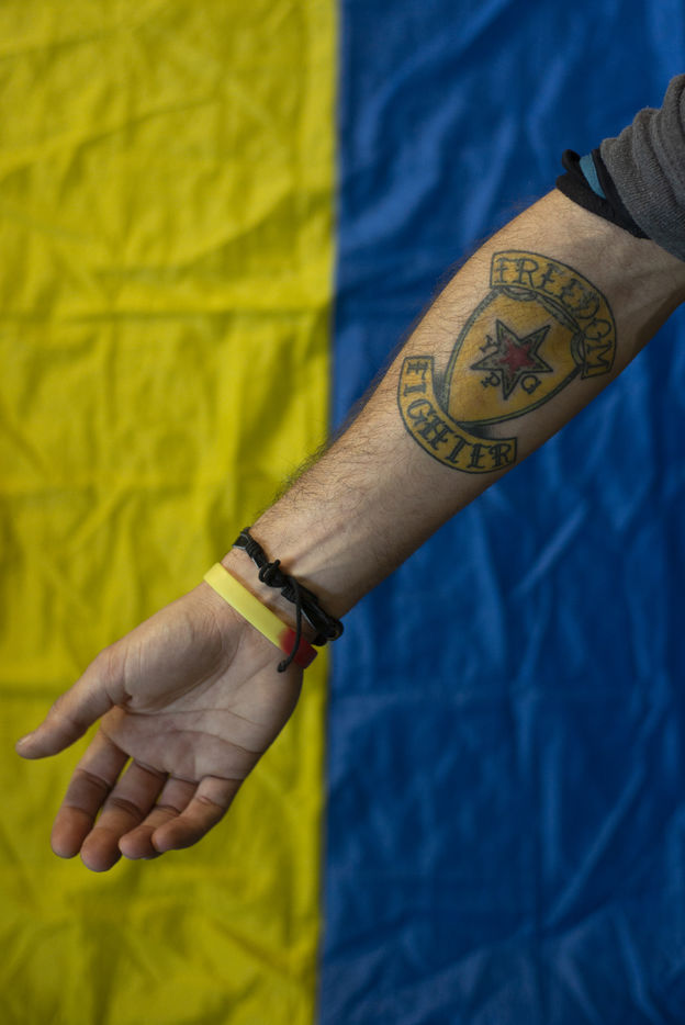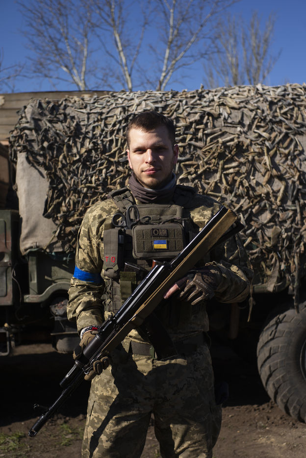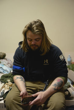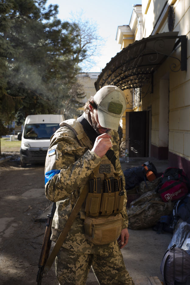 Mars 2022 a Odessa, Ukraine. Portrait des volontaires internationaux qui ont decide de rejoindre la legion ukrainienne. Ils viennent de France, Angleterre, Suede, USA. Benevoles et volontaires, ils ont decide de se battre contre les forces russes qui ont envahie l Ukraine le 24 fevrier 2022. Depuis une semaine a Lviv, ils ont decide de rejoindre le front et recoivent leur equipement militaire dans une base d Odessa. Freedom Fighter en Irak pour la plus part, ils beneficient d un contrat sans duree determine et choisissent les missions auxquelles ils participent.