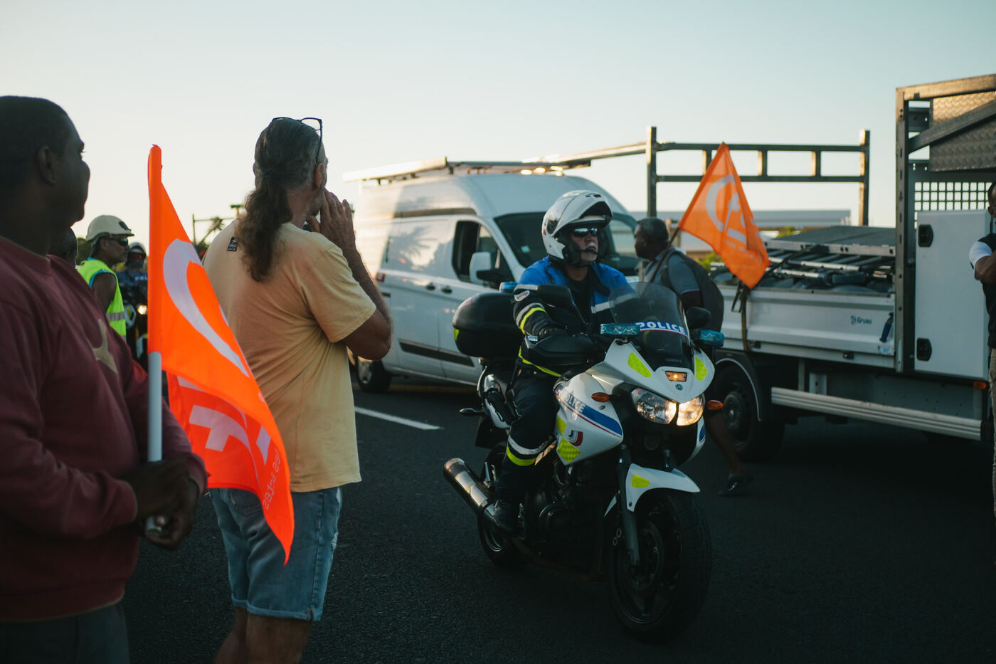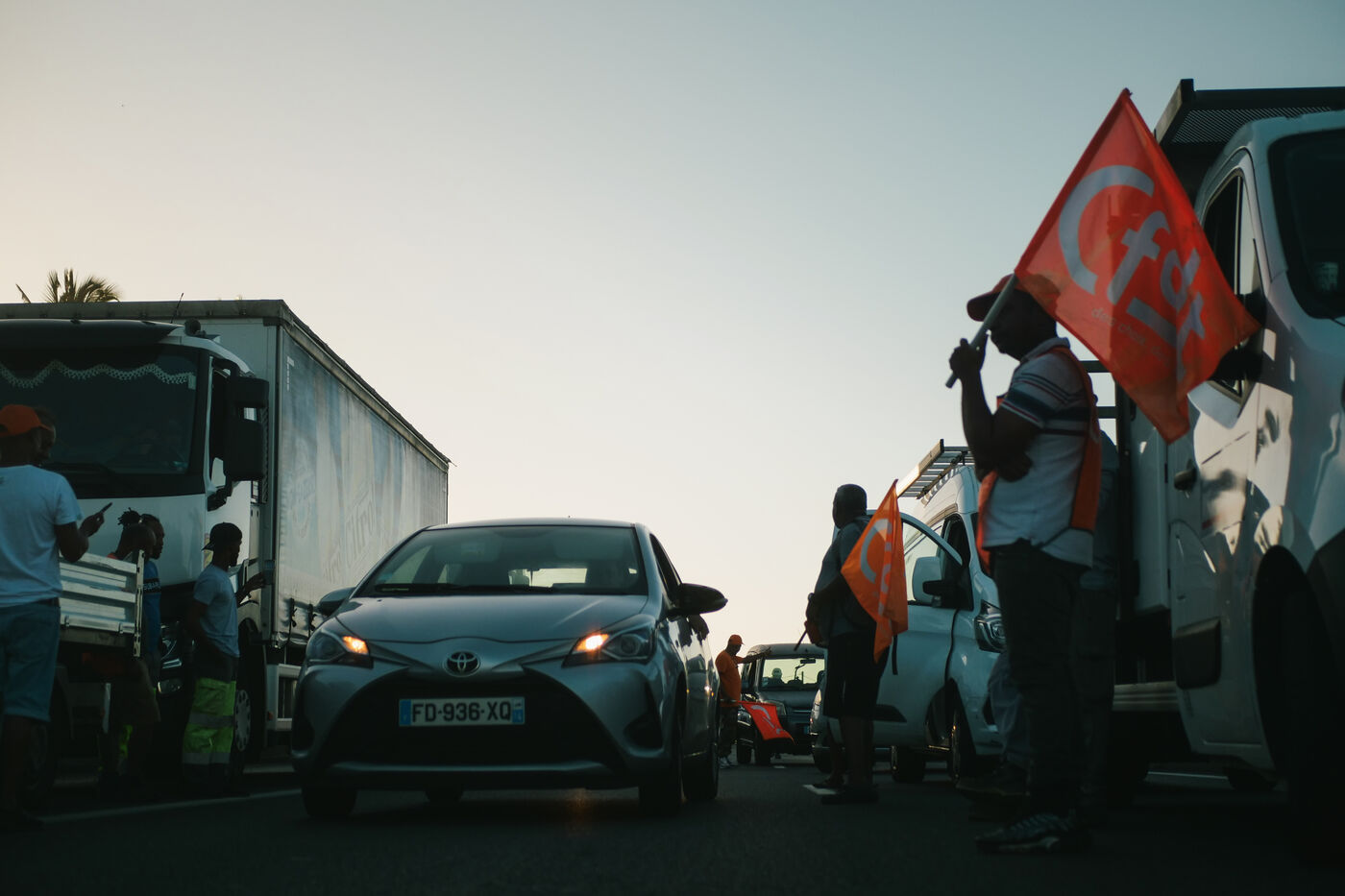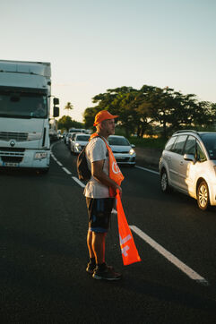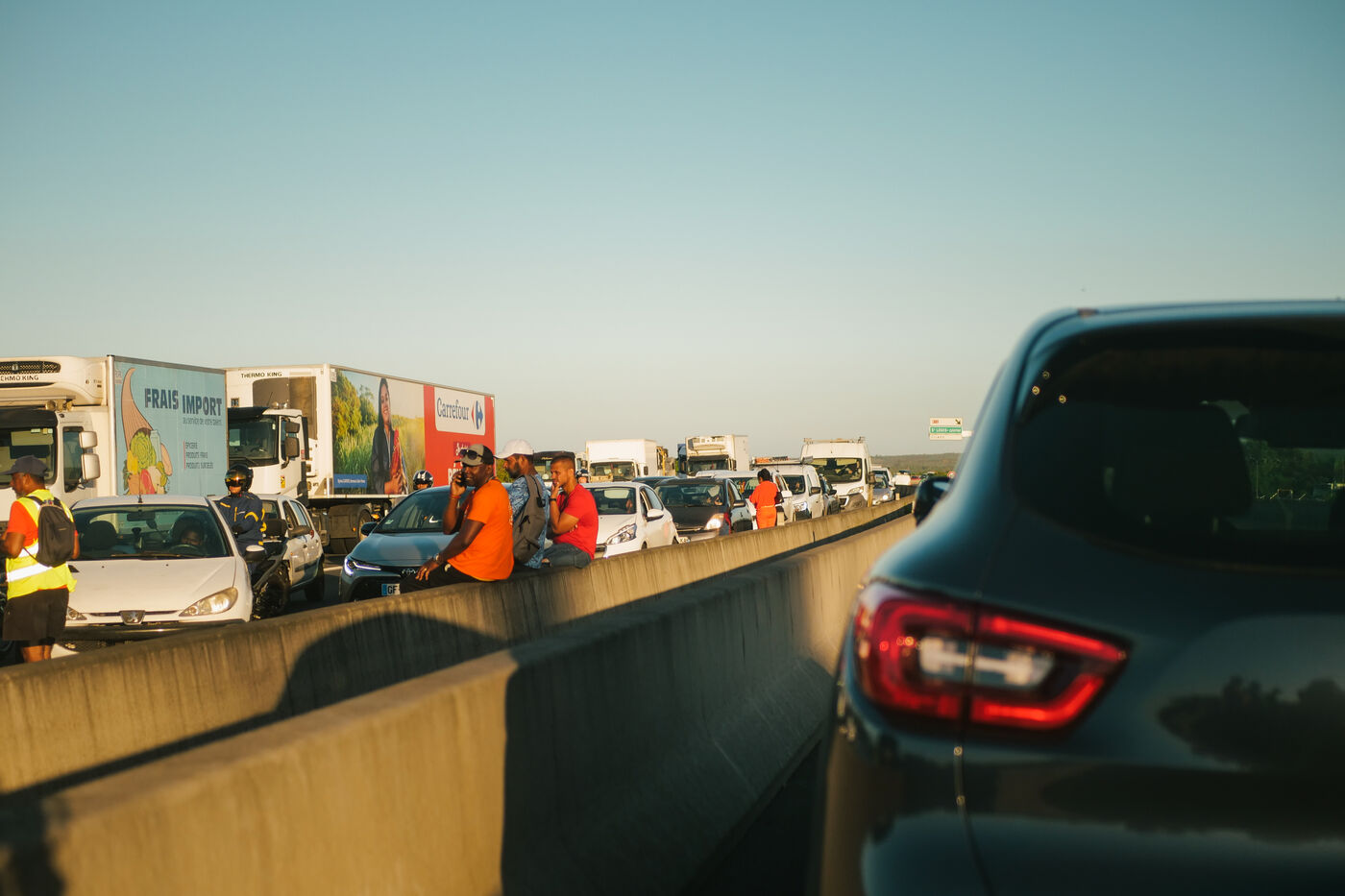 New road blockade in Saint Pierre, in the south of Reunion Island, during the 9th day of national mobilization to protest against the pension reform. This reform was definitively adopted in Parliament on March 20, 2023, after the Borne government used the 49.3 article. Emmanuel Macron spoke publicly on March 22, the day before this 9th day of mobilization. Here, in Pierrefonds (Saint Pierre), several members of the CFDT decided to block the main road axis, from dawn. Traffic jams were formed very quickly but motorists showed understanding. No tension was observed.